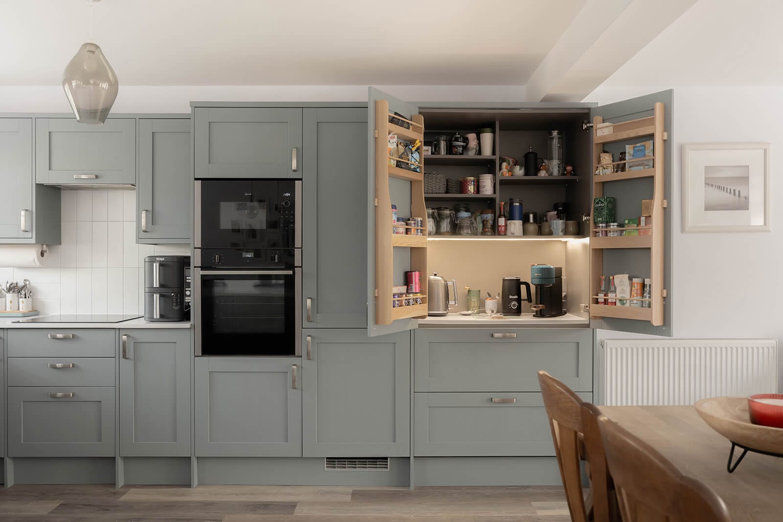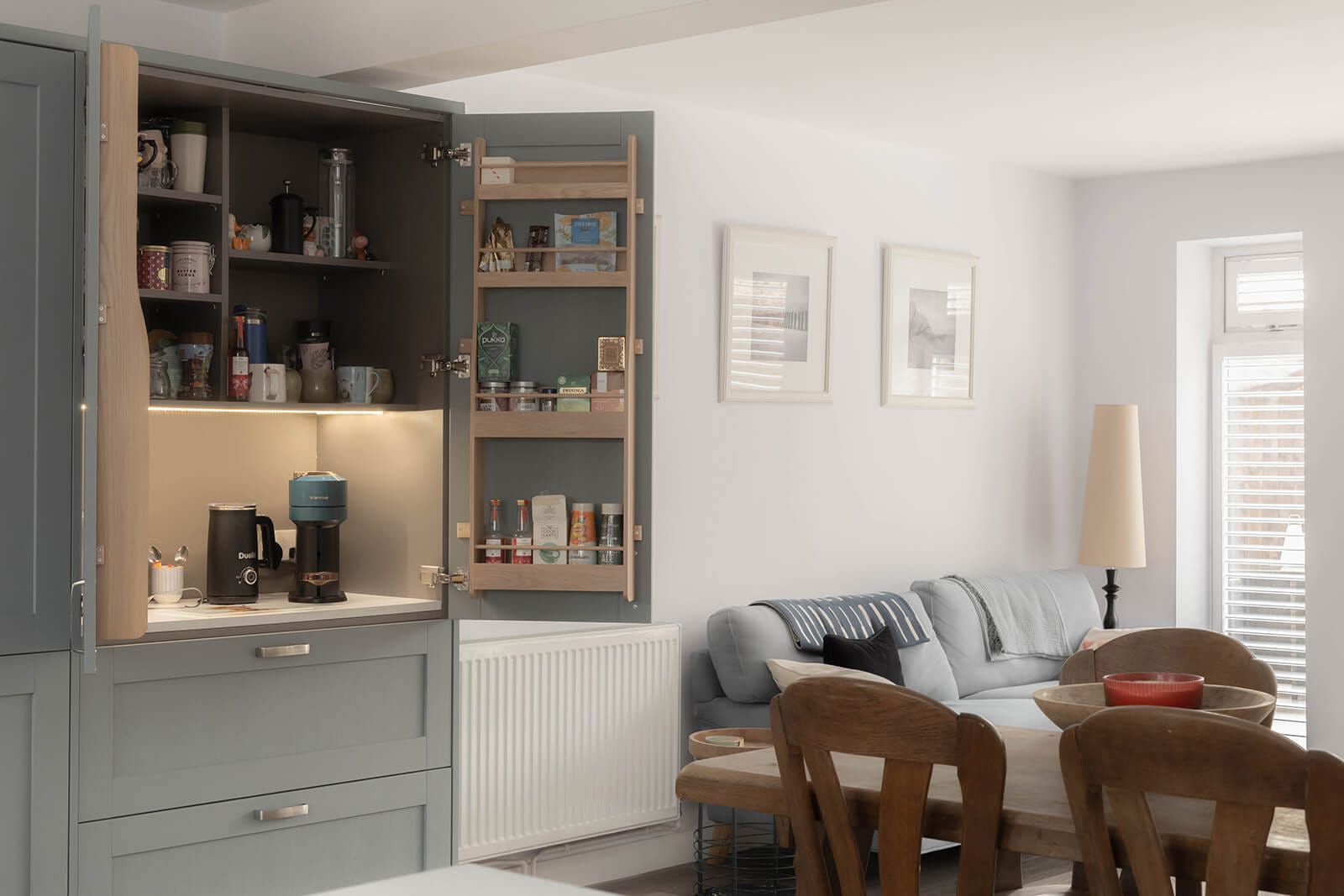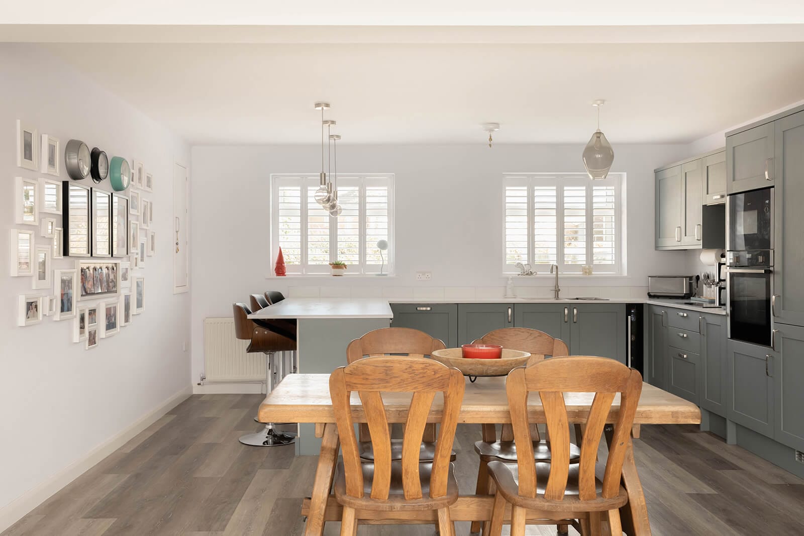 A strong sense of space is evident from the moment you step inside. The generous entrance hall sets the tone, leading first to a large sitting room on the left, where an impressive bay window with shutters draws in natural light. Beyond, occupying the full depth of the house, is a striking open-plan kitchen, dining and family room. With glazed double doors opening onto the rear garden, it is a superb social space, equally suited to everyday living and entertaining. Contemporary cabinetry, crisp white worktops and a breakfast bar define the kitchen, complemented by a well-considered coffee station with integral lighting.