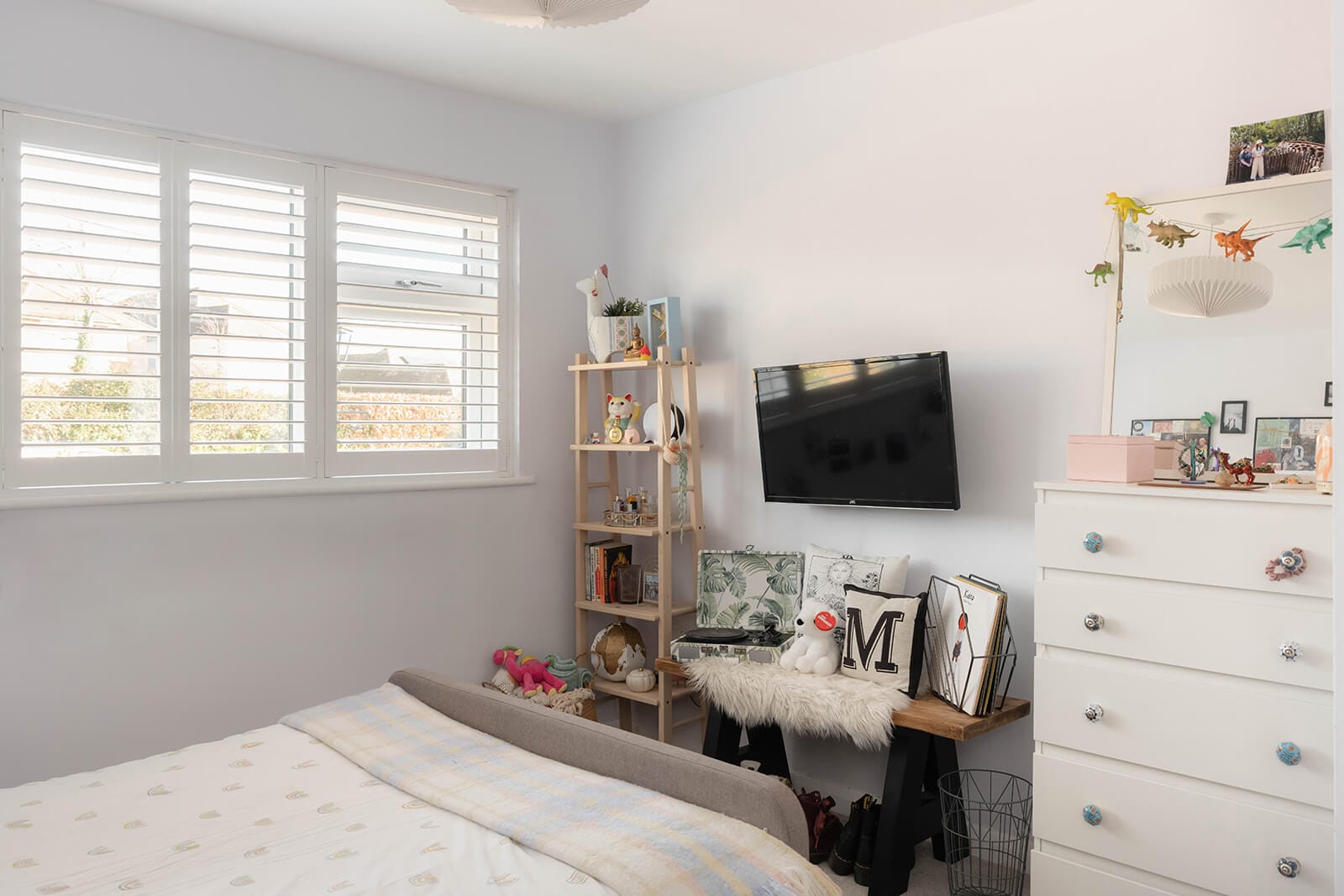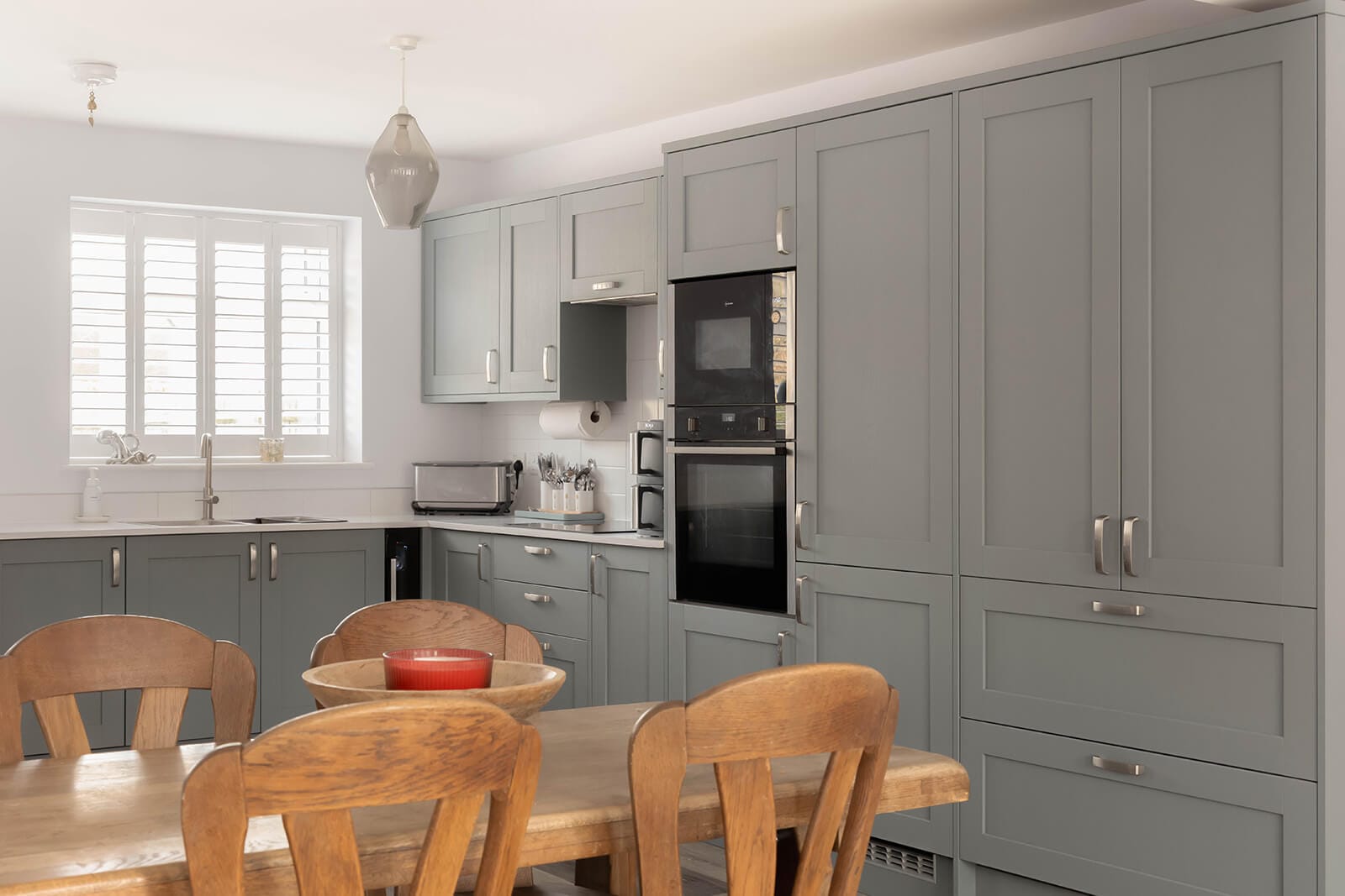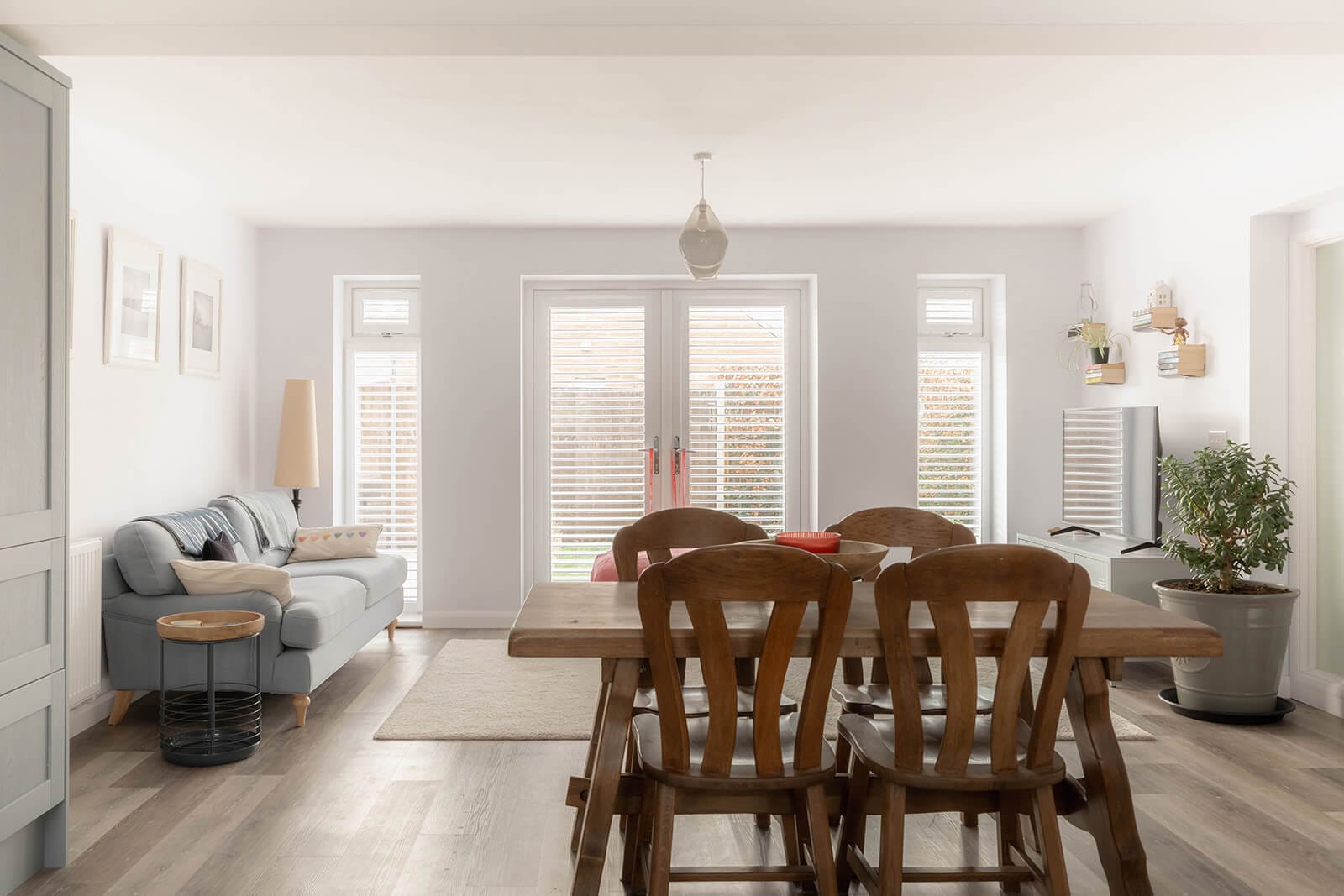 A strong sense of space is evident from the moment you step inside. The generous entrance hall sets the tone, leading first to a large sitting room on the left, where an impressive bay window with shutters draws in natural light. Beyond, occupying the full depth of the house, is a striking open-plan kitchen, dining and family room. With glazed double doors opening onto the rear garden, it is a superb social space, equally suited to everyday living and entertaining. Contemporary cabinetry, crisp white worktops and a breakfast bar define the kitchen, complemented by a well-considered coffee station with integral lighting.