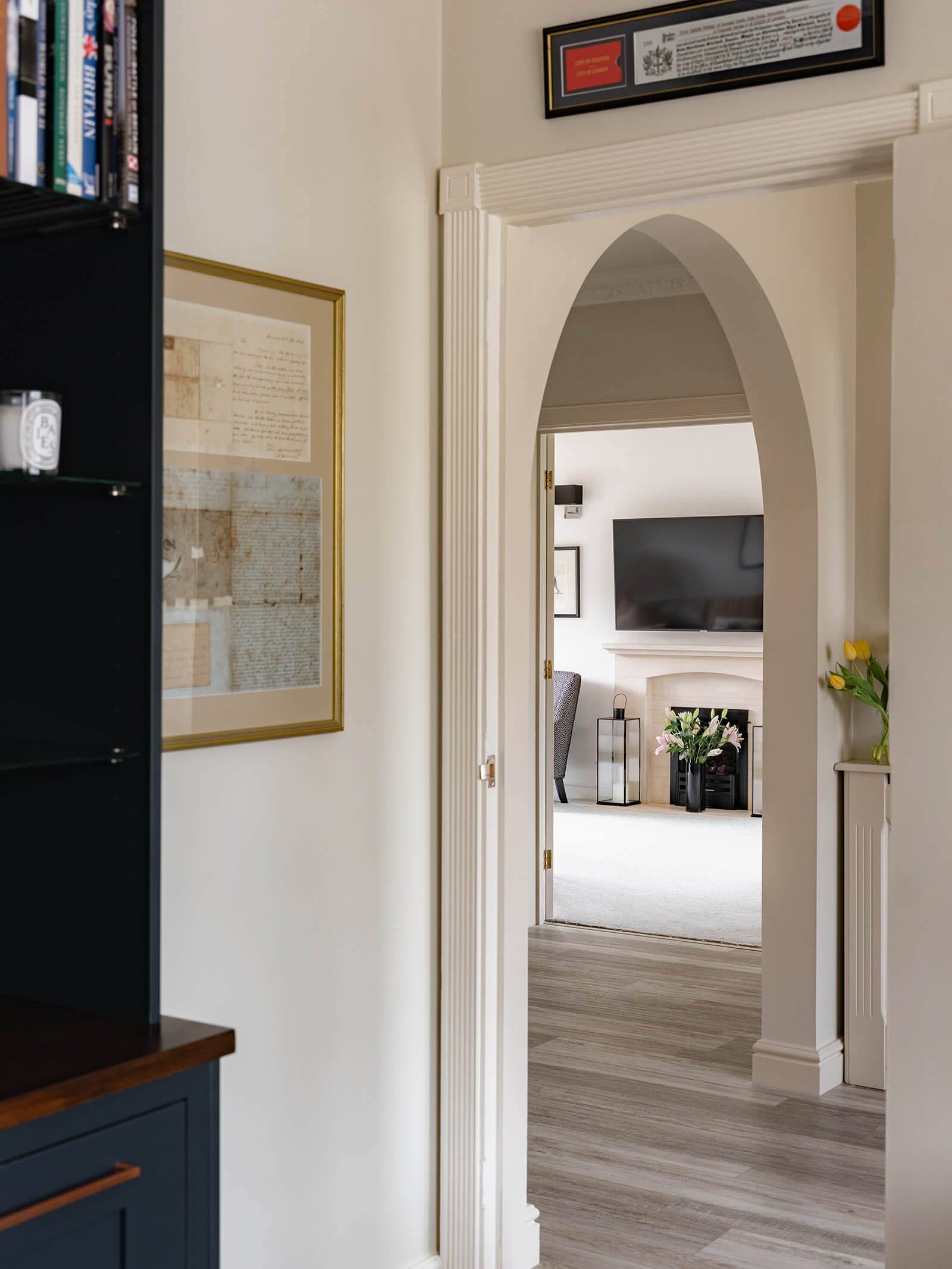 Inside, a spacious hallway with ample storage and Amtico flooring sets the tone and flows seamlessly into four separate reception rooms. To the front, the sitting room and study sit either side of the hall. The study is fitted with bespoke ink-blue cabinetry, while the sitting room is triple-aspect, including large French doors opening to the garden and a gas fireplace providing a calm, modern focal point.