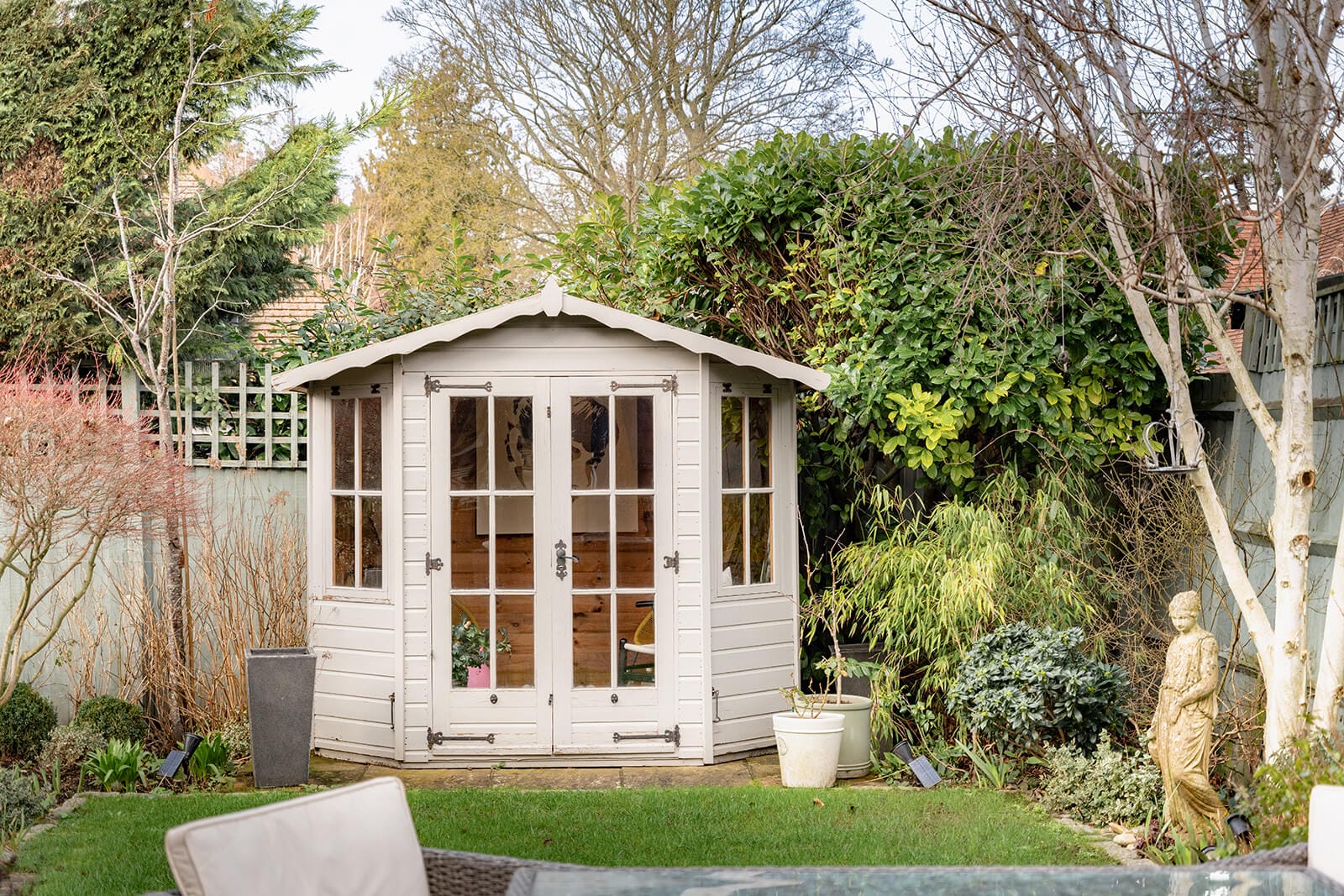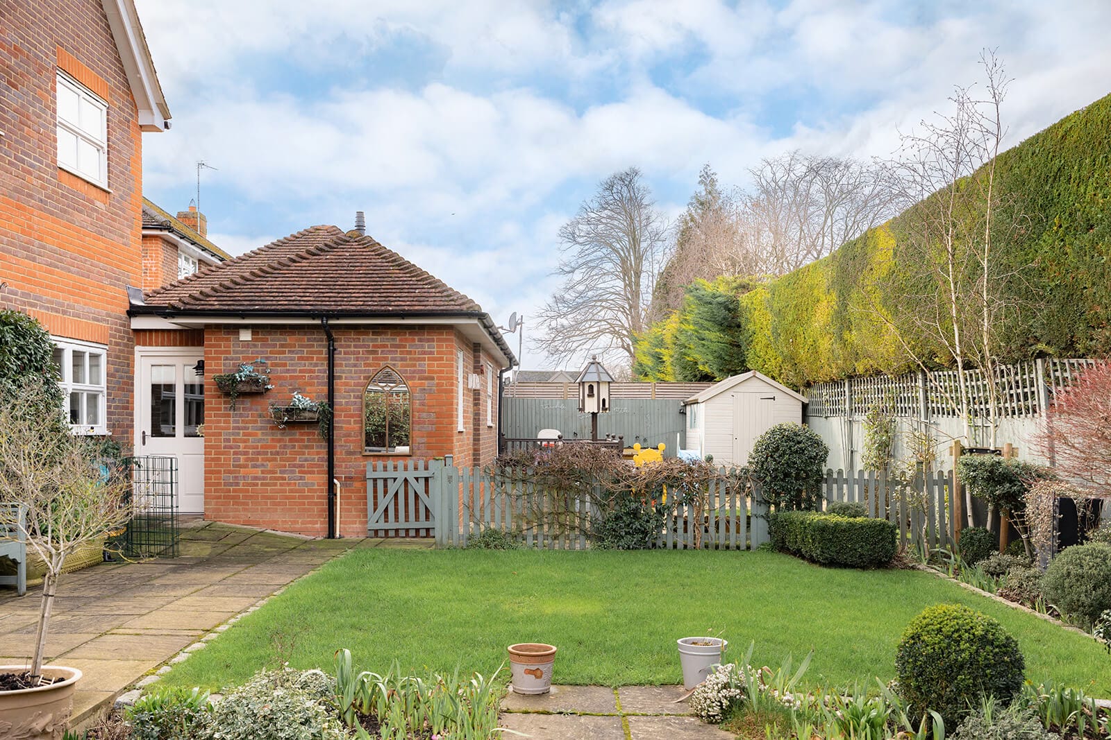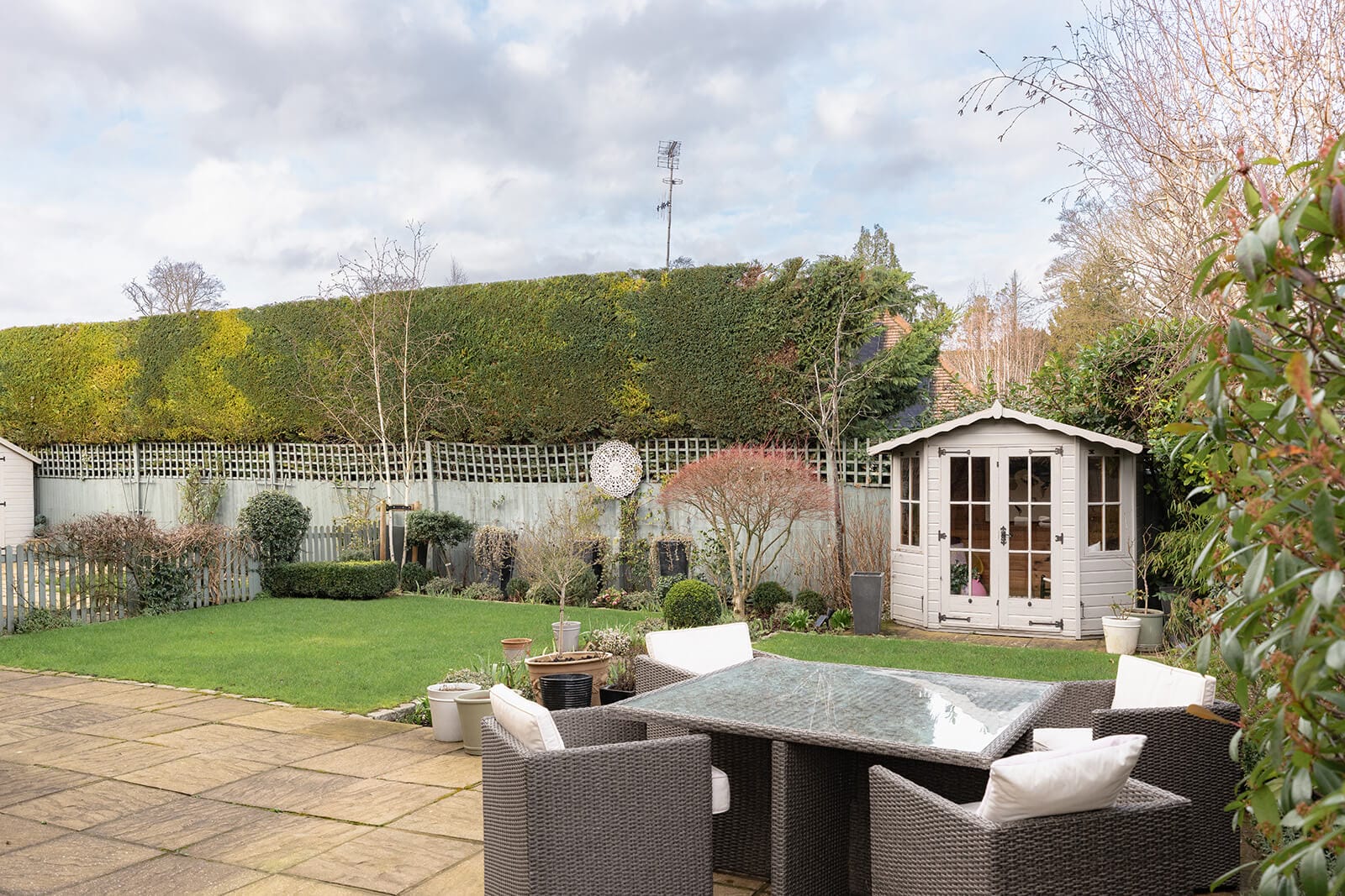 Outside, the rear garden is laid predominantly to lawn with a generous patio for entertaining and al fresco dining. Mature shrub borders, a pair of birch trees, two sheds, a summer house and a children’s play area combine utility with a sense of harmony. To the front, a block-paved driveway provides parking for multiple vehicles, complemented by a landscaped garden and additional storage shed.
