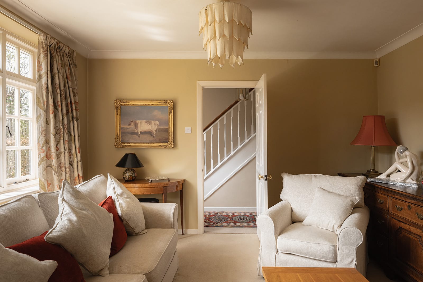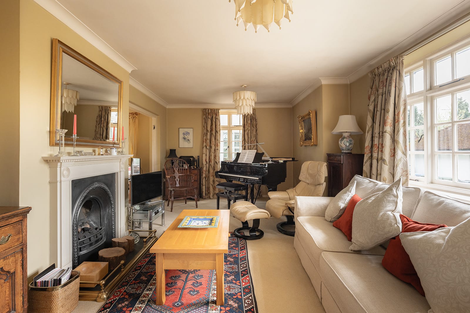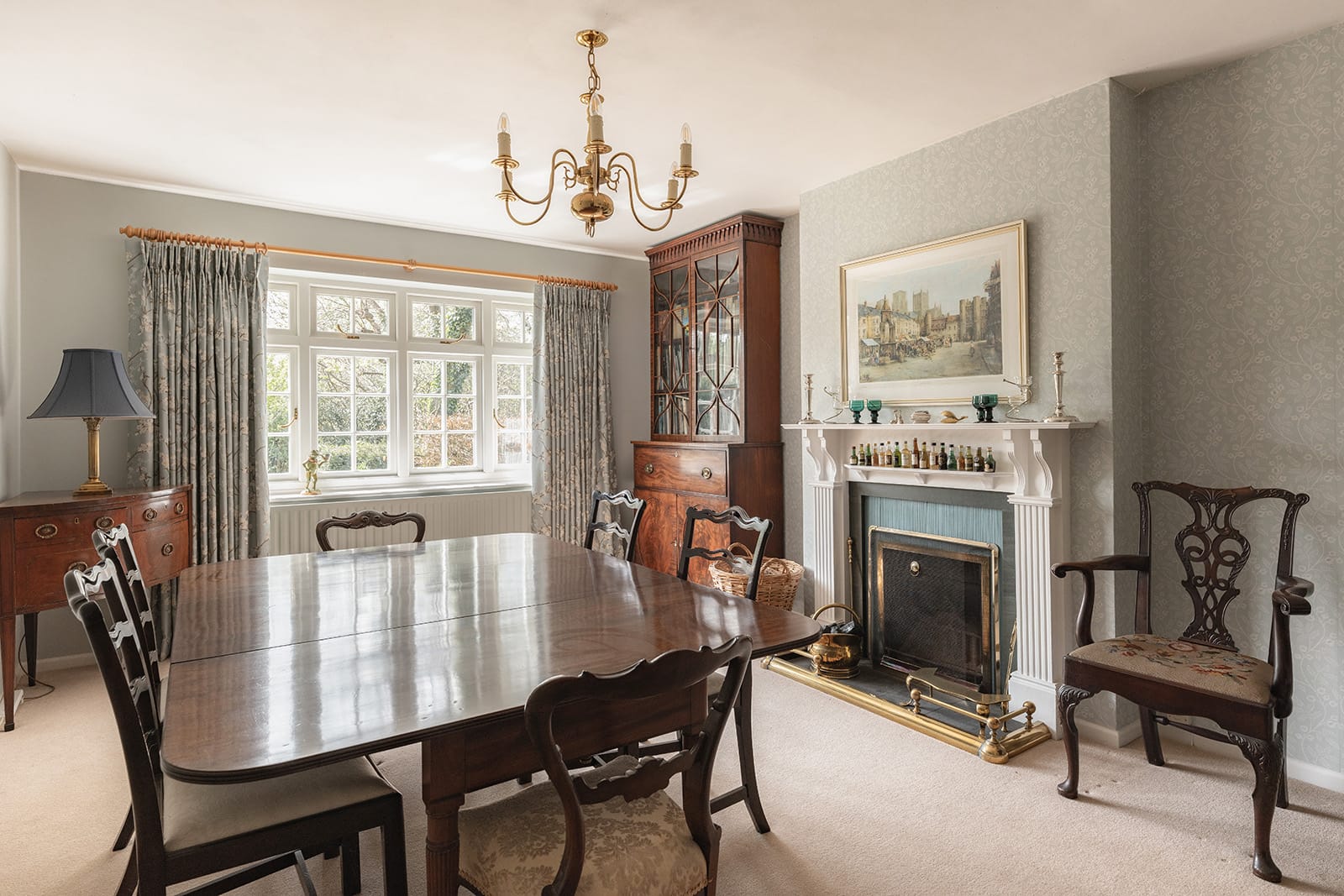 Inside, the architecture unfolds with a calm and classical feel. The hallway introduces a suite of reception rooms designed with versatility in mind. The dual-aspect sitting room is a generous space, large enough to accommodate a baby grand piano to one end, while a fireplace creates a natural focal point. The second reception room – a formal dining room – offers excellent proportions and a sense of occasion.