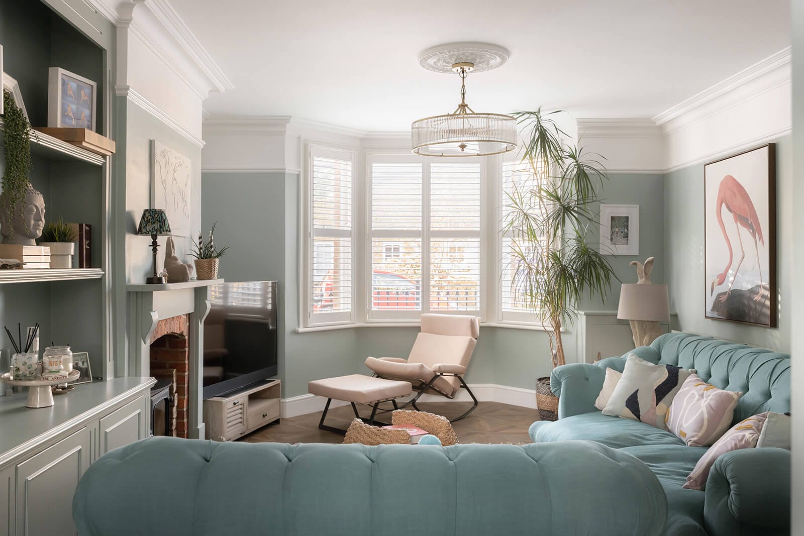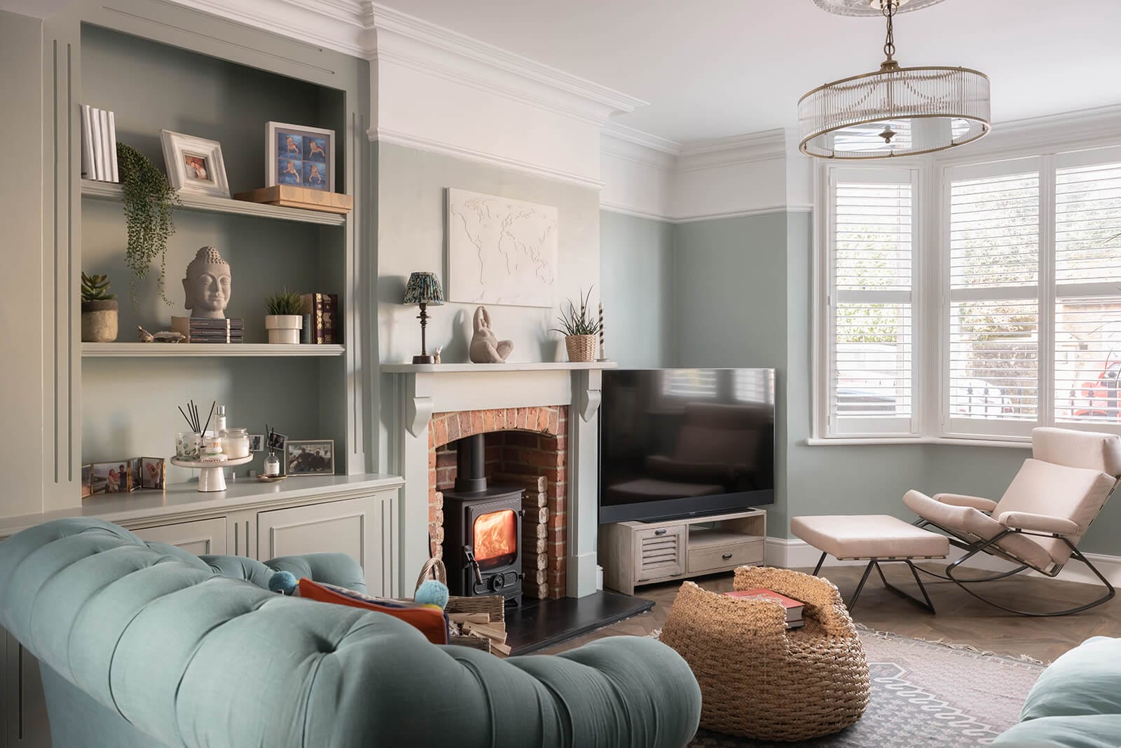 Light-filled sitting room with bay window and wood-burning stove