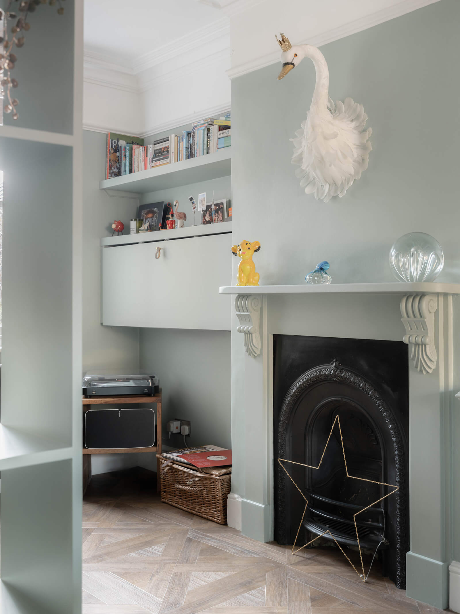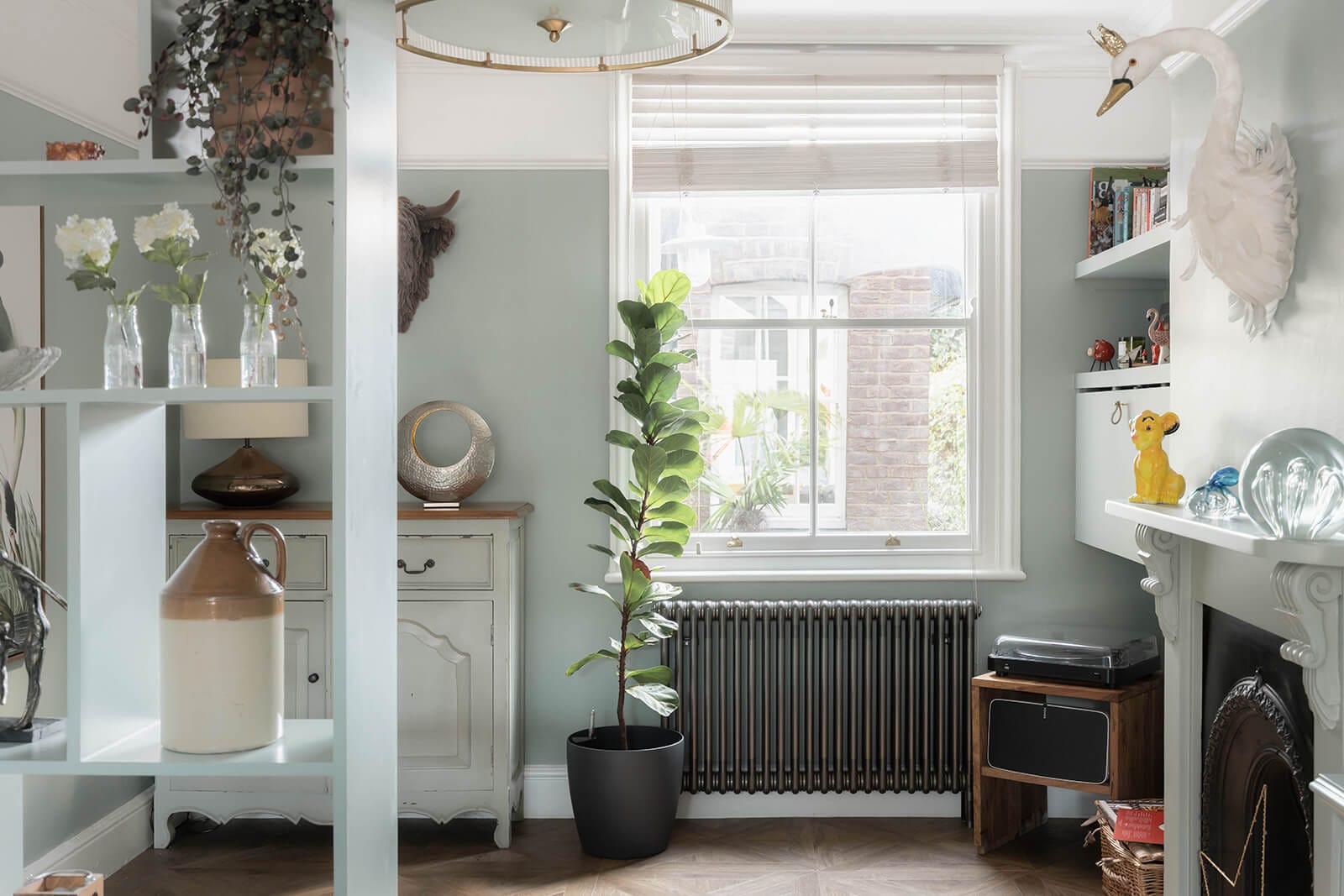 Outside, the rear garden enjoys a high degree of privacy. Landscaped with a patio, level lawn and planted borders, it also includes a neatly divided shed – storage on one side and, on the other, a small bar with a fridge for summer gatherings. At the front, reinstated iron railings frame a path leading to the newly-fitted front door from the London Door Company, painted a sumptuous shade of plum.