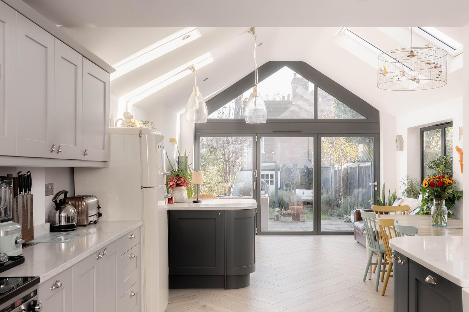 At the heart of the house lies the open-plan kitchen, dining and family room – a generous, uplifting space stretching over 31 feet. A pitched roof, multiple skylights and a wall of bifold doors create a soft, ever-changing interplay of light throughout the day. Contemporary cabinetry, quartz worktops and a breakfast bar form a kitchen that is as practical as it is inviting. A door leads out to a pretty side courtyard and herb garden, while a cloakroom tucked neatly beneath the stairs completes the ground floor.