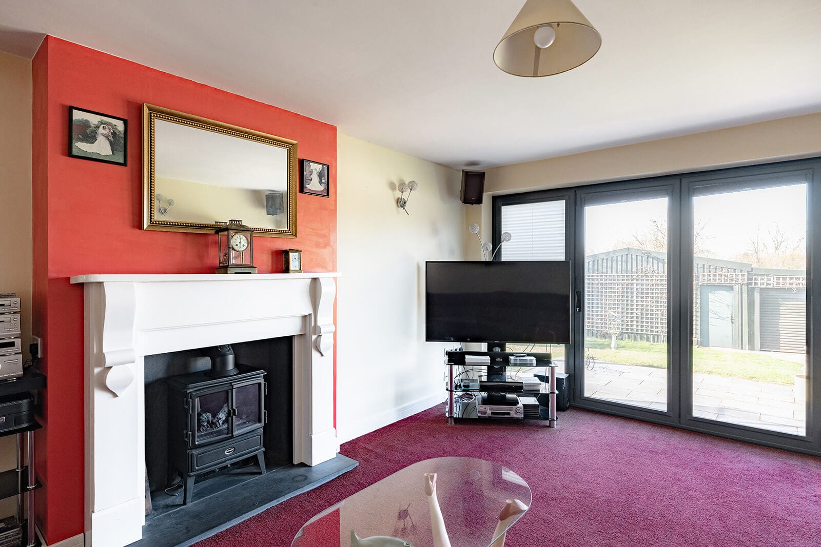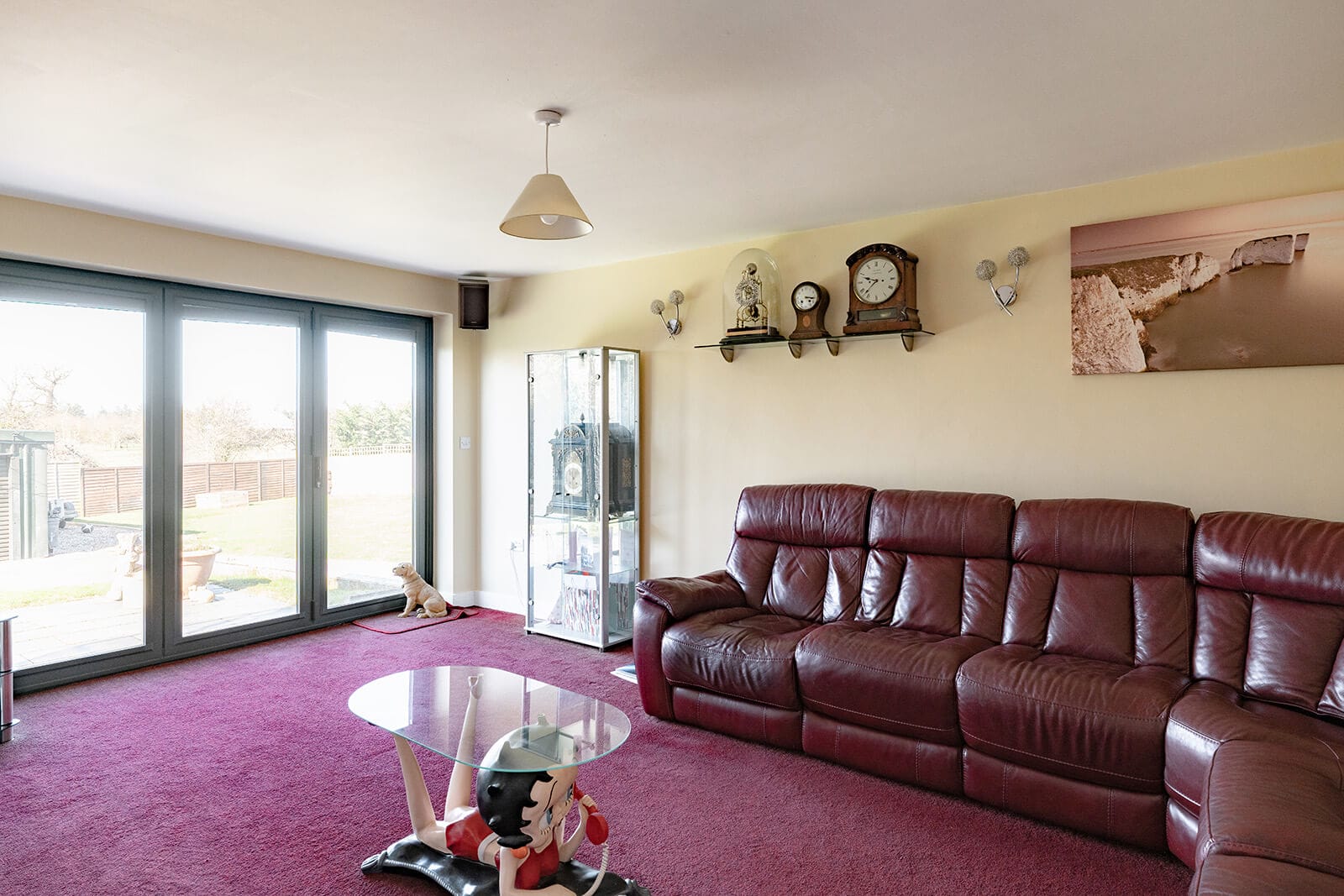 To the rear, the sitting room enjoys a pleasant outlook across the garden and towards the fields beyond, with further bifold doors reinforcing that link to the outside. A cloakroom completes the ground floor.