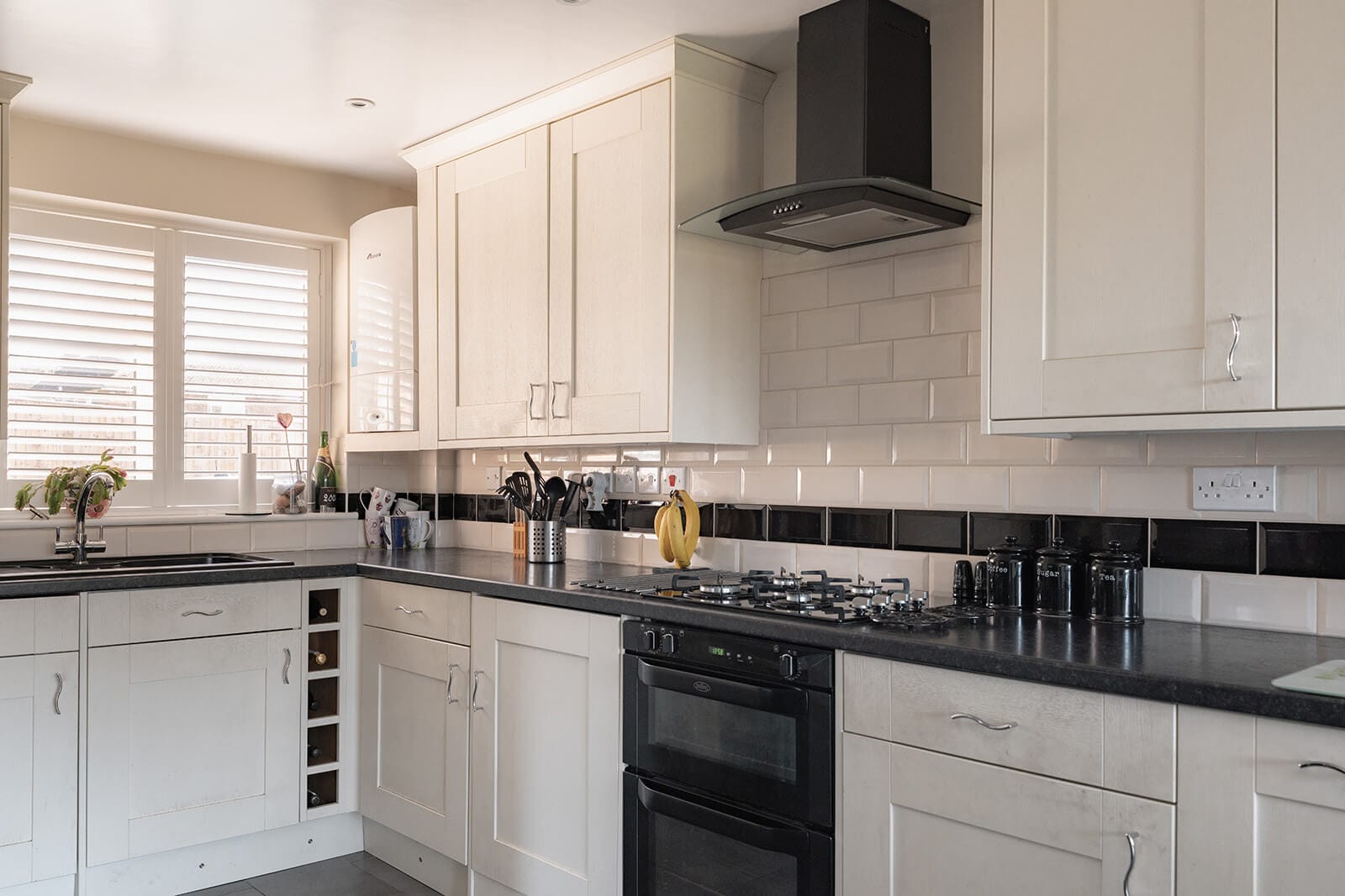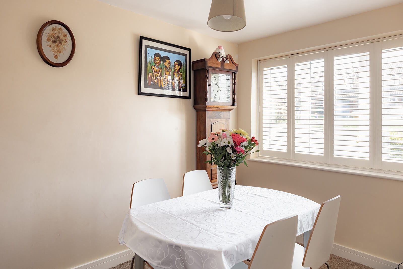A spacious entrance hall sets the tone. To one side sits a bright dining room, while opposite, the kitchen/breakfast room provides a sociable, functional space with a breakfast bar and an integrated oven, hob and dishwasher. There is a built-in pantry cupboard. Bifold doors open onto the patio and garden beyond, creating a straightforward connection between inside and out.