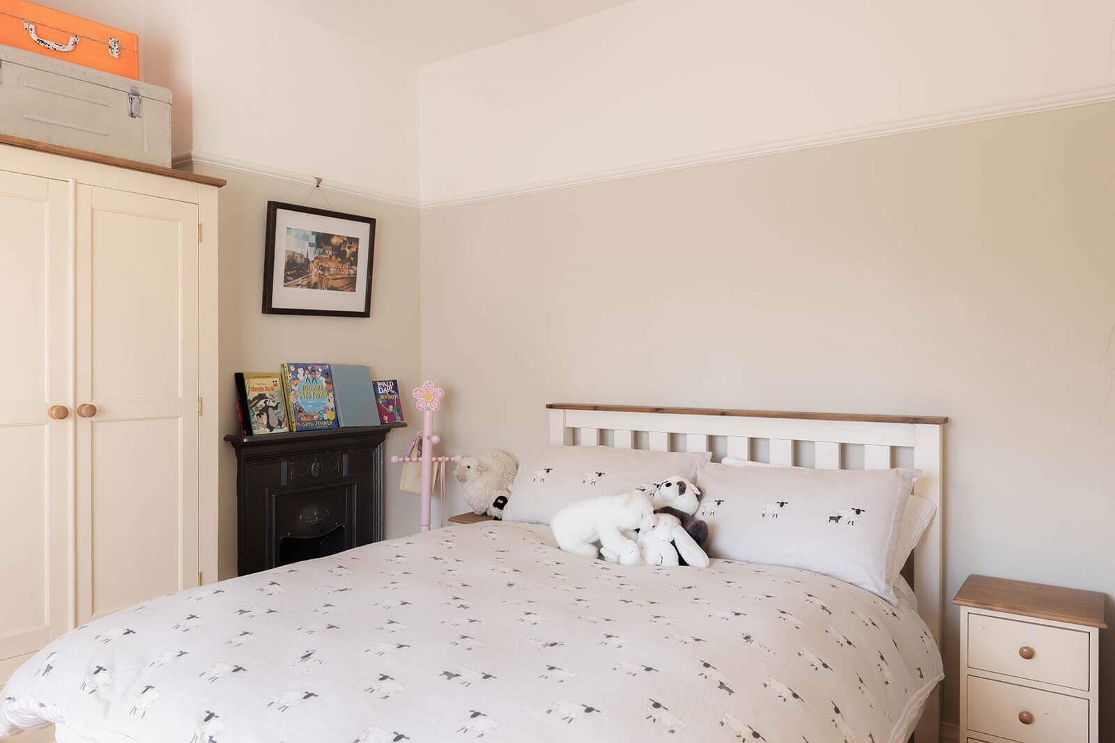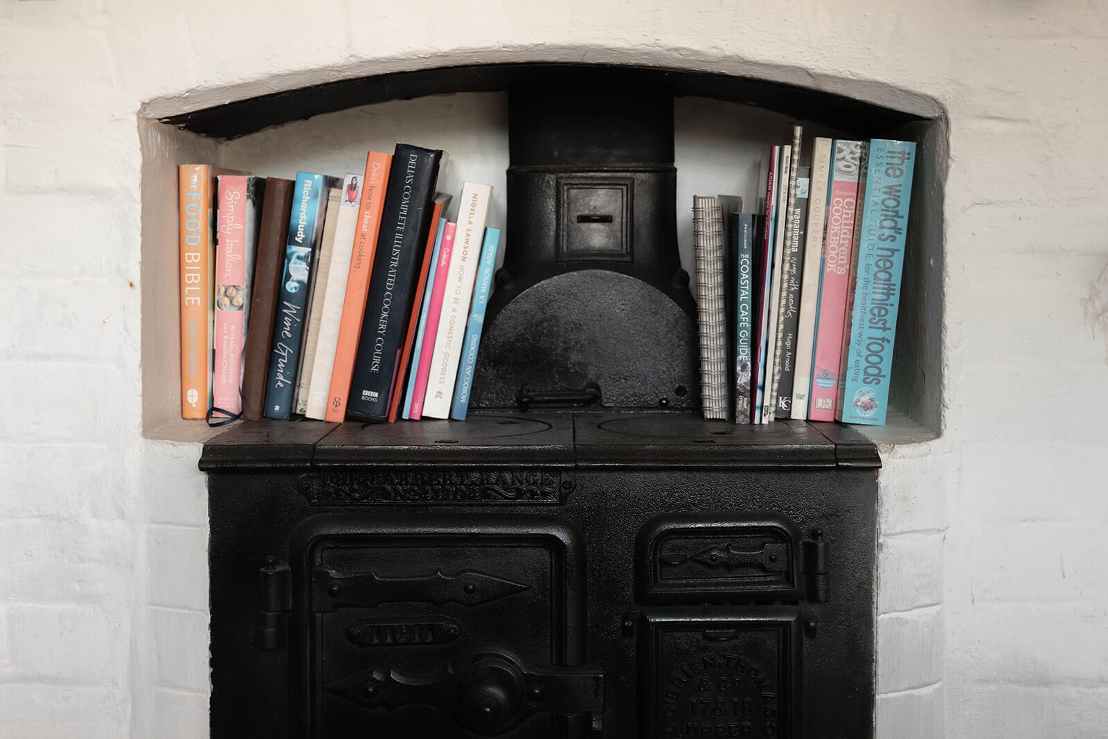 The kitchen lies just beyond, traditionally styled with a country-classic sensibility. An original stove, now purely decorative, remains inset into the wall – a quiet nod to the building’s working past. A cloakroom completes the ground floor.
