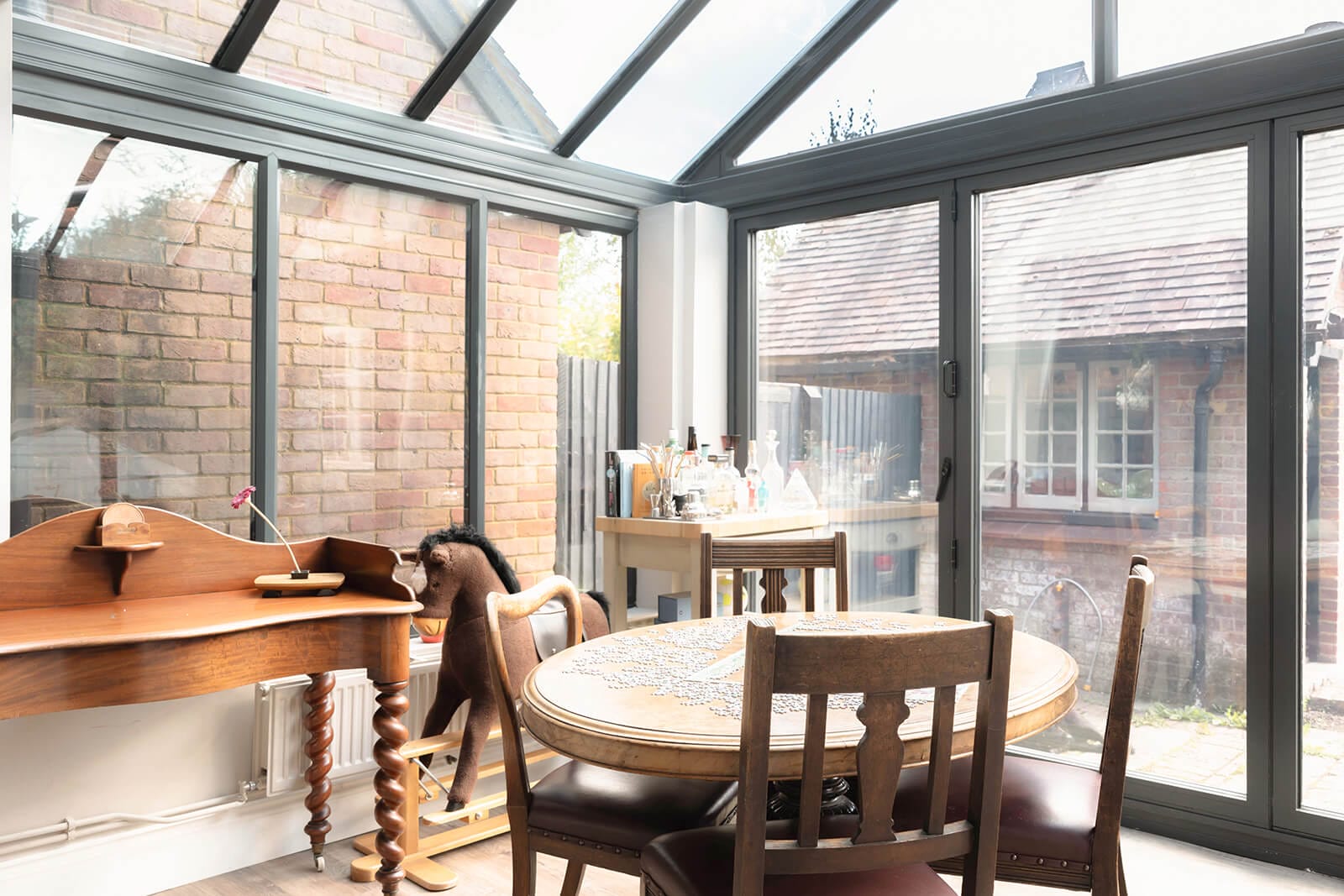 Light-filled conservatory/dining space with bifold doors to the garden