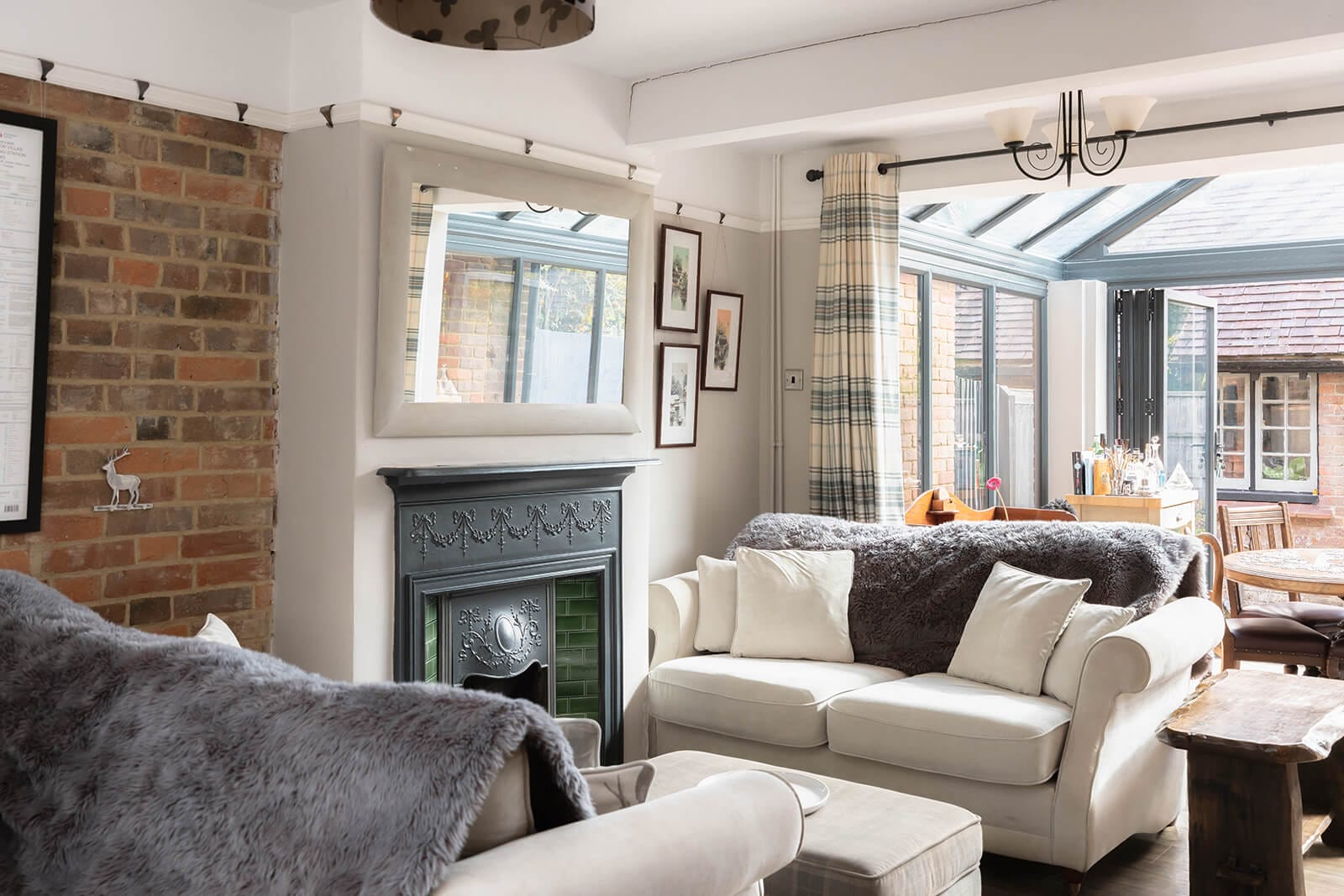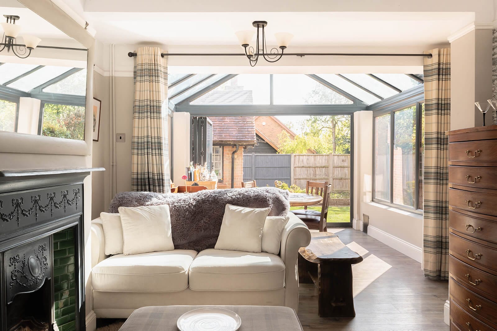 To the left, the second reception room spans the full depth of the house and is arranged as a generous family room flowing into a light-filled dining area/conservatory. Here, bifold doors open onto the garden, while a glazed roof over the dining space invites daylight to pour in; a bright counterpoint to the more intimate, classic tones found elsewhere in the property. This room, too, has its own, more decorative fireplace, set with green-tiled slips – a tactile detail that feels wonderfully grounded in its time.