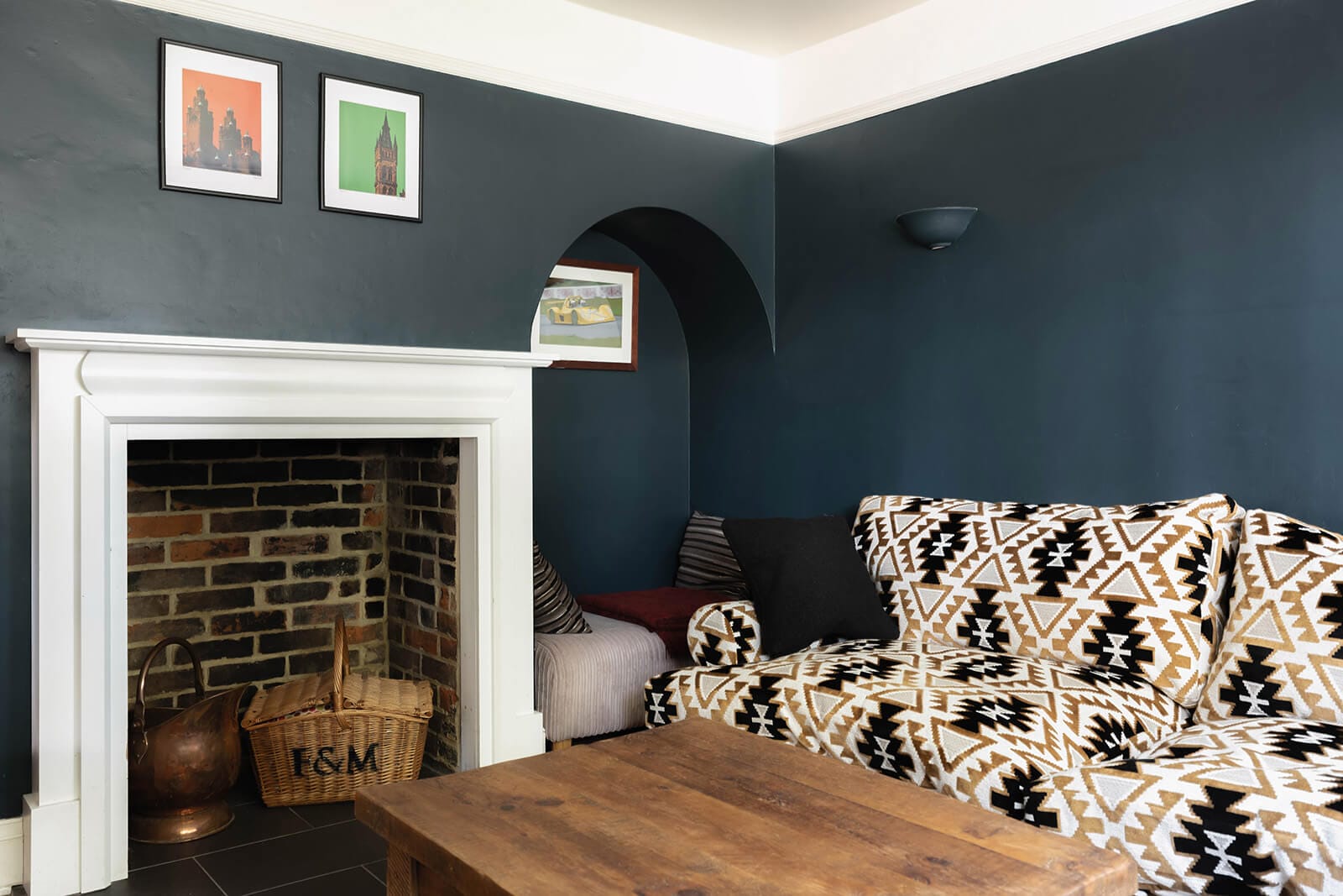 To the right, the sitting room is richly atmospheric, painted in a sumptuous deep blue, with a fireplace and aged timber floors underfoot. A picture rail traces the perimeter in classic early 20th-century style, anchoring the space in its historical context.