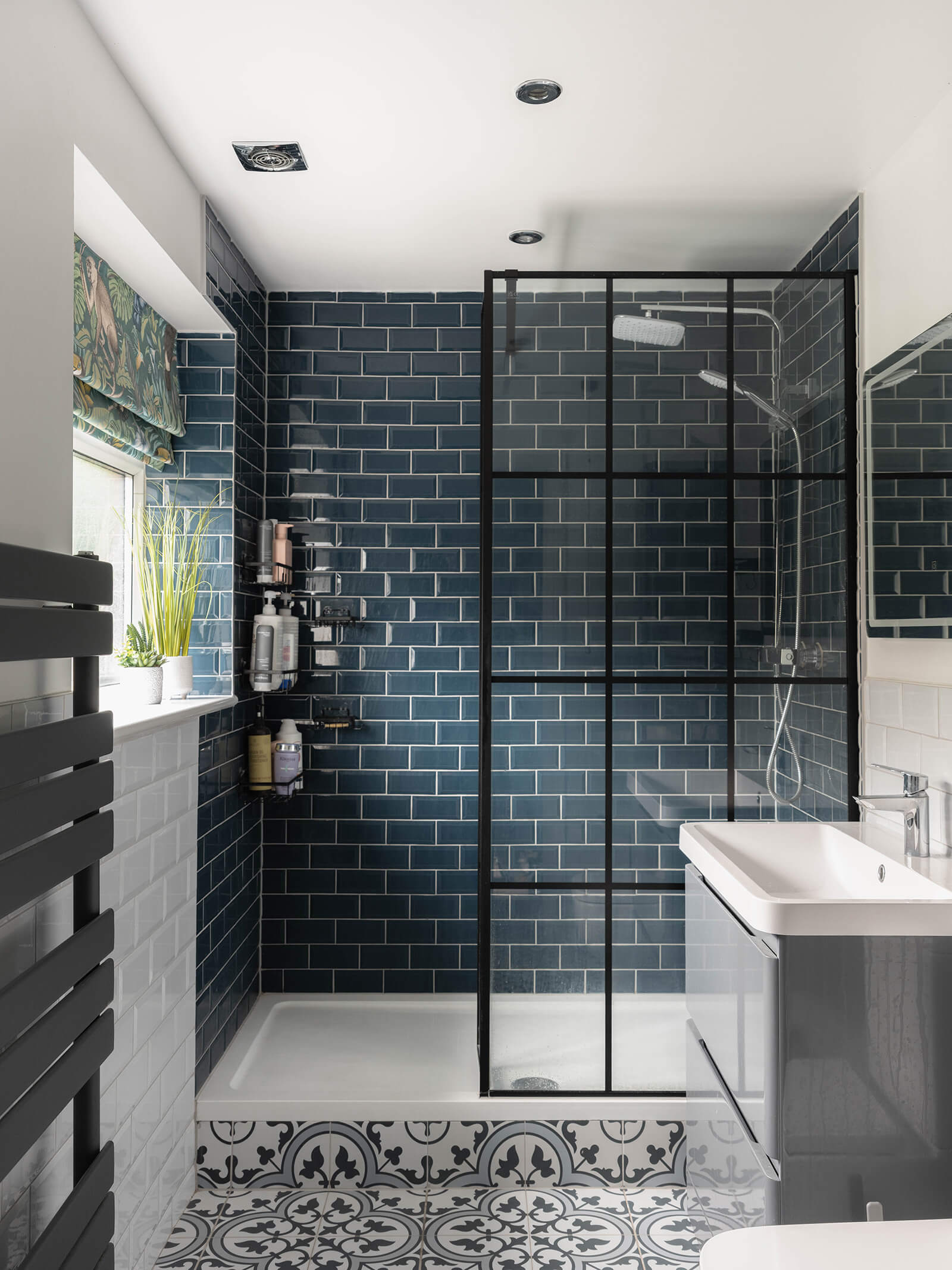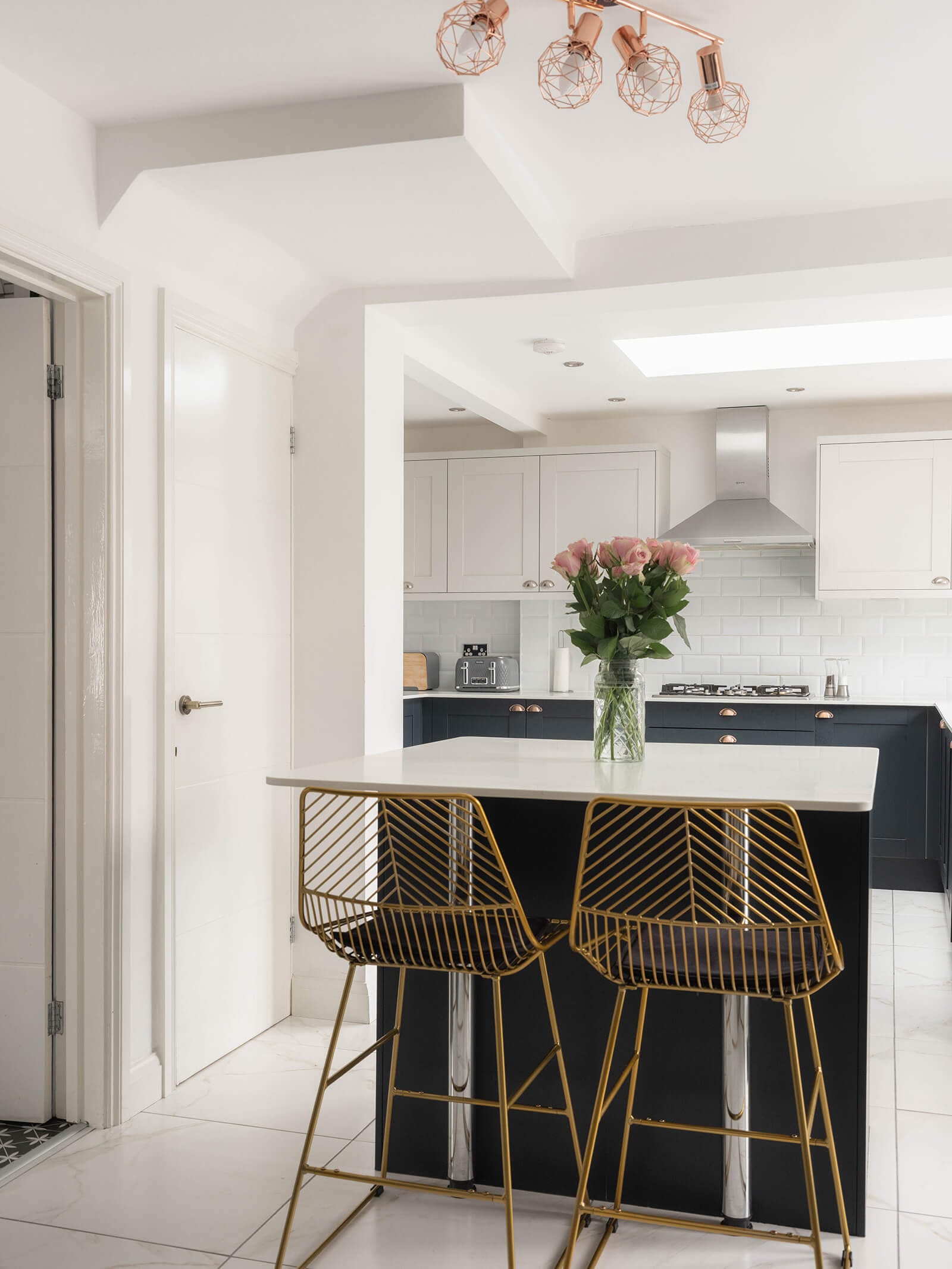 The kitchen/breakfast room echoes this sense of openness. Here, graphite Shaker cabinetry with copper hardware contrasts with crisp white wall units and pale stone worktops. A central island anchors the space, while French doors and a Velux window invite in even more daylight. Integrated appliances, including a five-ring hob and oven, lend a sleek, functional finish. Beyond lies a dedicated study with fitted storage, while a contemporary shower room completes the ground floor.