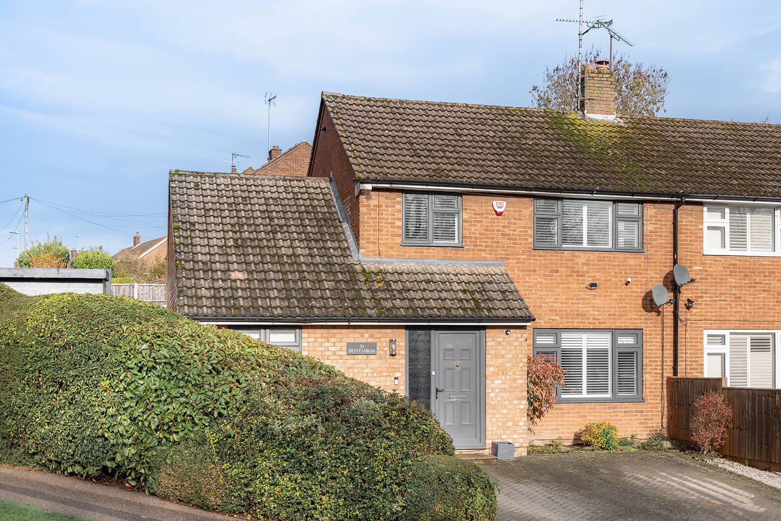 The garden, set on a generous corner plot, wraps around the side and rear of the house. A terrace directly off the kitchen is perfect for summer dining, with steps leading up to a generous lawn. To the front, a wide driveway provides parking for two cars and a gated side path offers easy access to the garden.