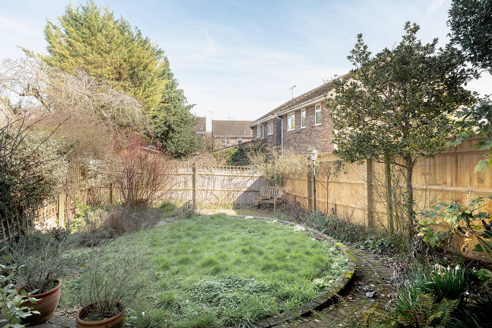 Rear garden laid to lawn with mature shrub borders
