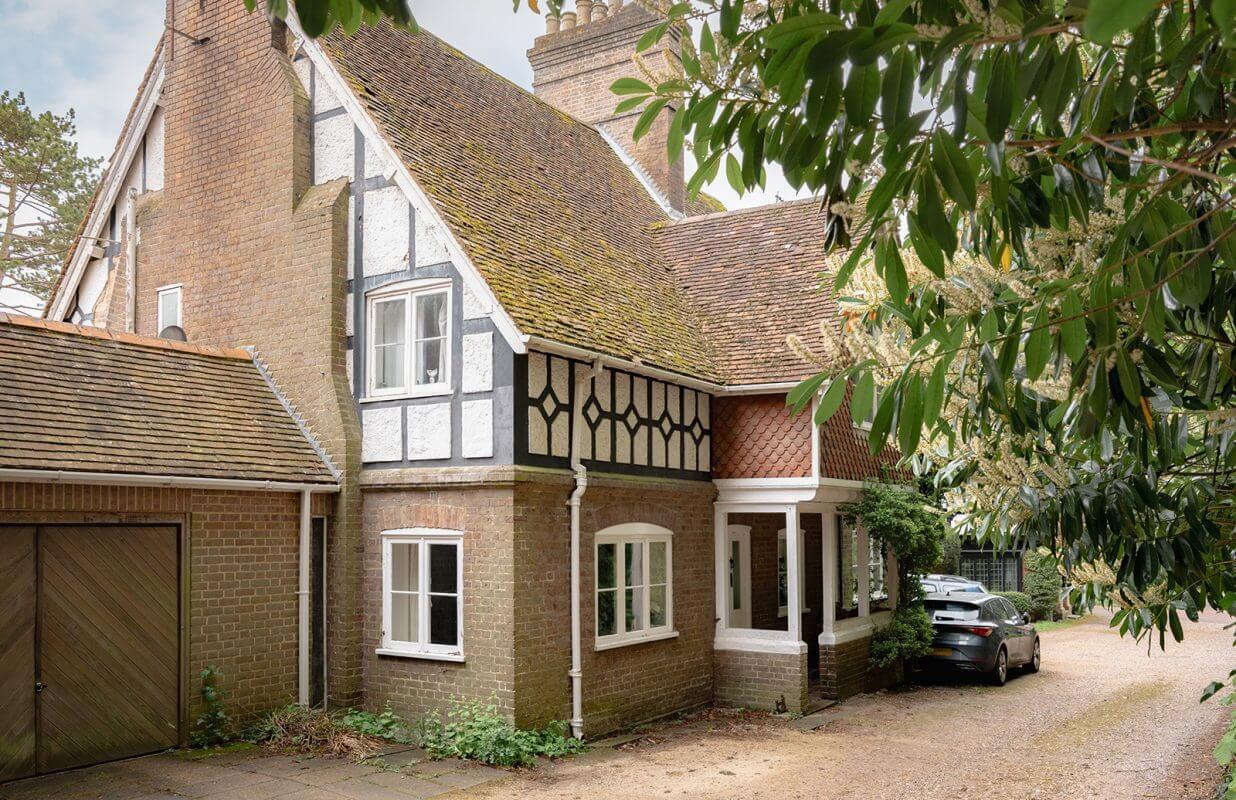 The elevations are richly composed: plum brickwork below, with black and white timber framing above, interspersed with scalloped red tile hanging to the jettied first floor and set beneath a steeply pitched roof. It is a house that speaks of a time when even estate dwellings were designed with care and artistry, their details intended not simply to impress, but to endure.