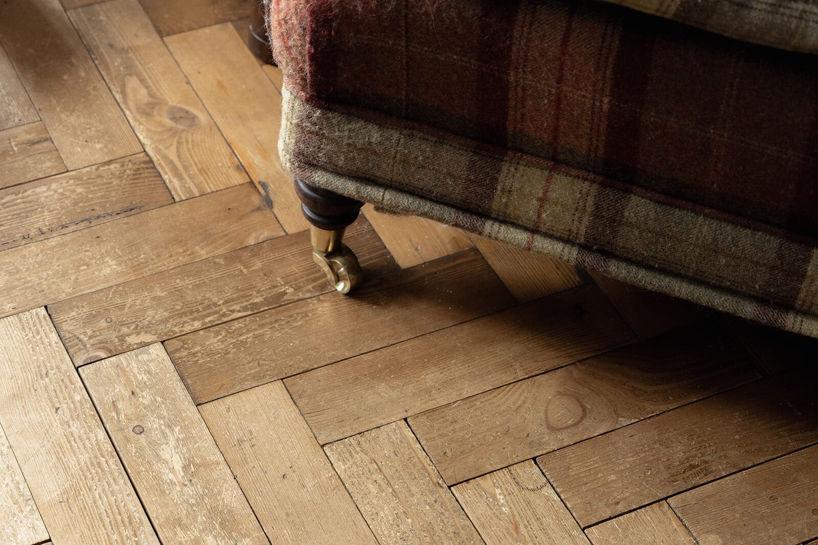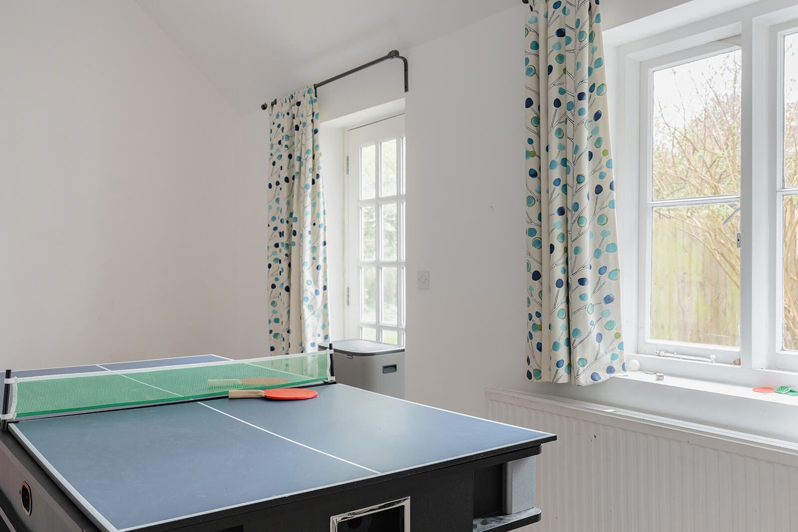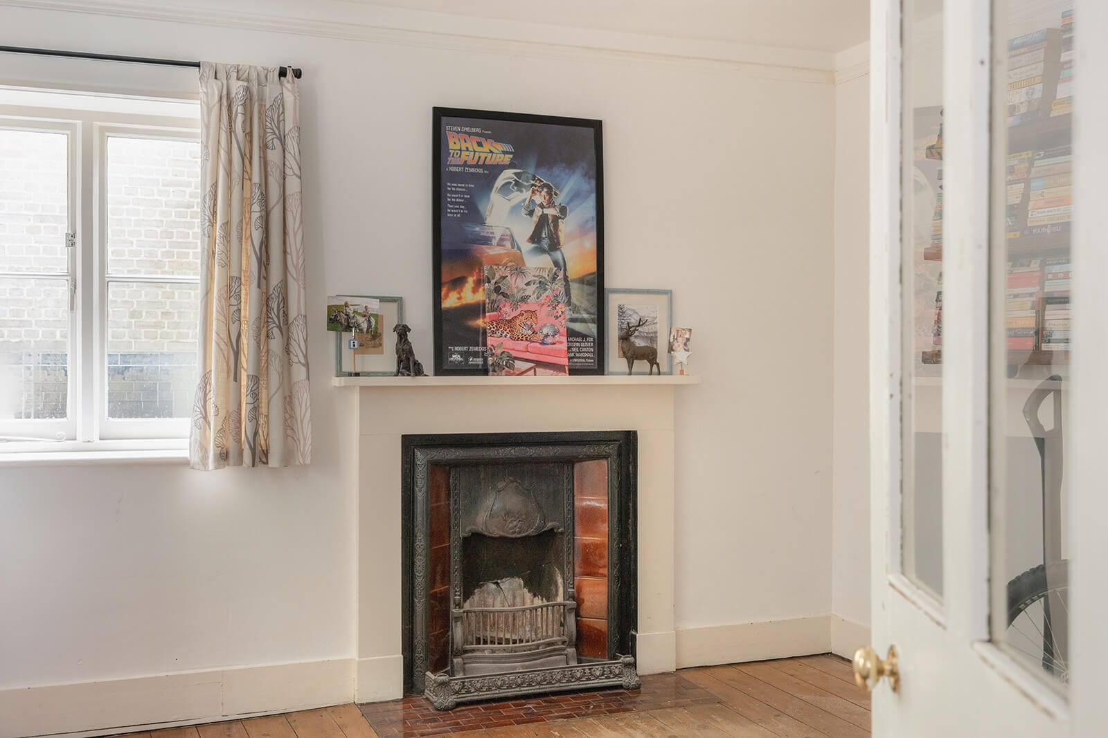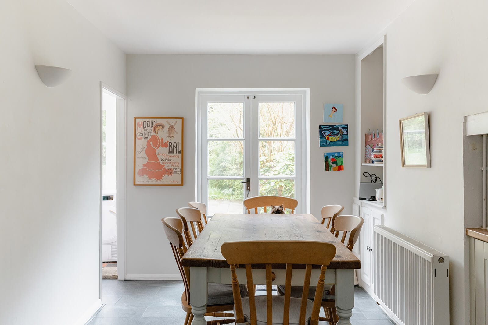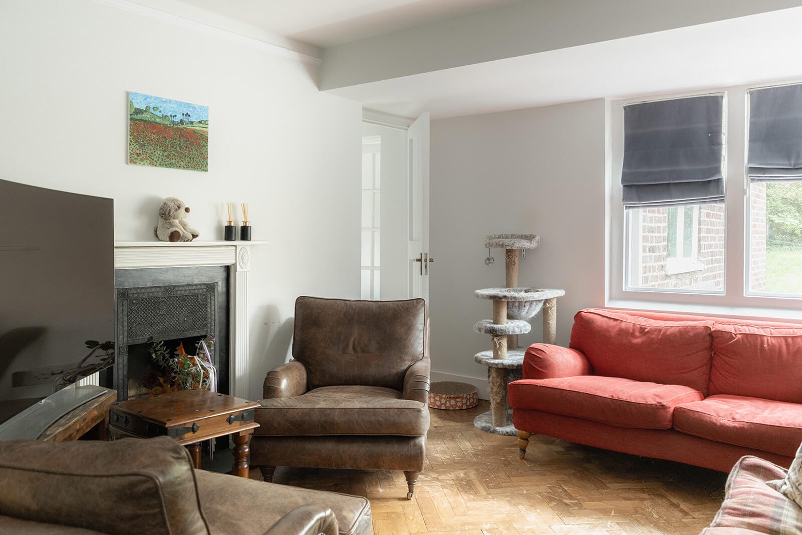 Inside, the entrance hall leads to a sequence of reception rooms. To the front, a dual-aspect room serves as a dining room or more intimate sitting space, with stripped floorboards and an original fireplace. Behind, the main sitting room is a larger, more open space, with herringbone parquet flooring underfoot and views out across the garden, along with its original fireplace too. This in turn connects to a family room, where a vaulted ceiling adds volume and light, and a door provides access out to the garden.