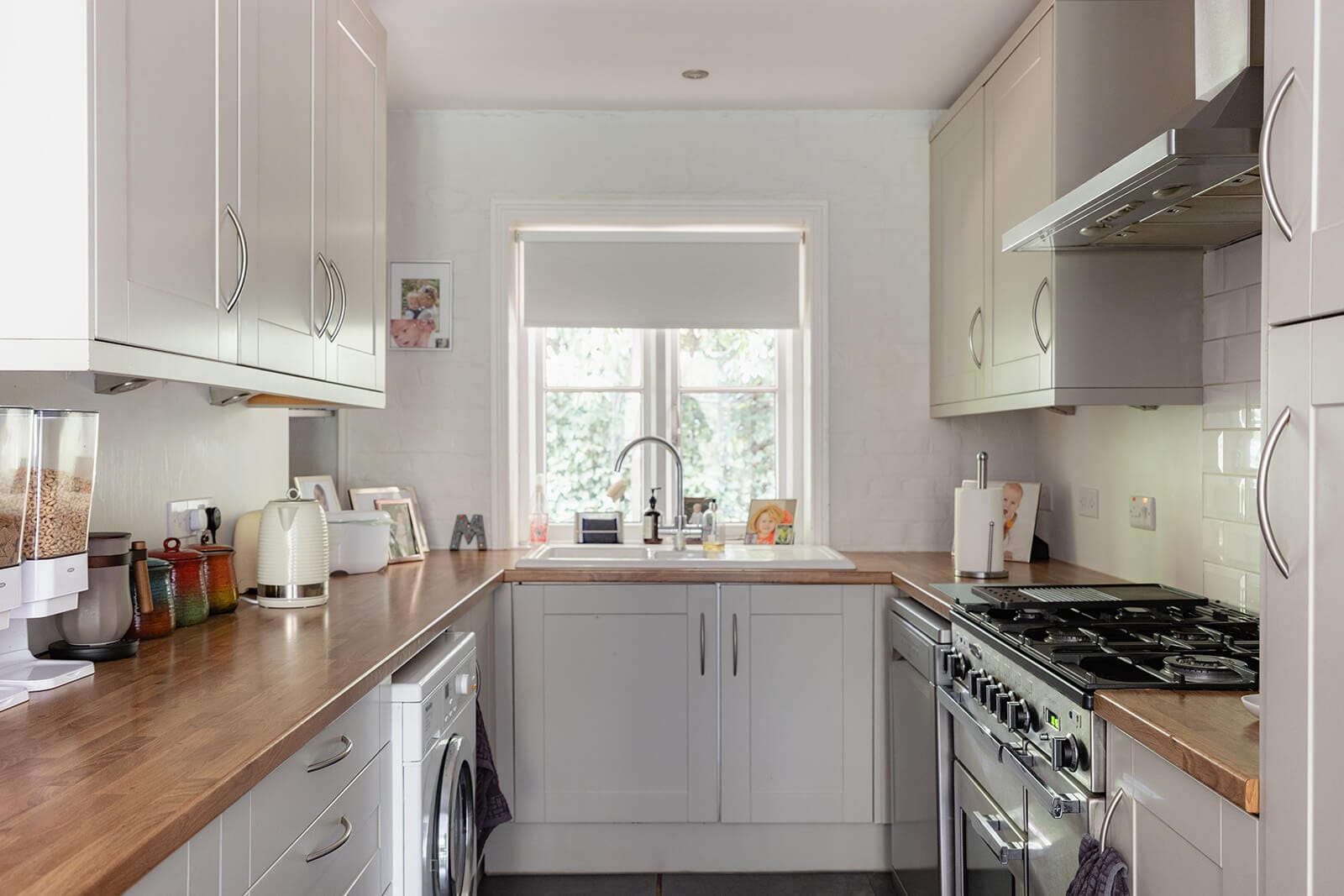 The kitchen and breakfast room occupy the opposite side of the house, extending from front to back. Fitted with Shaker-style cabinetry and a range cooker, the space is functional and well proportioned, with the breakfast area opening onto the garden through glazed doors. A cloakroom sits nearby, along with access to a cellar below, which offers a generous footprint, plenty of headroom and scope for conversion, subject to obtaining the necessary consents.