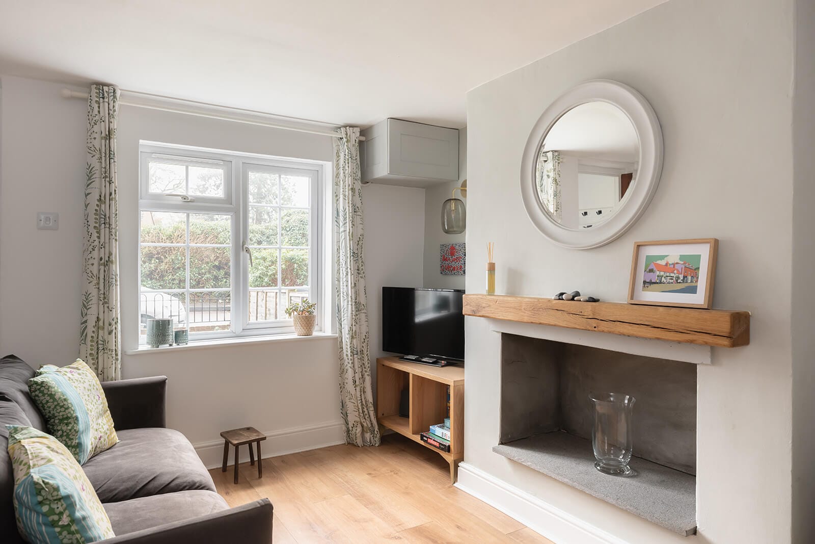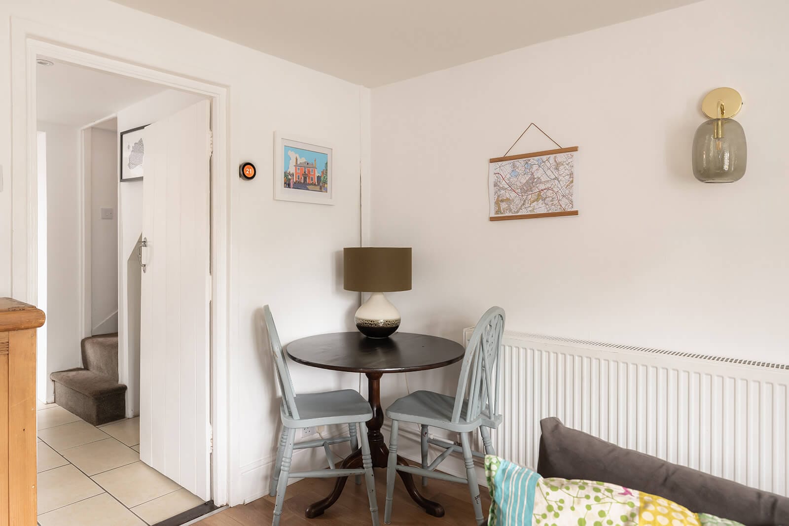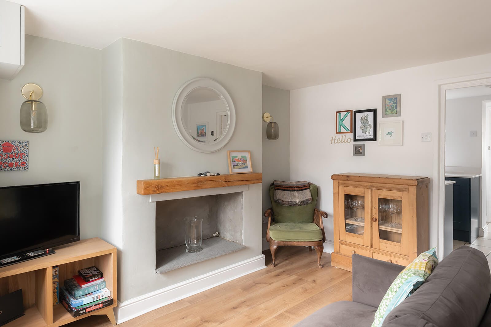 A small entrance hall provides a moment of transition before the house opens into the sitting room. Wood-style flooring grounds the space, while a chimney breast – currently closed – hints at the possibility of reinstating a real fire, restoring both flame and focal point. Intimate yet well proportioned, the room also accommodates a small dining table, allowing it to flex between living and dining with ease.