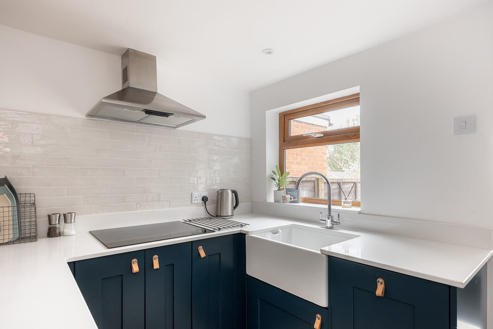 • Contemporary kitchen with ink-blue cabinetry and quartz worktops