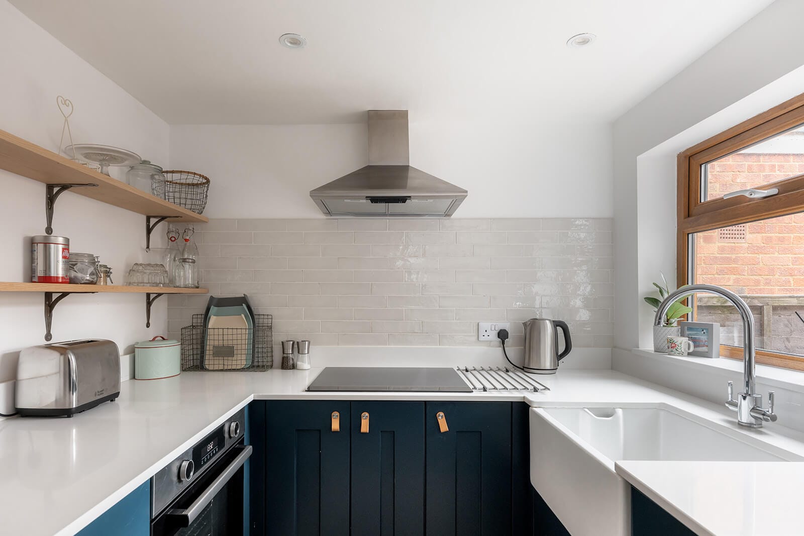 Beyond, the kitchen introduces a more contemporary note. Ink-blue cabinetry paired with leather handles and crisp quartz worktops creates a considered palette; classic in tone, modern in execution. Integrated appliances – a dishwasher, induction hob and electric oven – are neatly arranged, with space for a fridge/freezer, while the plan flows naturally through to the rear of the house. The bathroom sits at ground floor level, well appointed with a bath and overhead shower, vanity storage and a separate utility cupboard providing discreet housing for laundry appliances.