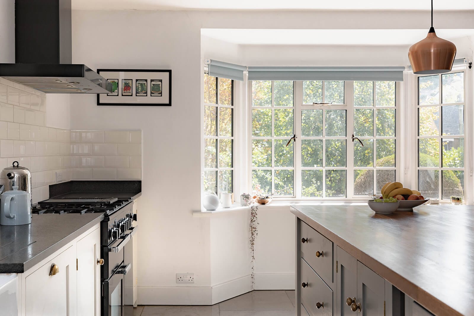 Upstairs, the home continues its sense of generous scale and thoughtful design. The principal bedroom occupies one of the four bay windows and includes fitted wardrobes and a sleek, modern en suite with rainfall shower. Two further double bedrooms – one also bay-fronted – share a striking family bathroom which is tiled in period-appropriate blue and black metro tiles; a nod to the home’s interwar roots.