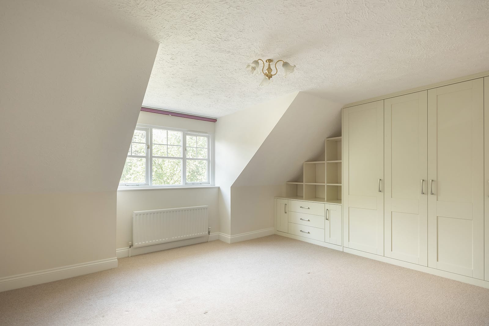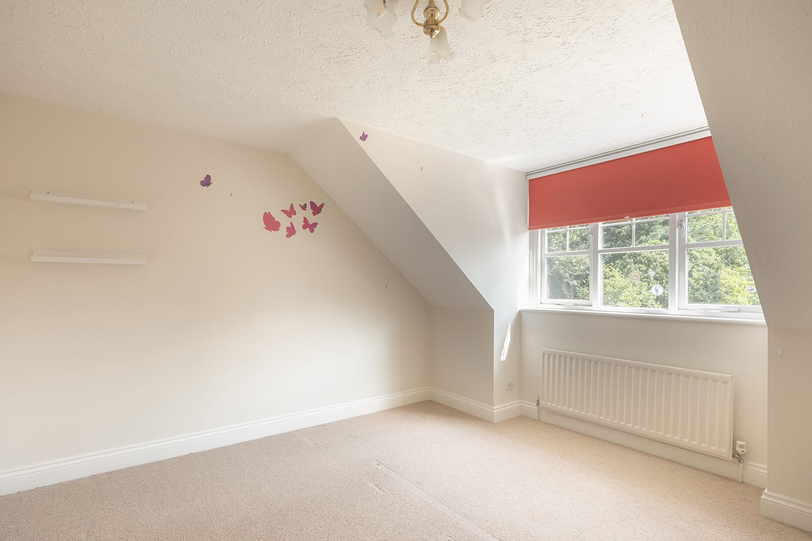 Upstairs, four double bedrooms are arranged around a central landing. The principal bedroom benefits from an en suite shower room and built-in wardrobes, while a modern family bathroom serves the remaining bedrooms. Each room is well-proportioned and enjoys soft natural light throughout the day.