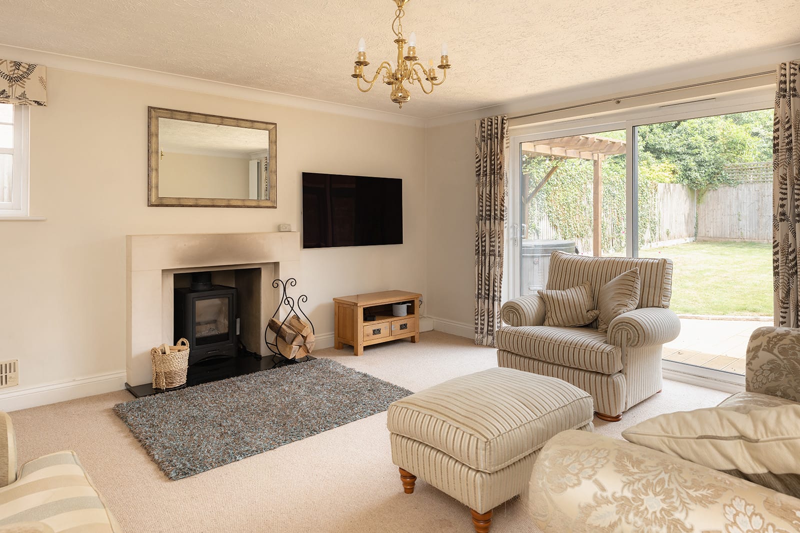 To the rear, the sitting room enjoys a wonderful garden outlook, with sliding glass doors that open to provide access. A woodburning stove anchors the room; a considered blend of form and function, offering comfort through the cooler months.