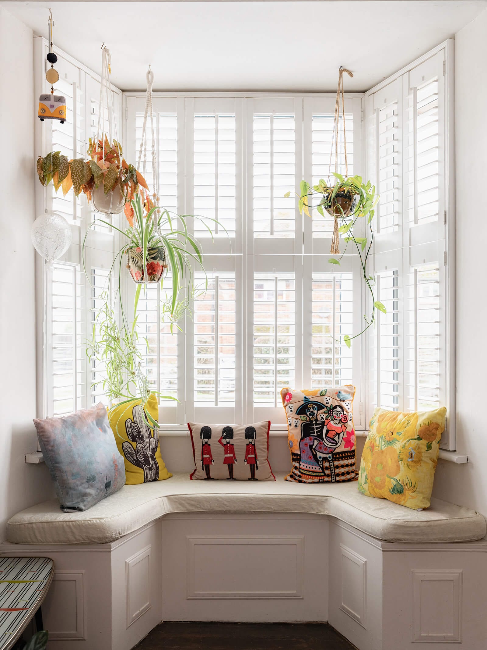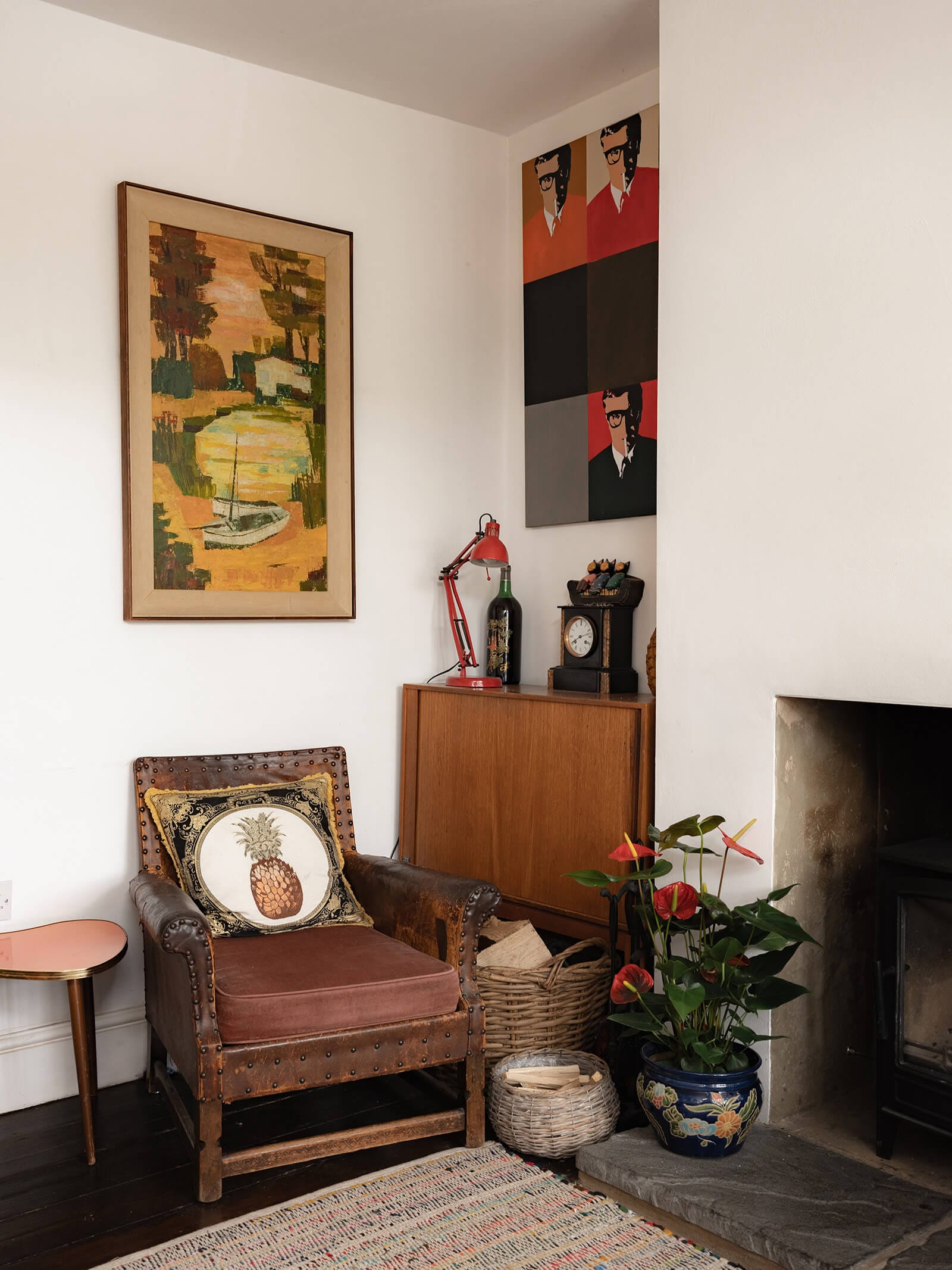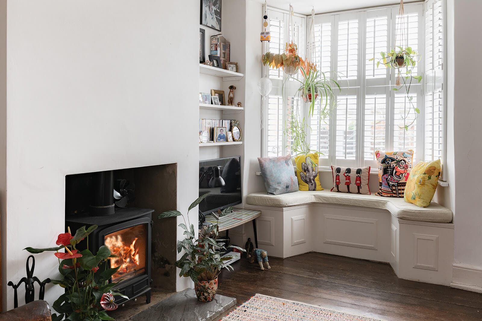 Inside, the house opens directly into a warm and characterful sitting room, where a wood-burning stove is set against rich stained timber flooring. A bay window, complete with a fitted window seat, draws in soft daylight, creating a space that feels both intimate and welcoming.