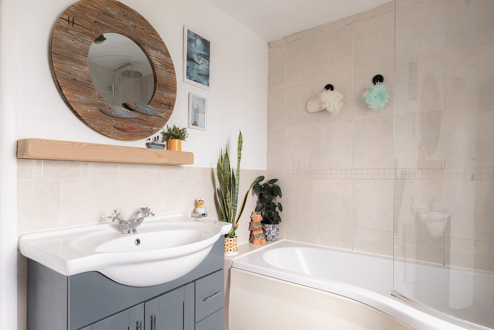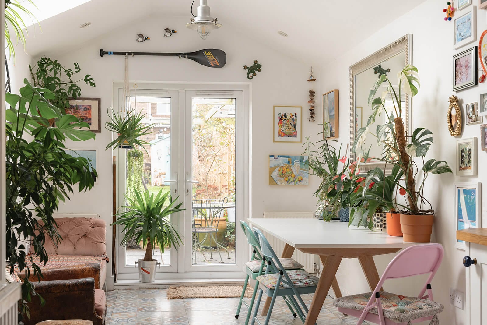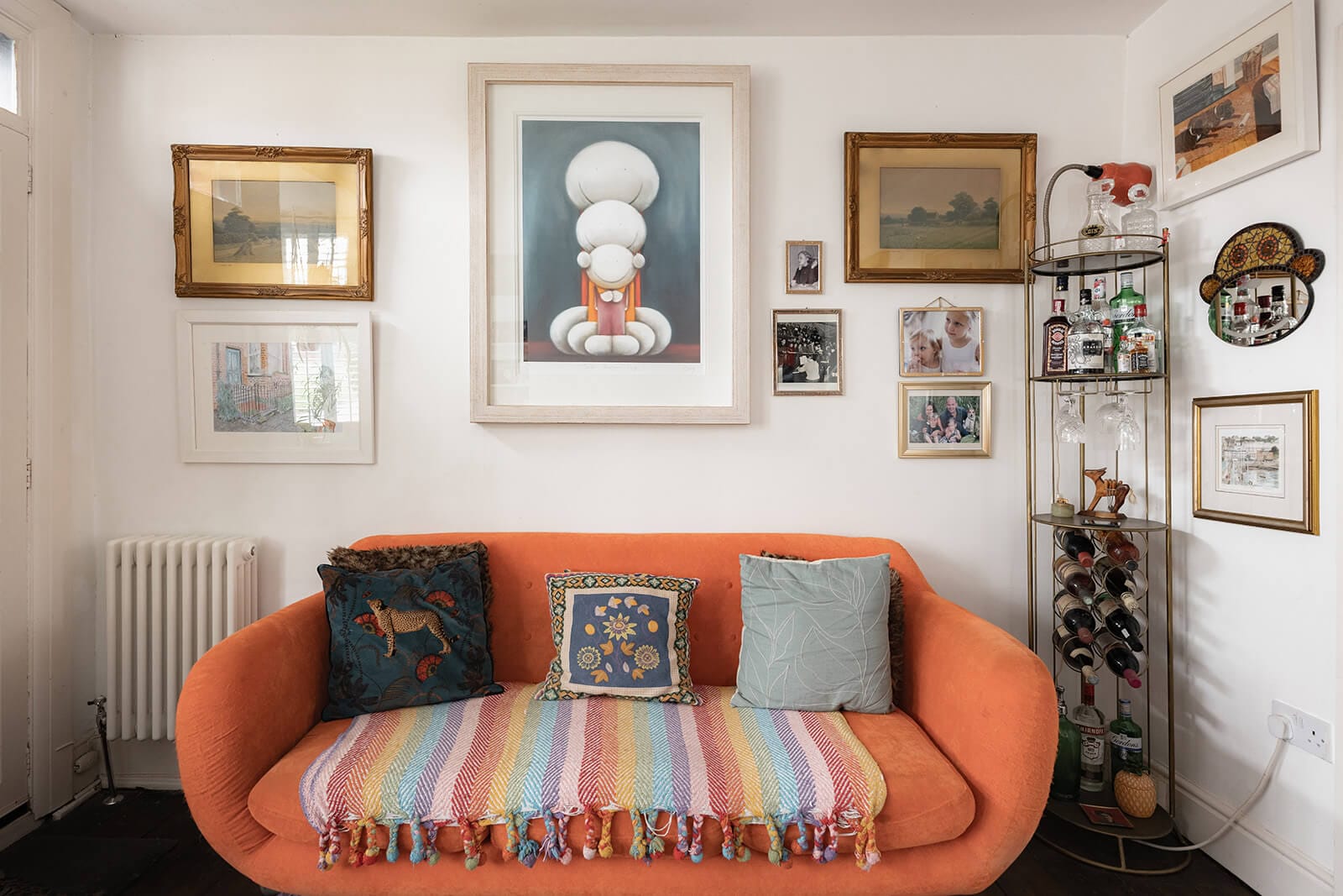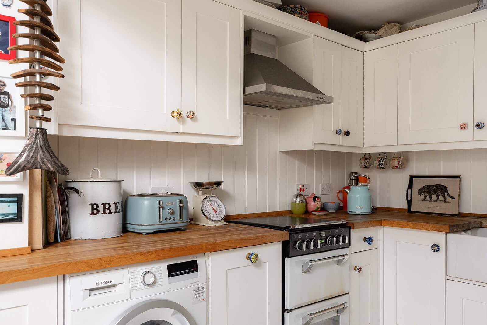From here, the plan unfolds into a gorgeous, open-plan and light-filled kitchen, dining and family room – the social heart of the house. Glazed French doors connect seamlessly to the garden, while a rooflight above floods the space with natural light throughout the day. The kitchen is fitted with traditional white cabinetry, wooden worktops and a Belfast sink, with decorative tiled flooring running throughout. Painted timber splashbacks and a neatly tucked-away storage nook beneath the stairs add both charm and practicality.