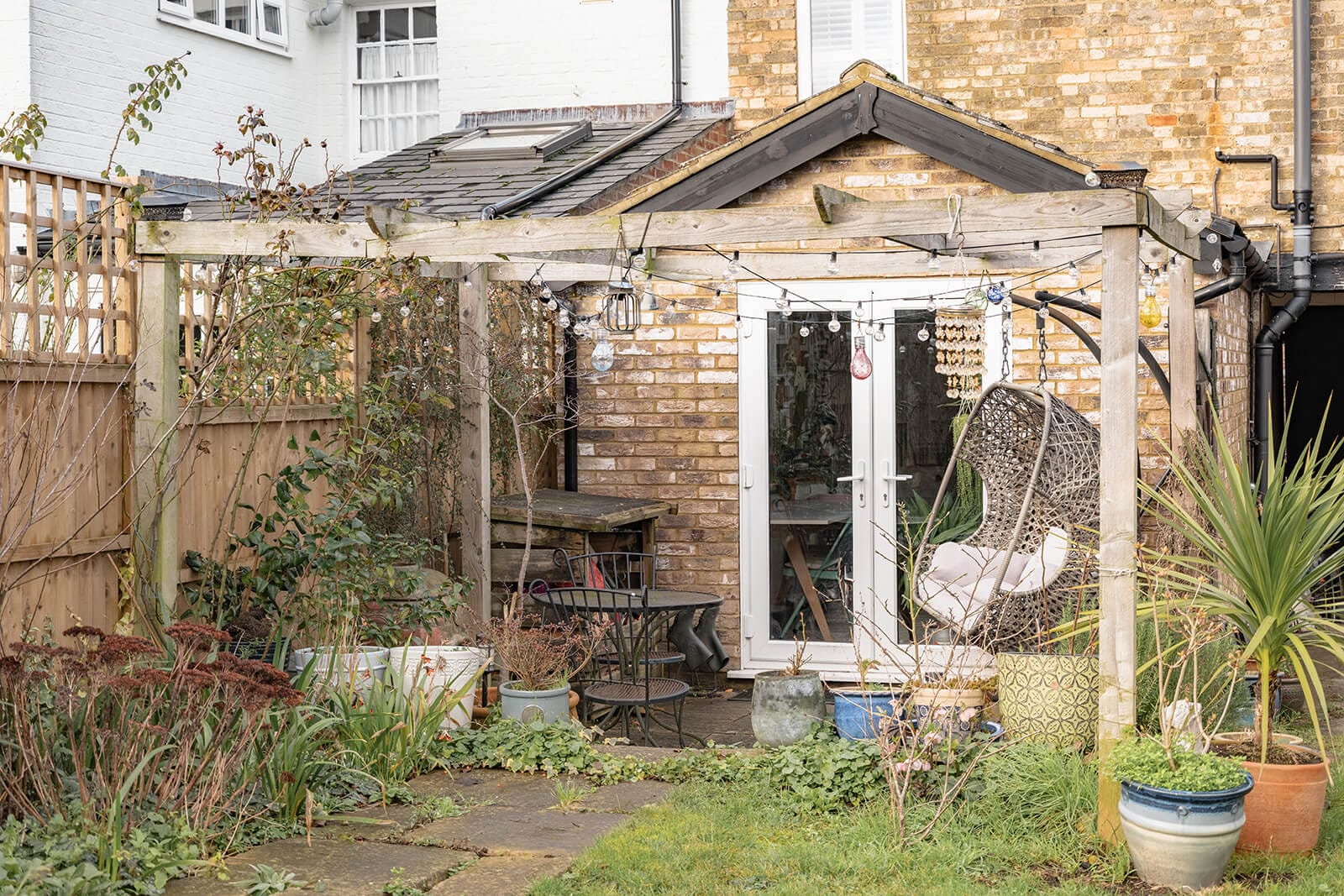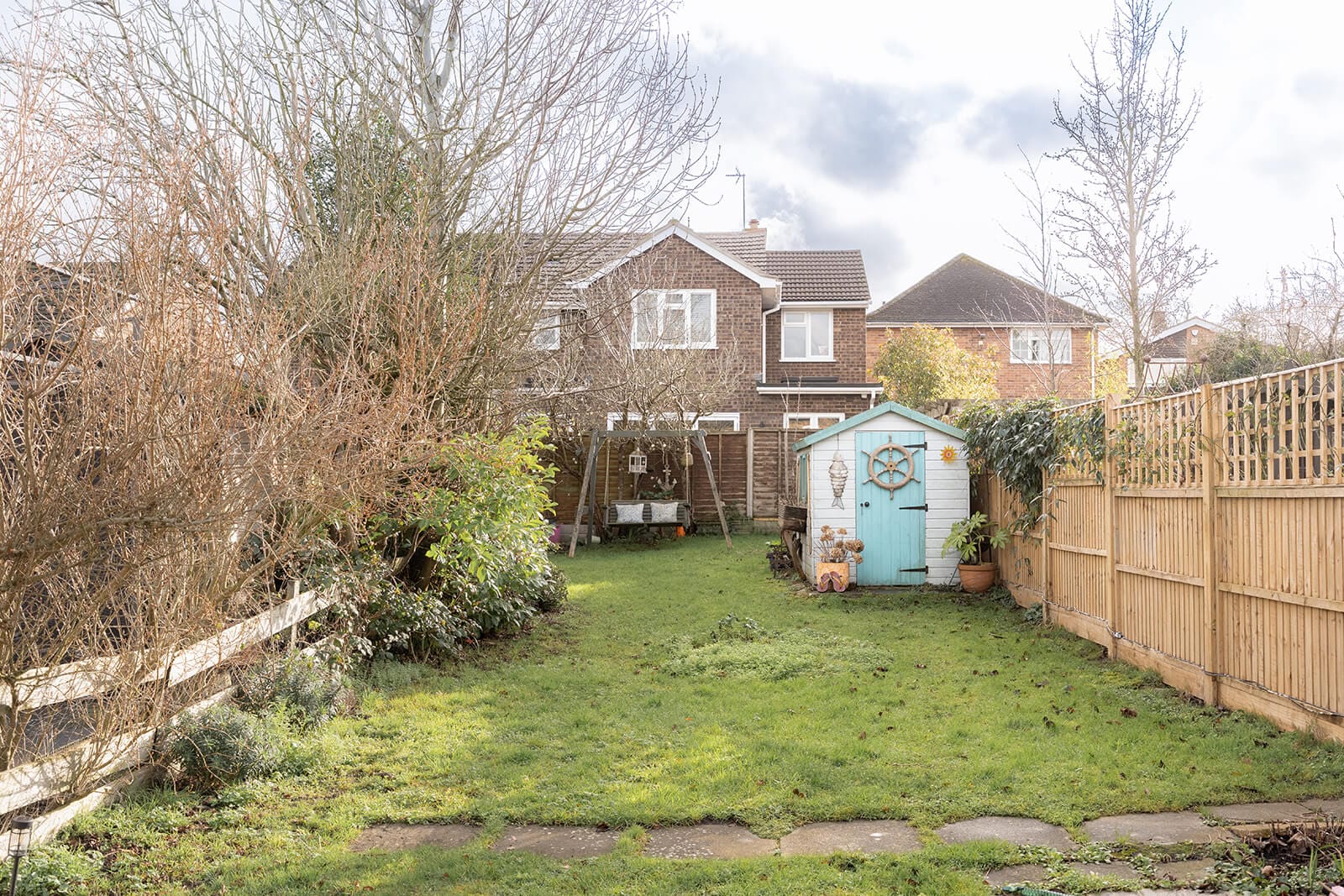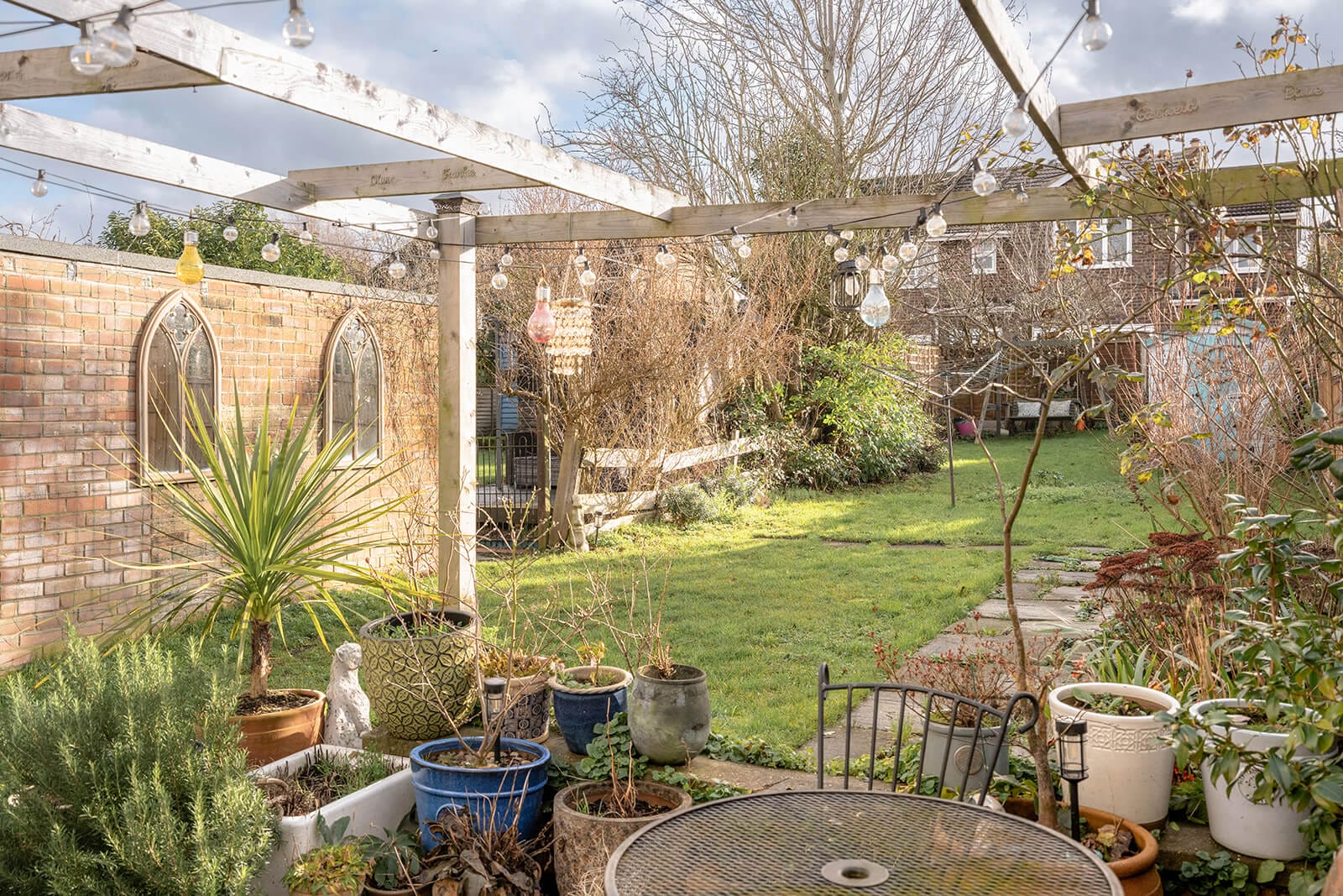 Outside, a broad patio with pergola sits directly off the kitchen, forming a natural extension of the living space and an ideal setting for outdoor dining. In all, the garden stretches some 80ft, laid mainly to lawn and punctuated by mature plum and cherry trees. Side access allows for discreet bin storage, while a garden shed offers further practical space.