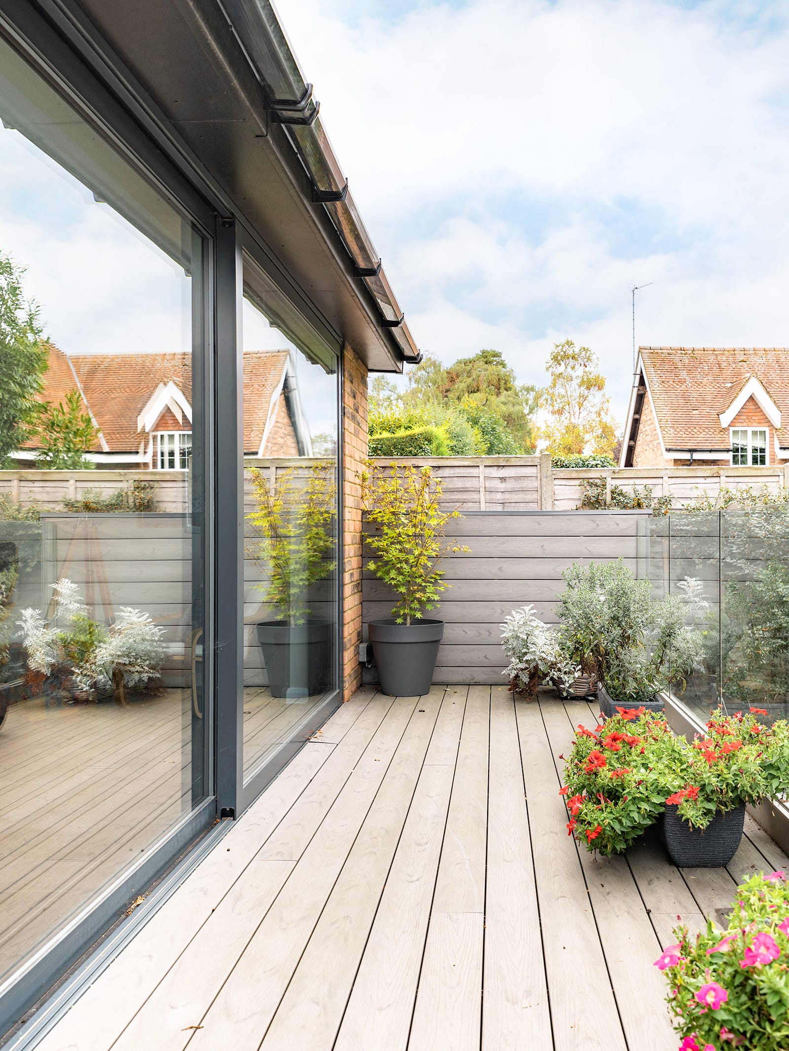 The rear garden offers a high degree of privacy. A raised deck, enclosed in glass balustrades, creates an elevated vantage point, stepping down to a landscaped garden which is framed by mature trees and lush planted borders.