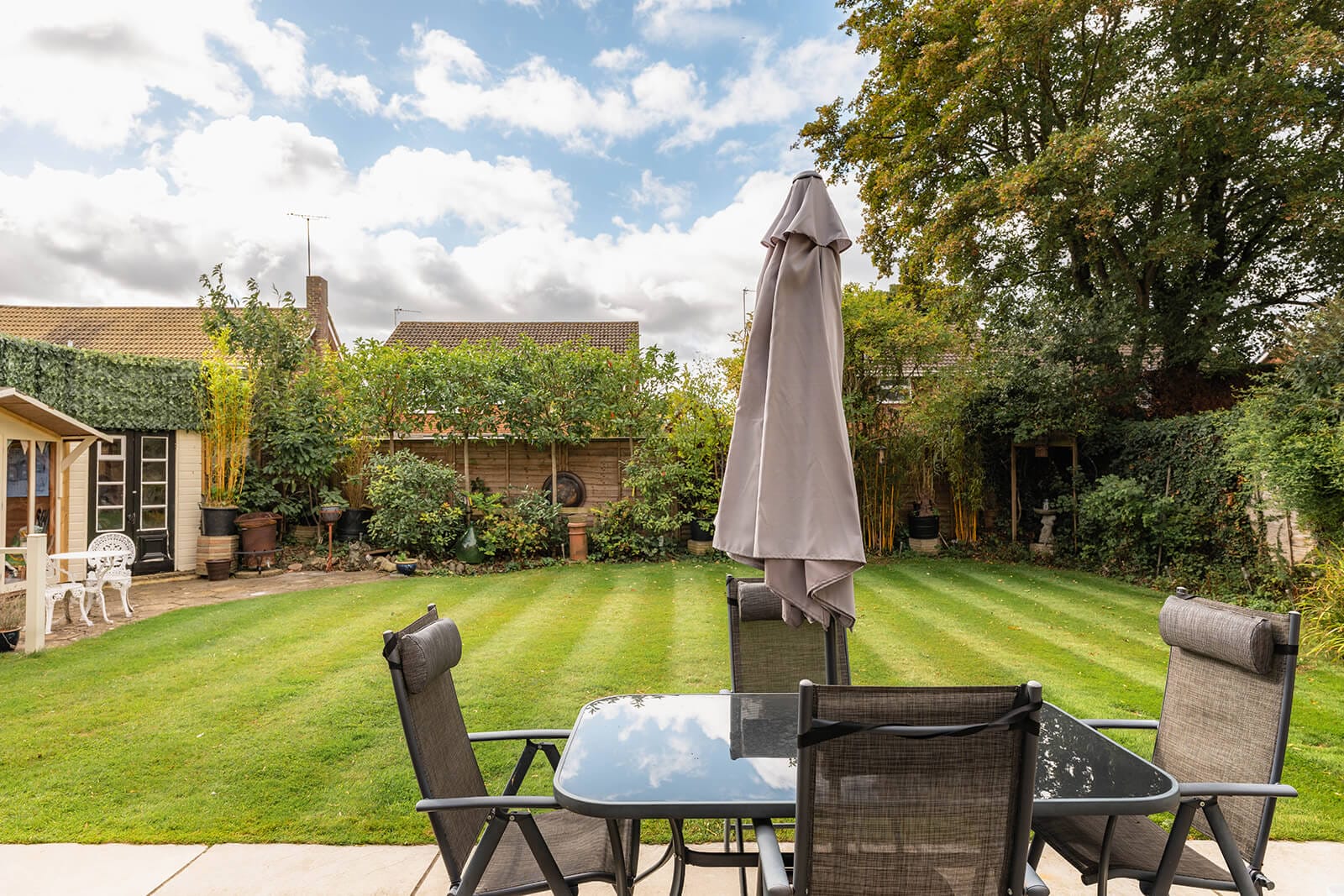 Outside, the wide, south-facing garden is a private oasis. Carefully landscaped and framed by mature evergreens and well-established planting, it offers a sense of natural enclosure and year-round greenery. Multiple seating areas have been arranged to catch the light at different times of day, while a spacious patio invites long lunches and evening gatherings. A summer house and shed provide useful storage and additional lifestyle flexibility, whether as a creative workspace, reading nook or garden studio.