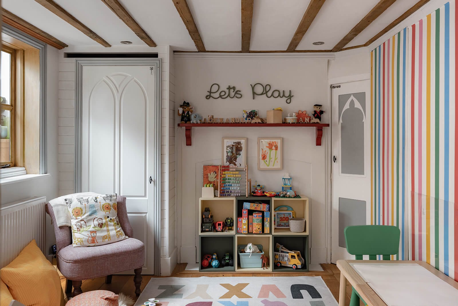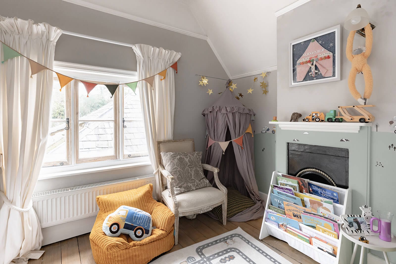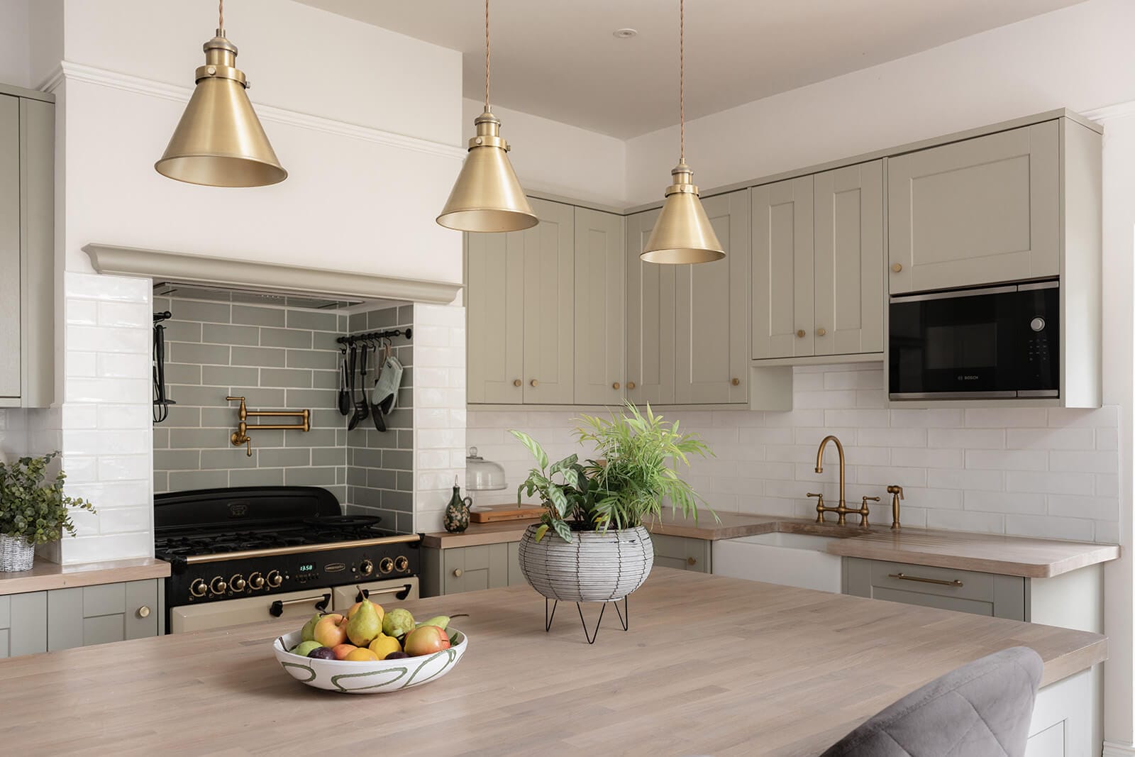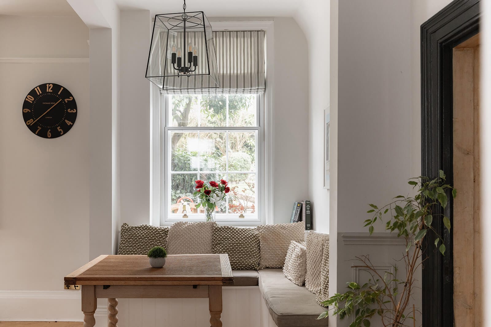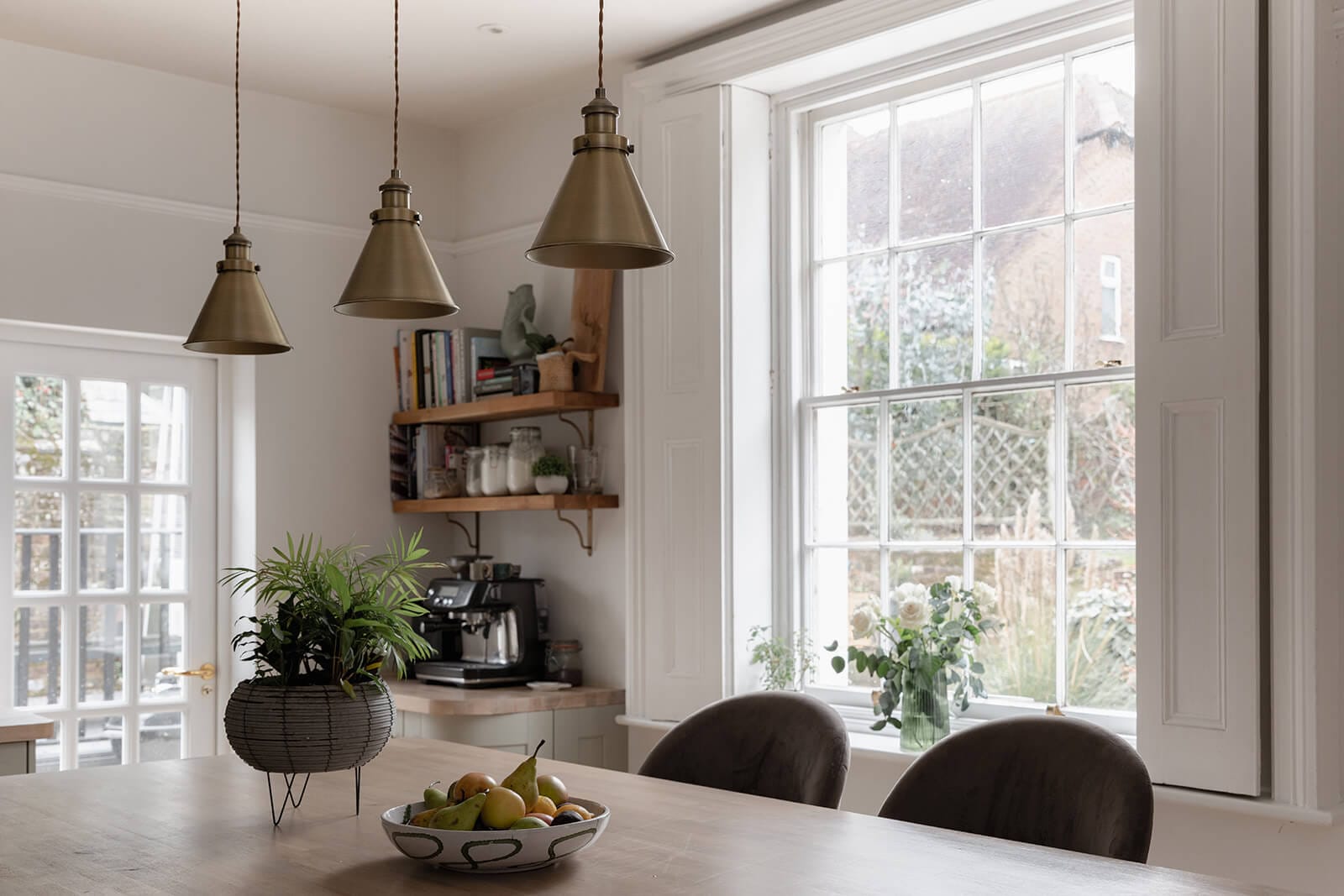 To the rear, the house shifts gently into a more relaxed register. The kitchen/breakfast room has been thoughtfully designed in a soft green Shaker style, topped with timber worktops and centred around an island illuminated by a trio of brushed brass pendants. A range cooker forms the practical heart of the room, while fitted bench seating creates an informal dining nook. The tall sash window once again retains its original shutters, while a door opens directly to the garden, reinforcing the easy dialogue between inside and out. Beyond, the family room – currently a playroom, later perhaps a television snug – offers yet another generous fireplace and a sense of comfort that feels entirely natural.