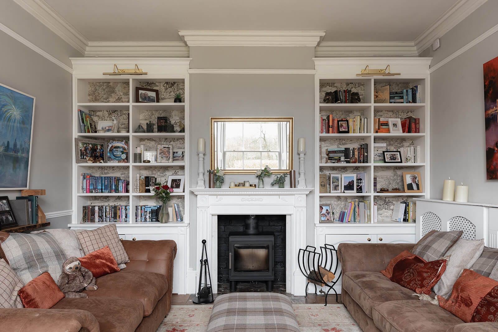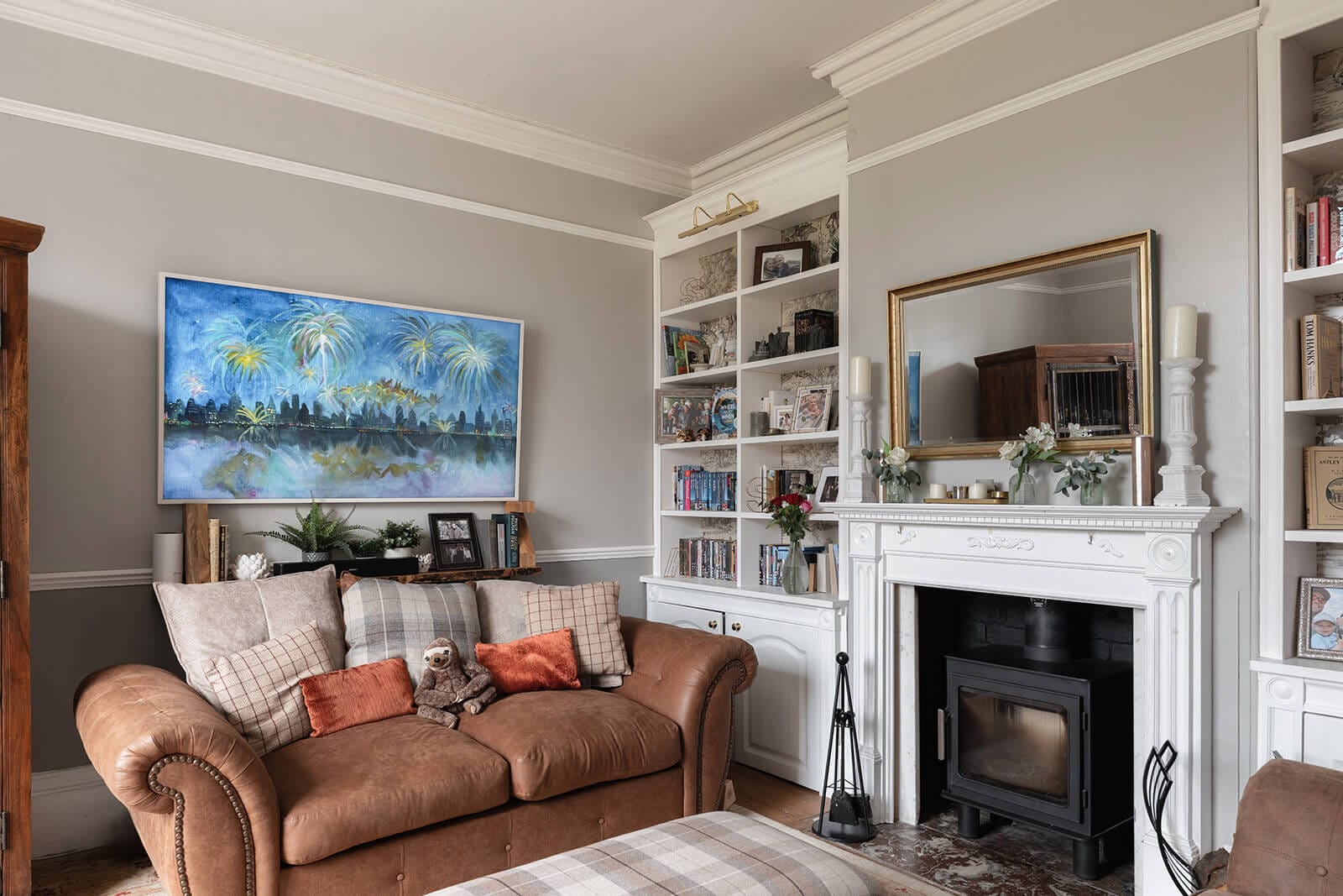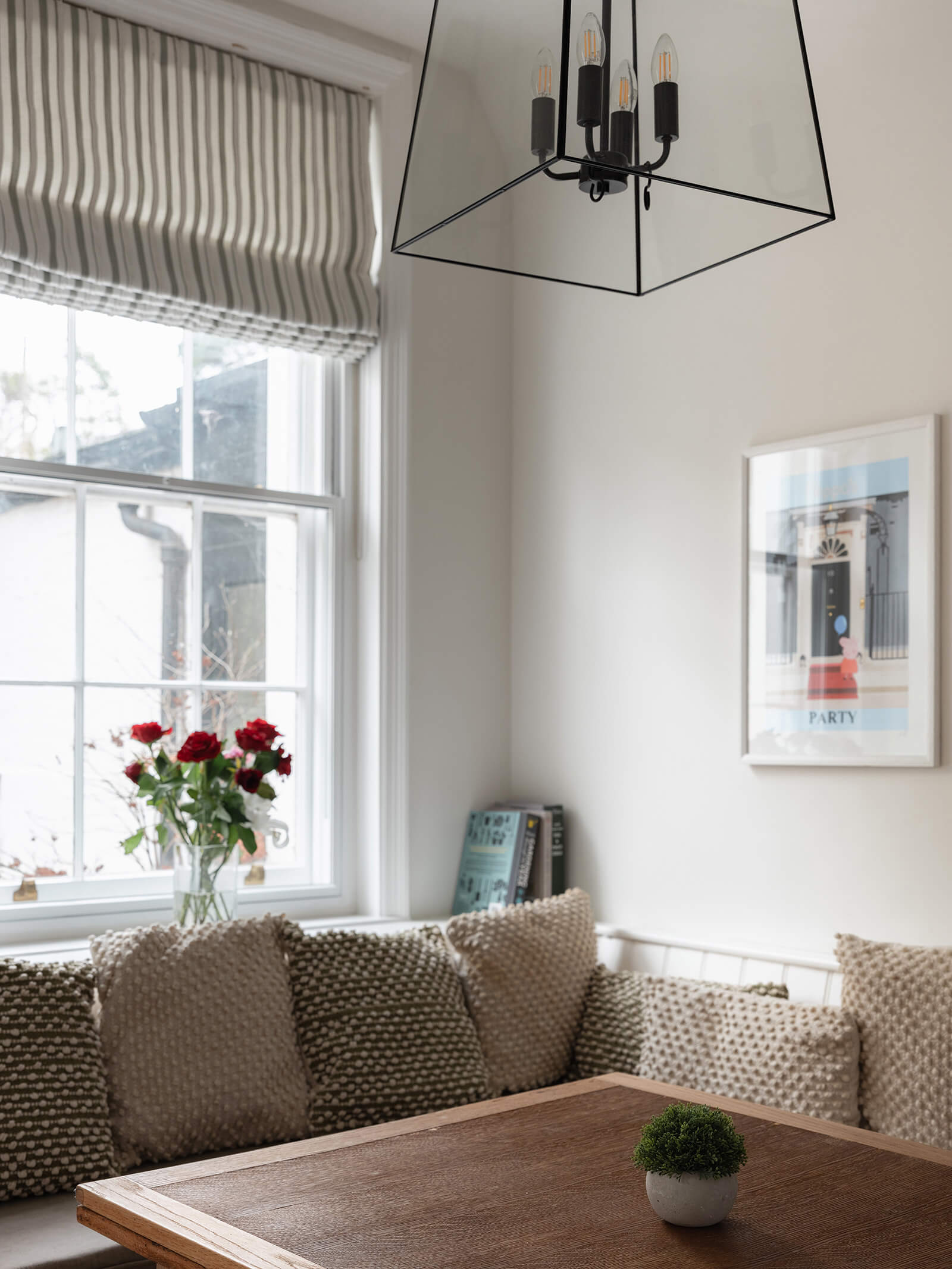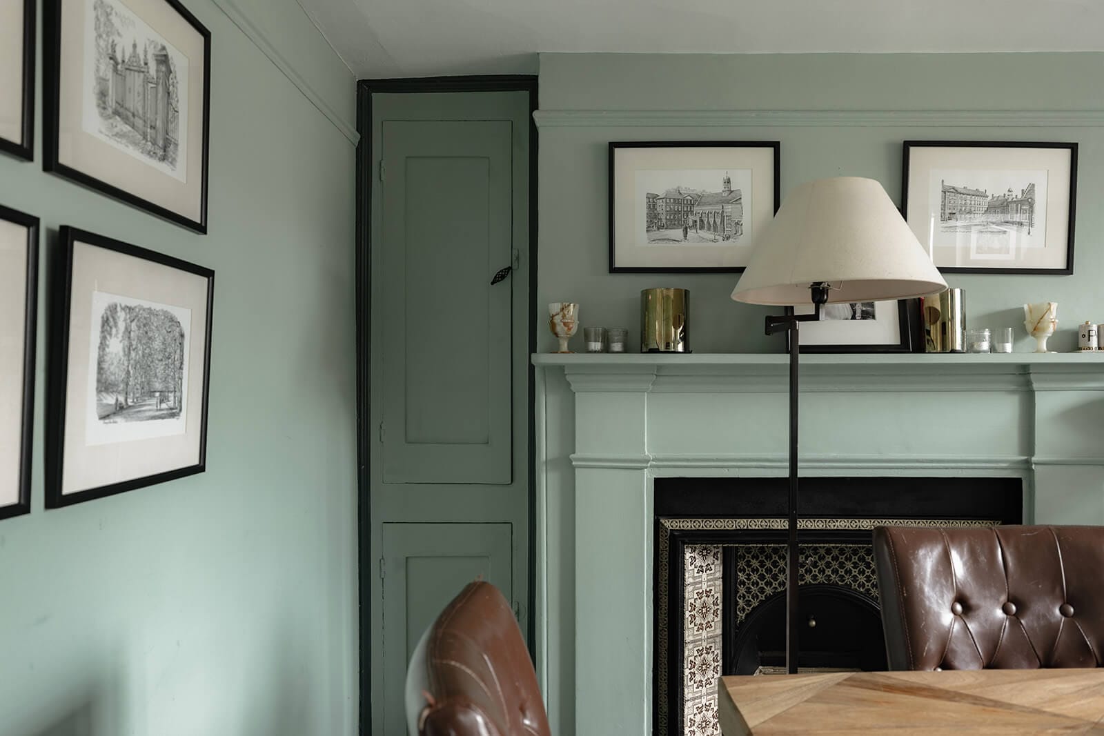 To the rear, the house shifts gently into a more relaxed register. The kitchen/breakfast room has been thoughtfully designed in a soft green Shaker style, topped with timber worktops and centred around an island illuminated by a trio of brushed brass pendants. A range cooker forms the practical heart of the room, while fitted bench seating creates an informal dining nook. The tall sash window once again retains its original shutters, while a door opens directly to the garden, reinforcing the easy dialogue between inside and out. Beyond, the family room – currently a playroom, later perhaps a television snug – offers yet another generous fireplace and a sense of comfort that feels entirely natural.