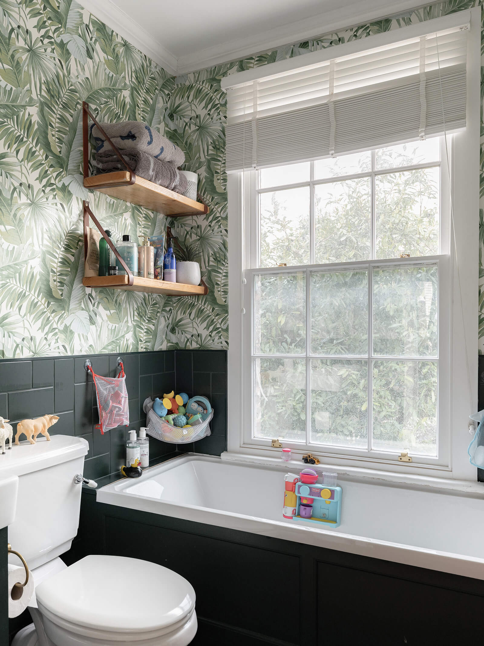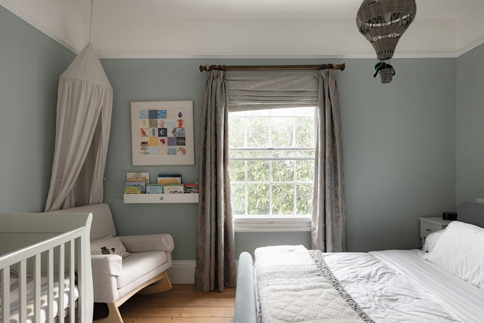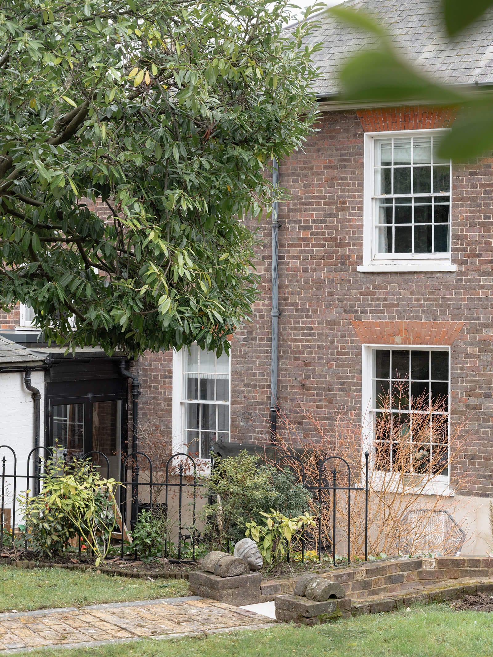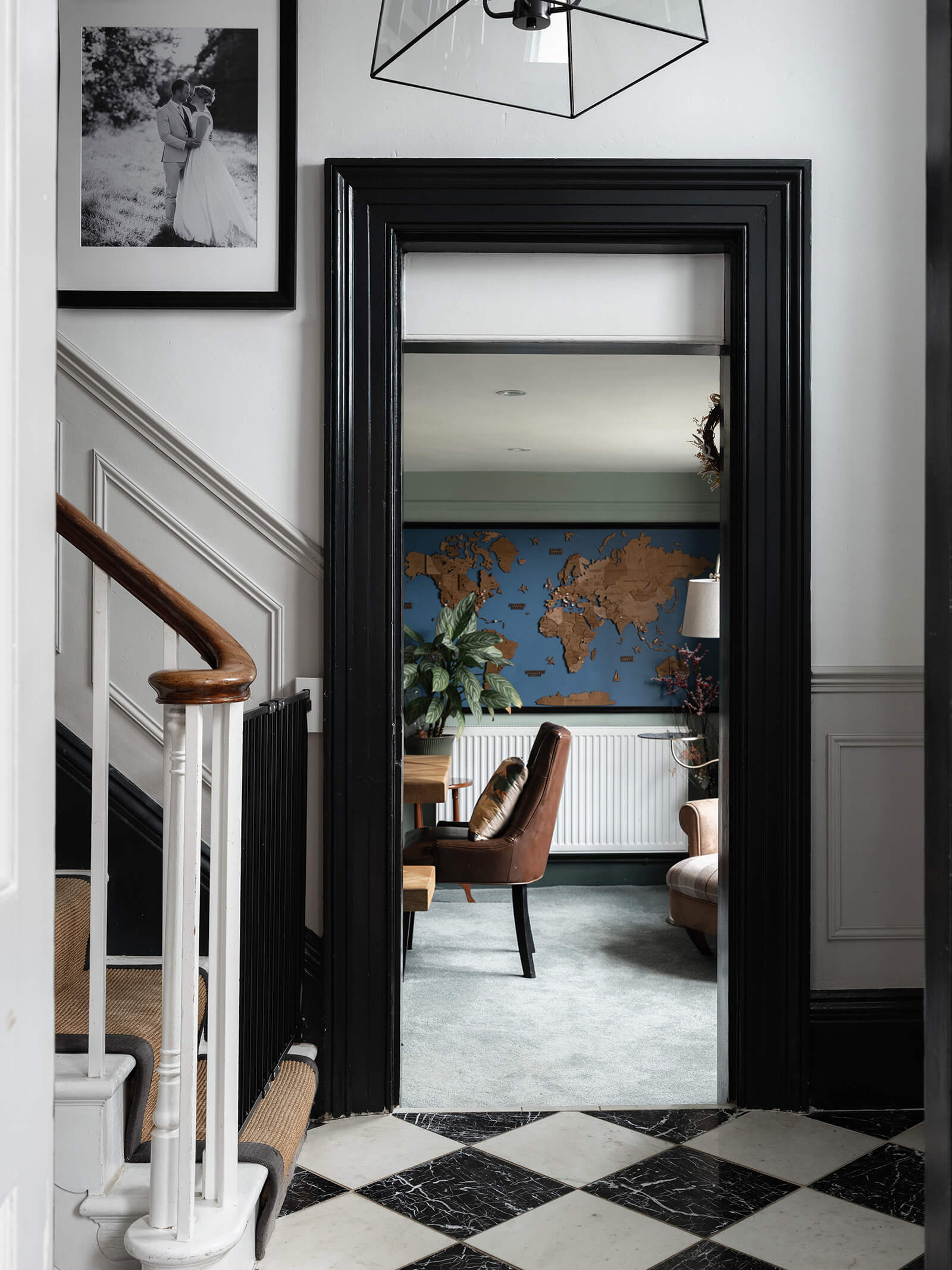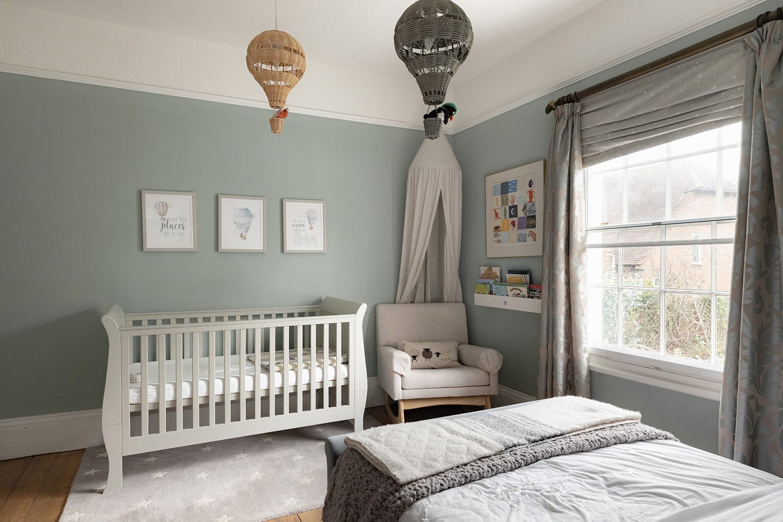 To the rear, the house shifts gently into a more relaxed register. The kitchen/breakfast room has been thoughtfully designed in a soft green Shaker style, topped with timber worktops and centred around an island illuminated by a trio of brushed brass pendants. A range cooker forms the practical heart of the room, while fitted bench seating creates an informal dining nook. The tall sash window once again retains its original shutters, while a door opens directly to the garden, reinforcing the easy dialogue between inside and out. Beyond, the family room – currently a playroom, later perhaps a television snug – offers yet another generous fireplace and a sense of comfort that feels entirely natural.