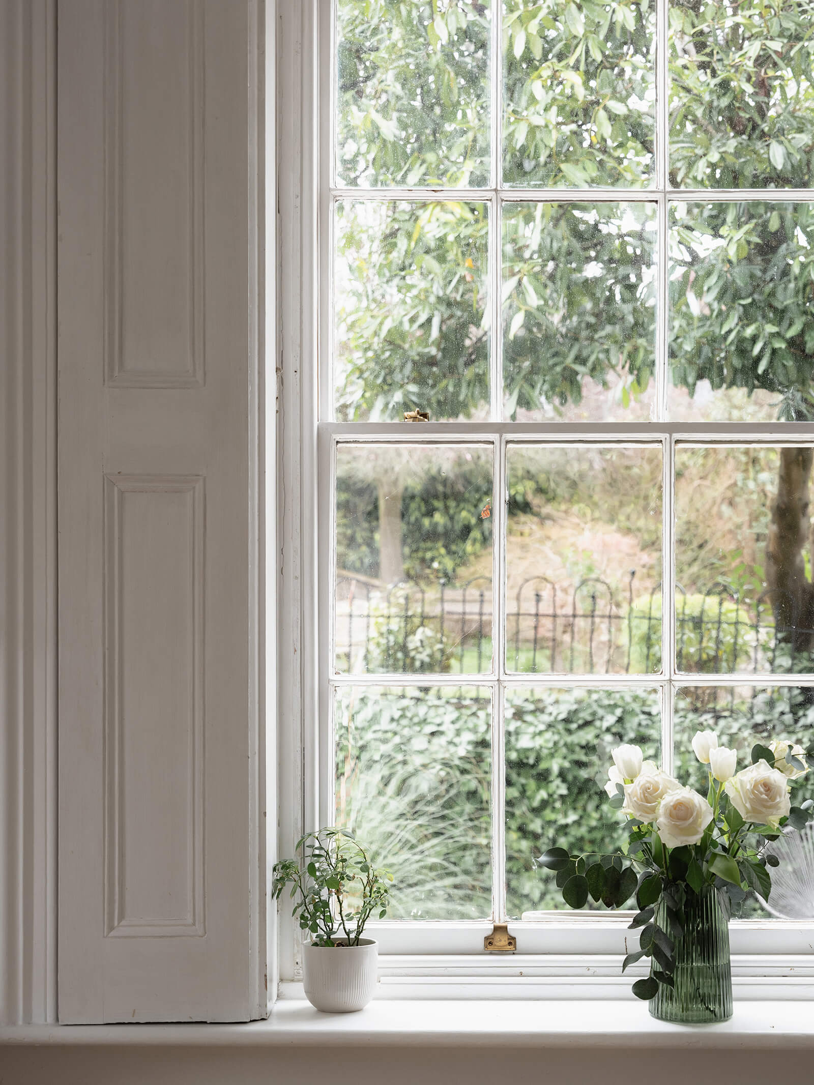 Constructed in the early 19th century in stone, dressed in white stucco with crisp white ashlar quoins, it stands as a fine example of Regency symmetry: square in form, balanced in elevation and crowned with a low-pitched slate hipped roof. A deep cornice casts a confident shadow line; timber sash windows sit across the facade. It is architecture designed not simply to impress, but to endure.