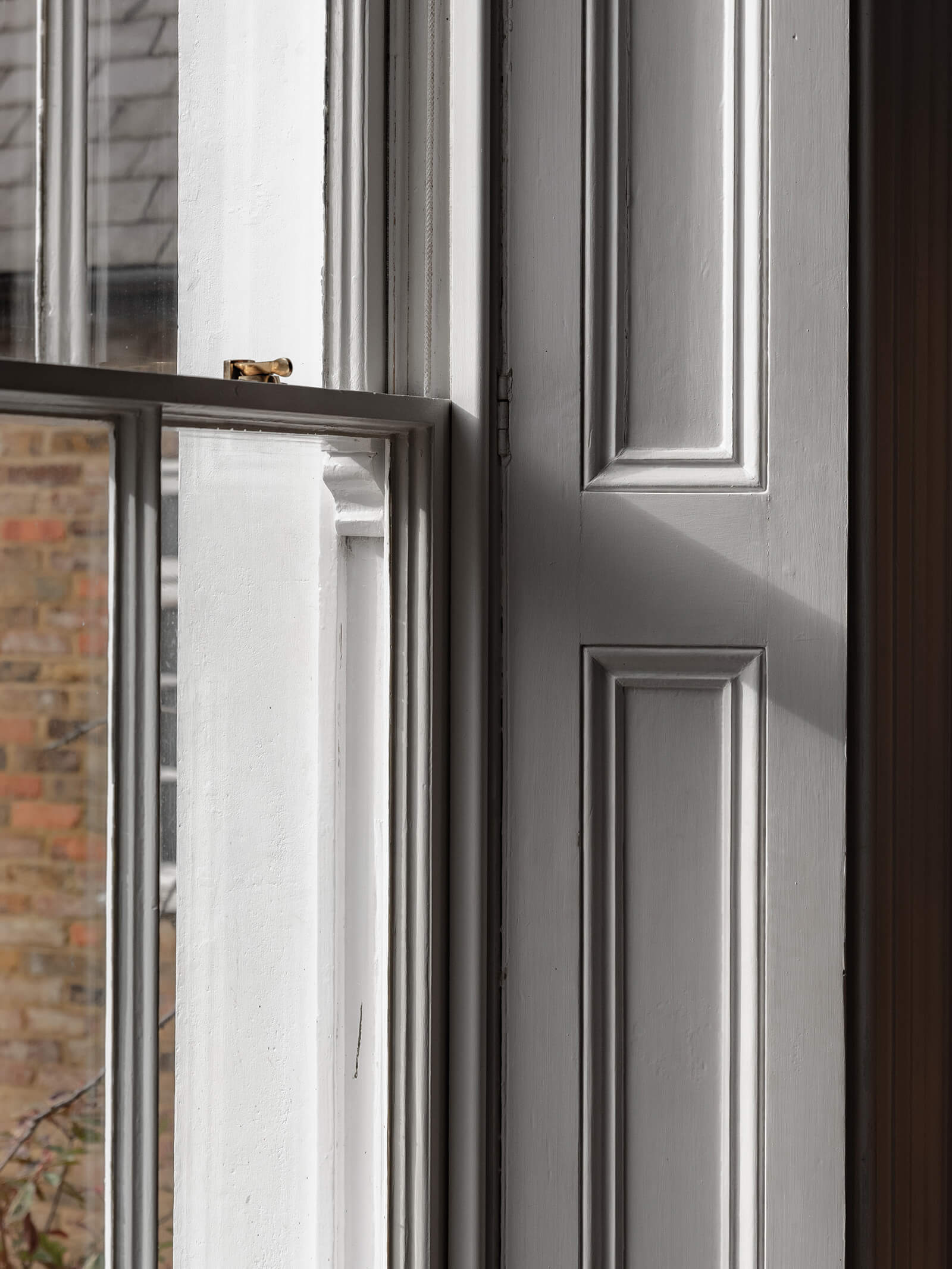 The sense of occasion begins the moment you step inside. The hallway is elegant yet welcoming, grounded by a striking black-and-white tiled floor. The original doorbell still rings – a small but quietly thrilling detail. Ahead, the staircase rises with its original balustrade and hardwood handrail, worn smooth by generations of hands. To one side lies the principal sitting room, with its tall sash window and working shutters, attractive fireplace with wood-burner, and bespoke bookcase cabinetry flanking the chimney breast. It is a room of beautiful Regency proportion: light-filled, calm and composed. Opposite, the dining room occupies the oldest part of the building, pre-dating the Regency villa itself. Here, a full-height bay window with glazed double doors opens onto the front garden, and another fireplace anchors the space, lending it a sense of quiet ceremony.