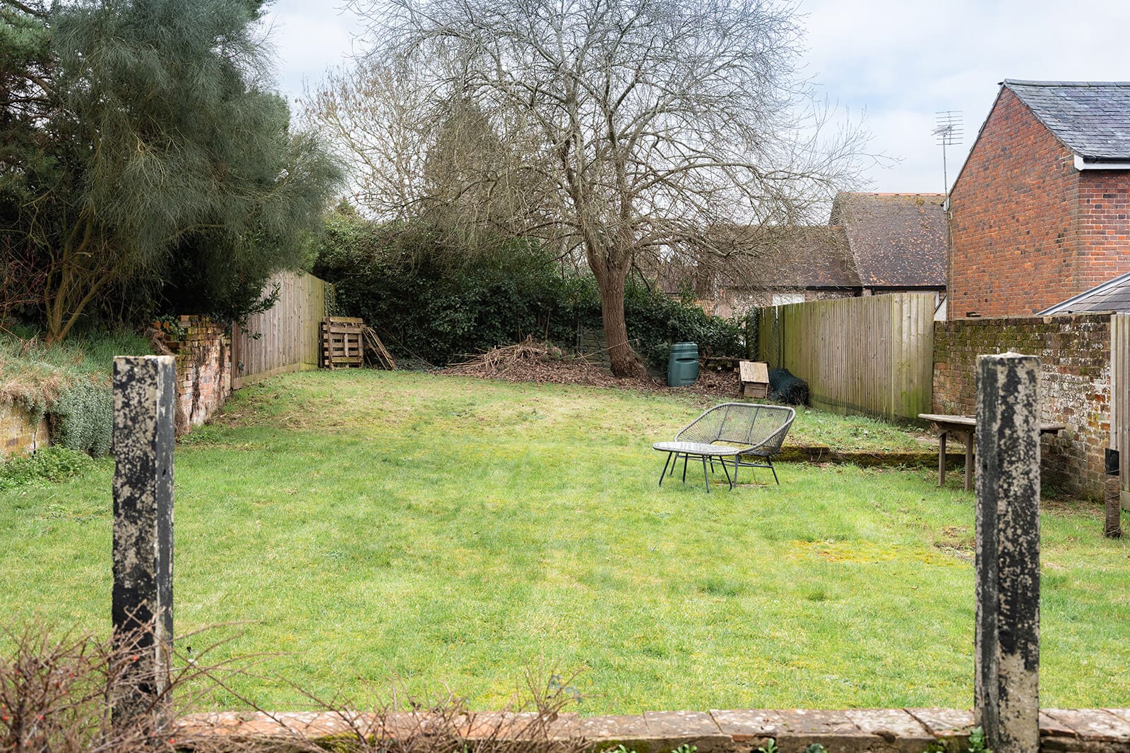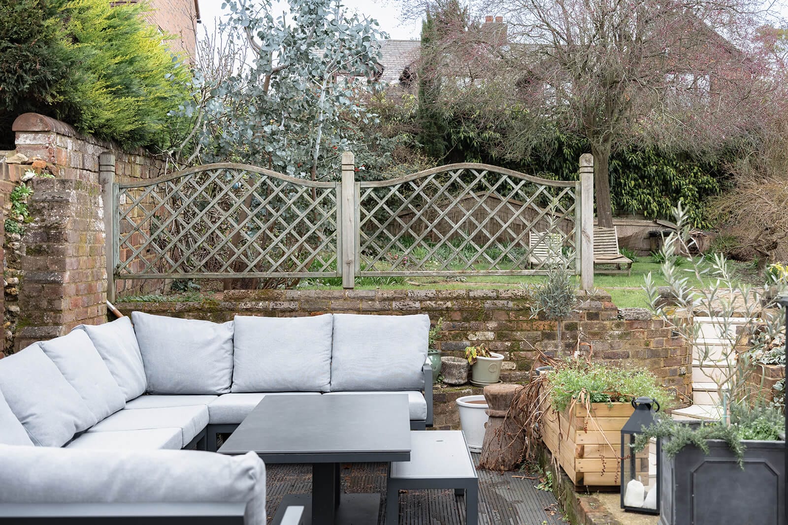 Outside, the gardens wrap generously around the side and rear of the house before extending in an L-shape behind neighbouring properties, creating a series of outdoor rooms. A terrace invites al fresco dining, a raised deck captures summer evenings, a bark-chipped play area provides informal fun, and steps lead up to a further lawned area with a water feature and elevated seating. It is a sequence of spaces that reward exploration and quietly extend the living areas of the house.