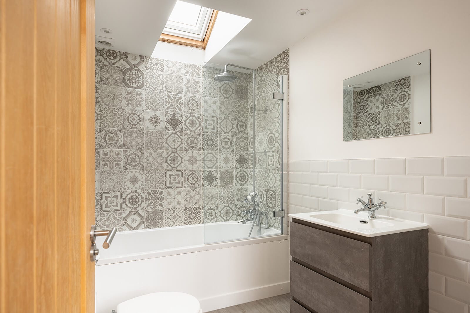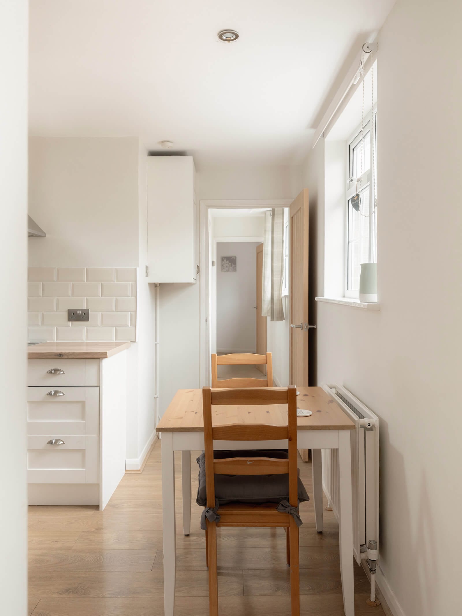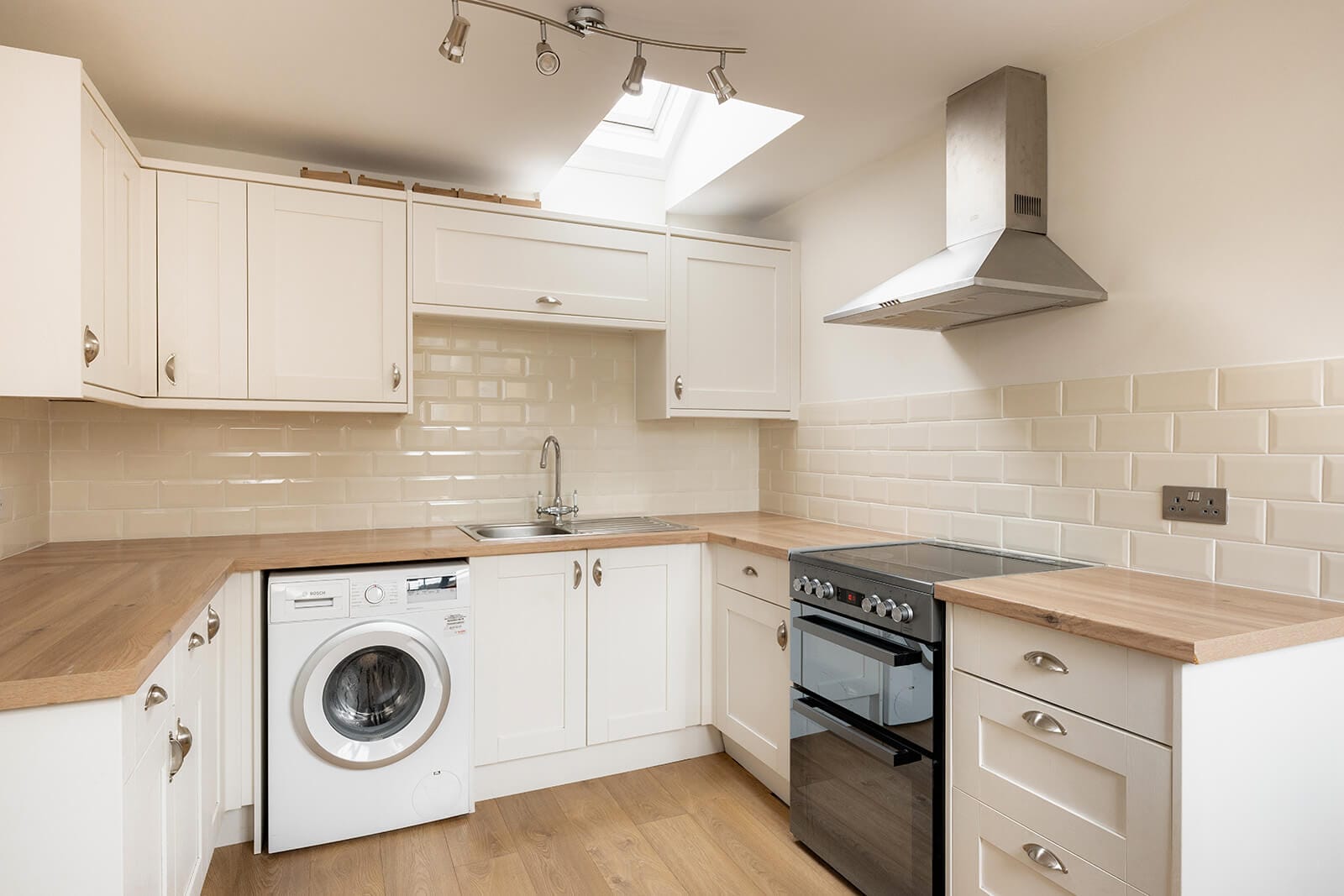 Upstairs, an attractive sitting room occupies one end of the house, with a centrally positioned kitchen/dining room forming the heart of the plan. Contemporary in feel, the kitchen is fitted with cream cabinetry and wood-effect worktops, with space for a table and chairs. The bathroom is smartly finished, with patterned tiles adding character and texture, while the second double bedroom sits at the far end of the floor. Skylights to both the kitchen and bathroom draw natural light deep into the house.