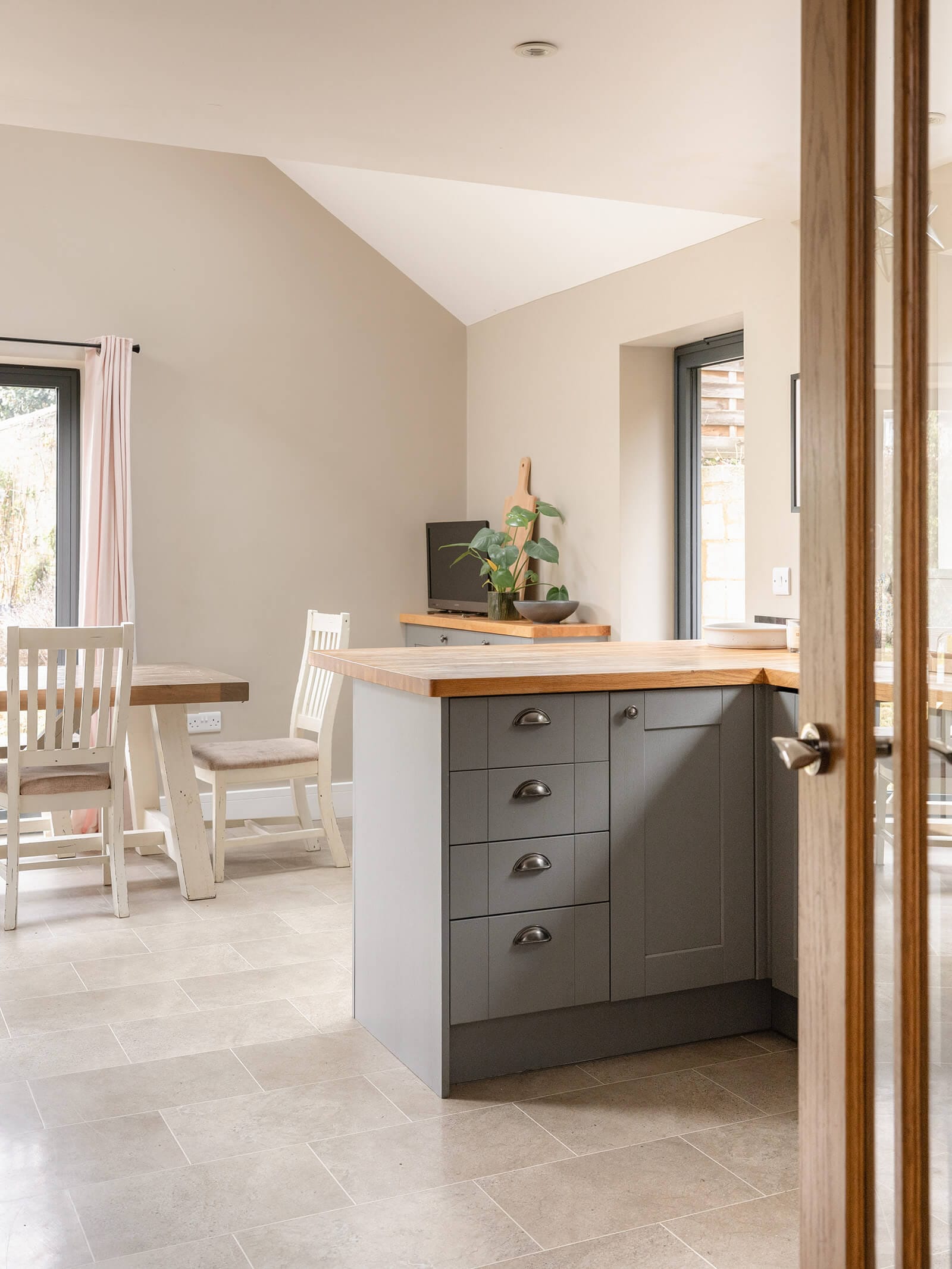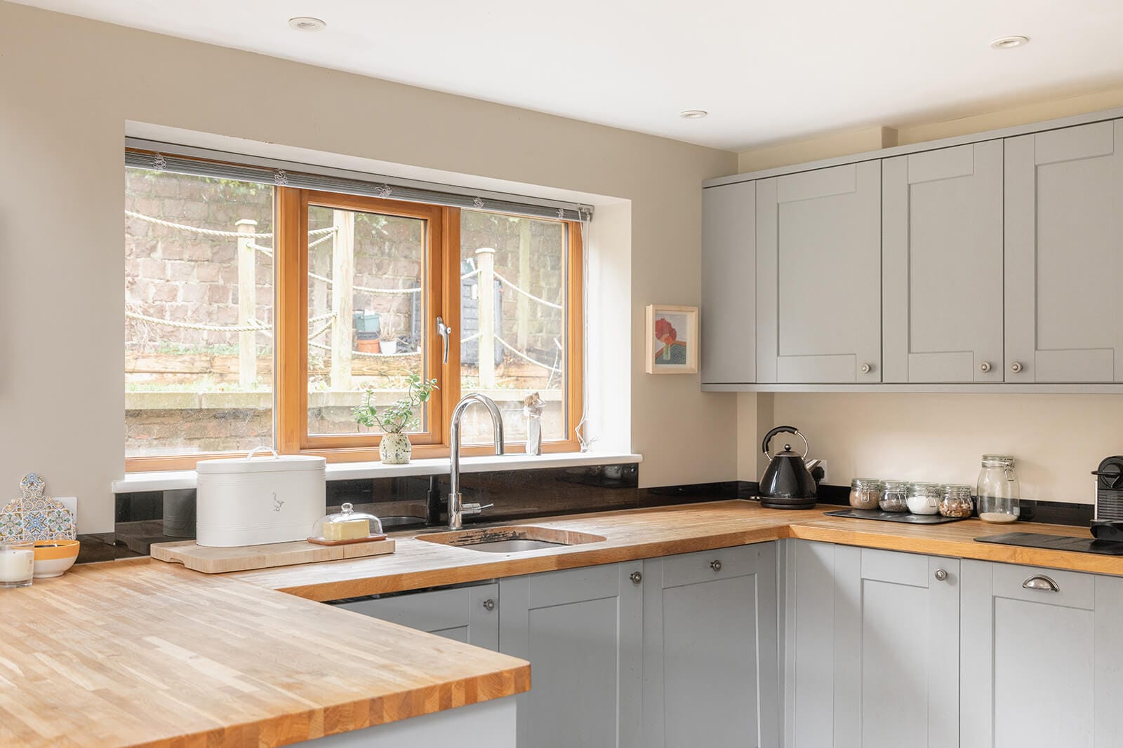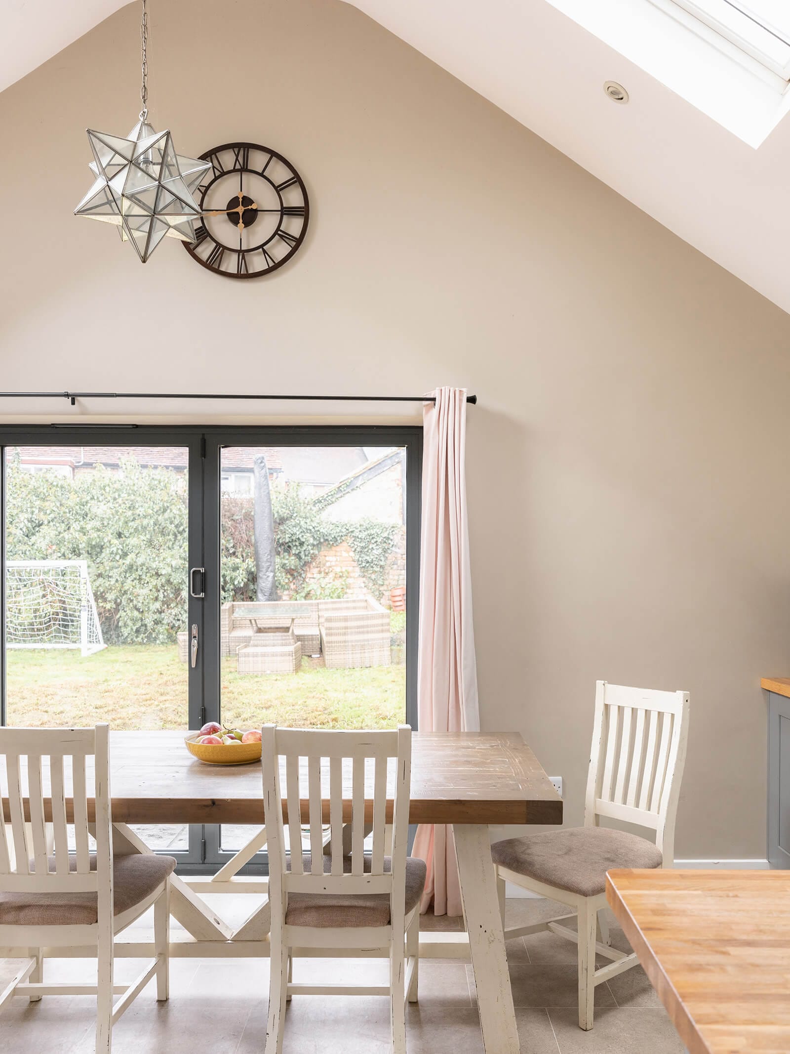 The heart of the house, however, is the kitchen and dining room: a beautifully executed, triple-aspect space designed for both everyday living and entertaining. Shaker-style cabinetry in a soft mid-grey is paired with oak worktops in a warm, honeyed tone, alongside a black range cooker. Above the dining area, a vaulted ceiling and twin rooflights enhance the sense of volume and light, while bifold doors open directly onto the main garden, gently blurring the boundary between inside and out. A modern cloakroom completes the ground floor accommodation, and high-quality oak doors throughout reinforce the home’s considered materiality.
