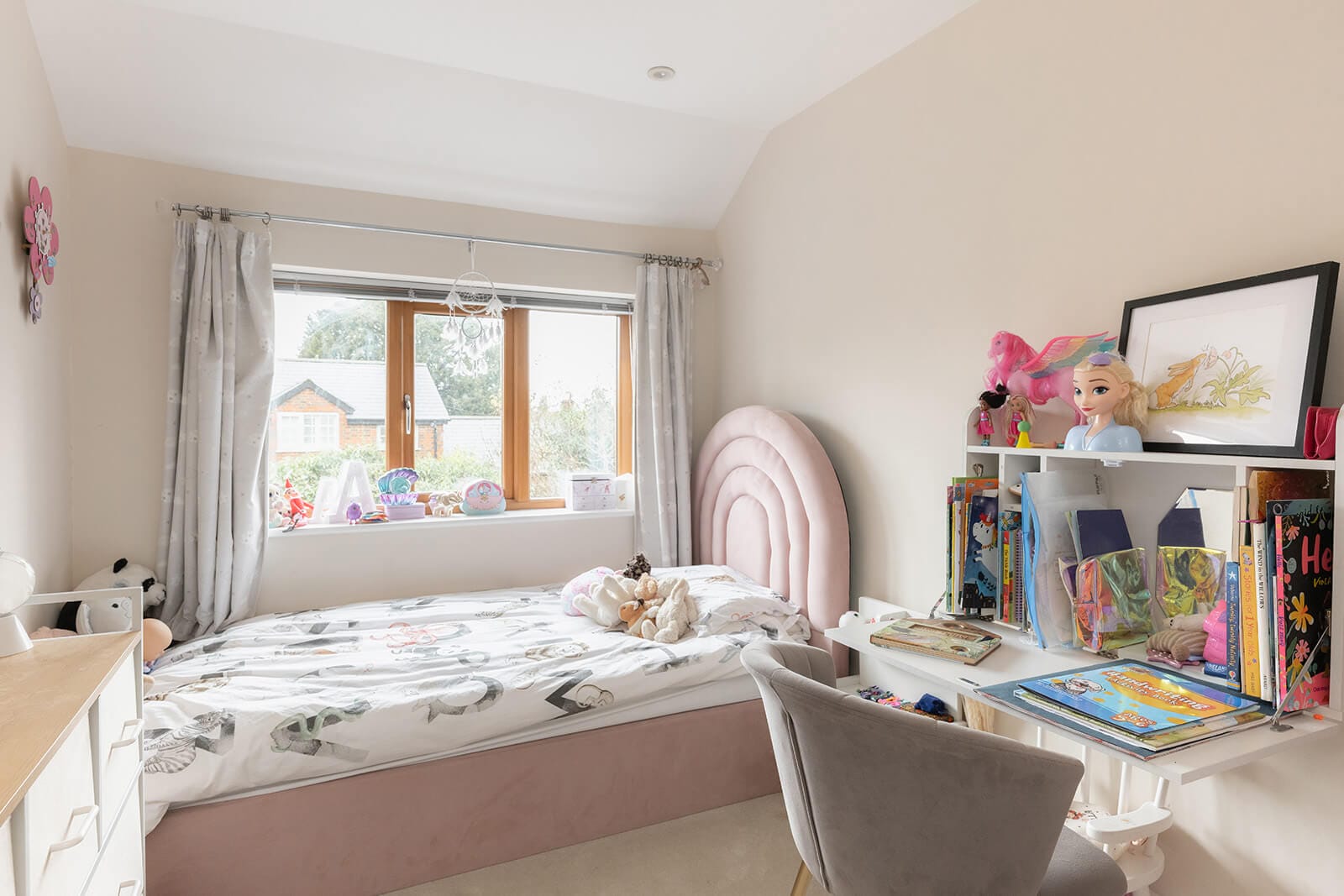 Externally, the gardens wrap around the house, creating a series of distinct yet connected outdoor spaces. The main garden is laid to lawn, complemented by a generous L-shaped terrace ideal for outdoor dining and entertaining, along with a designated area for children’s play. To the rear of the house, a secondary garden space offers a more secluded retreat. At the front, a gated driveway provides off-street parking, and the property’s position at the end of the drive ensures a peaceful, low-traffic environment.