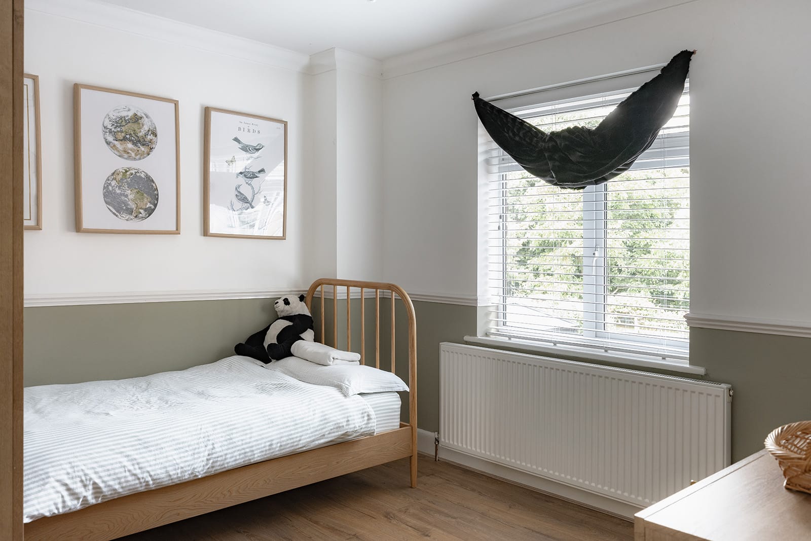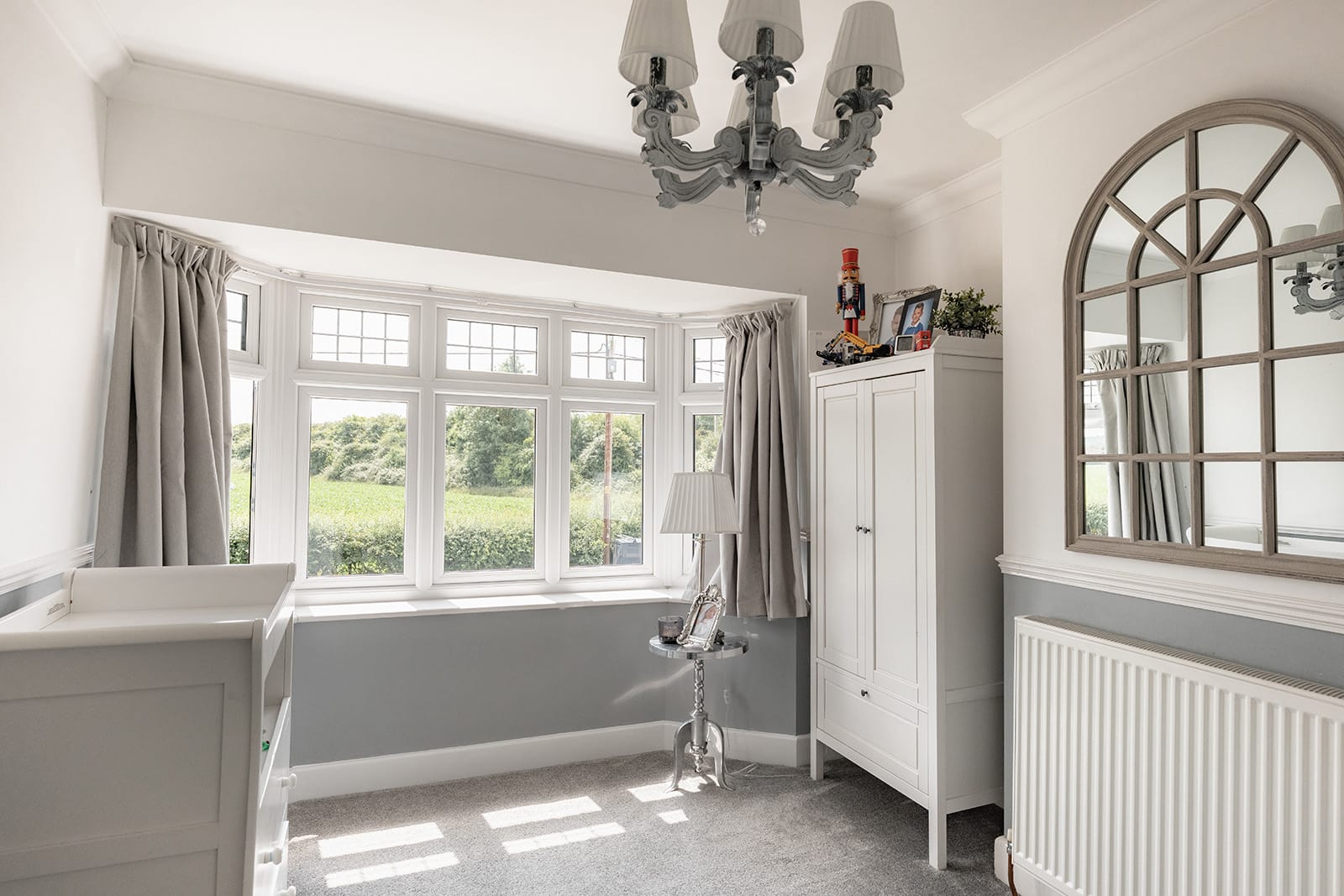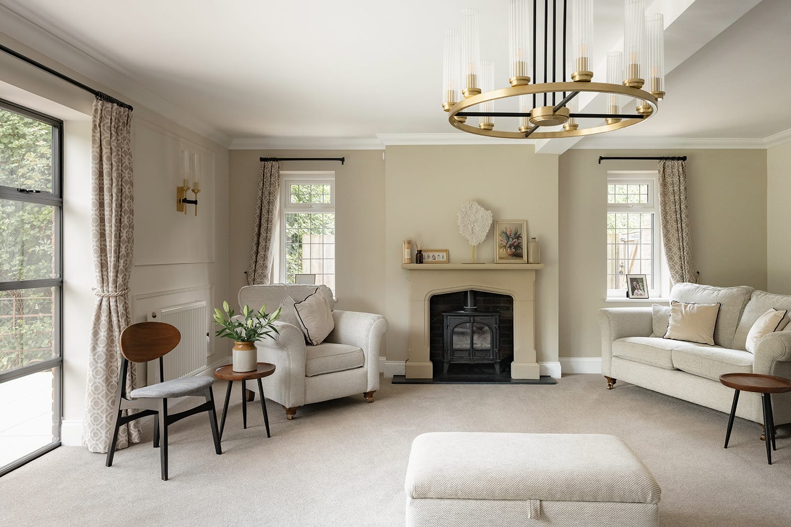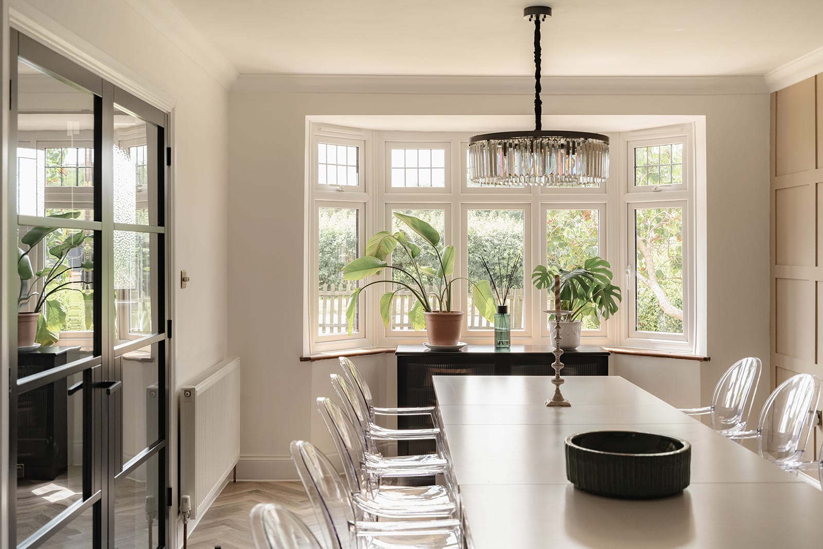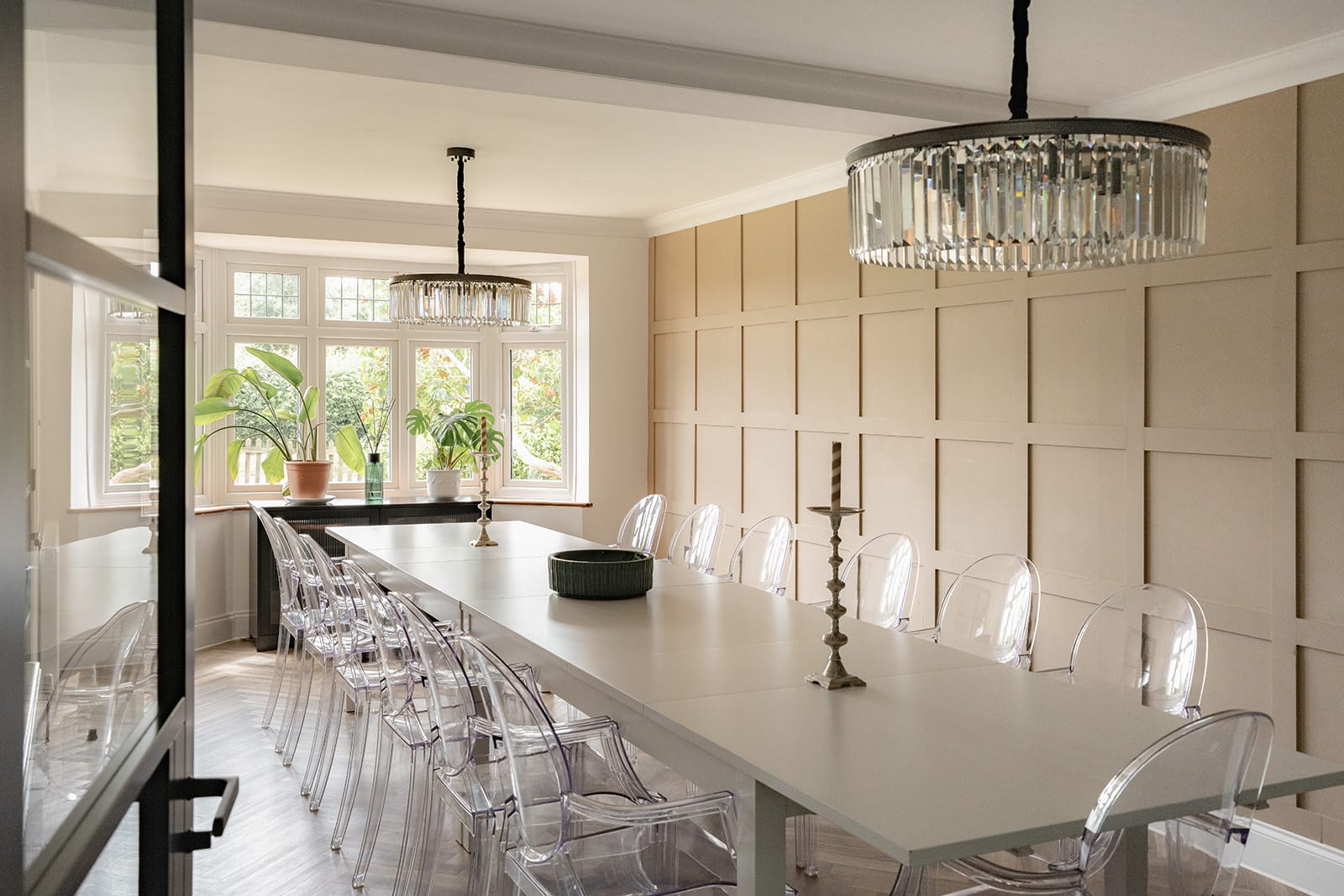 To the front, the formal dining room sets the tone for elegant hosting. A panelled feature wall adds depth and texture, while a bay window draws in natural light. A fitted drinks cabinet, including sink and wine fridge, offers a nod to candlelit indulgence, without ever losing its sense of refinement.