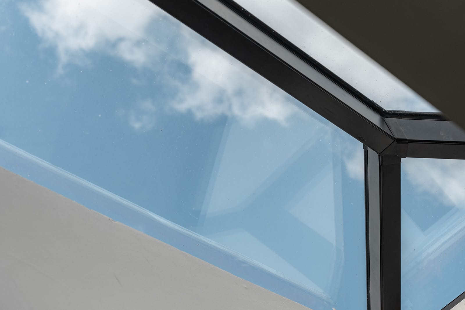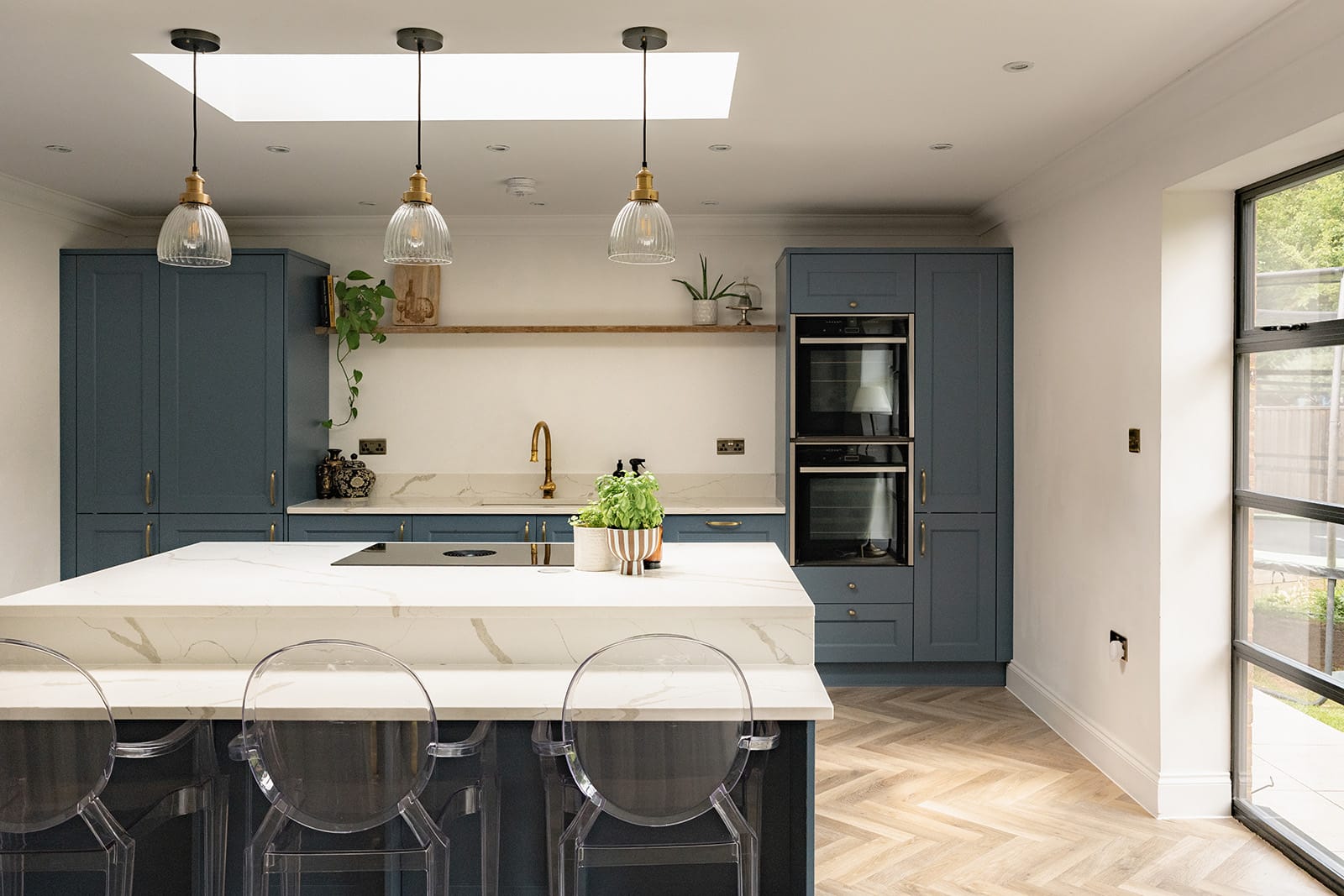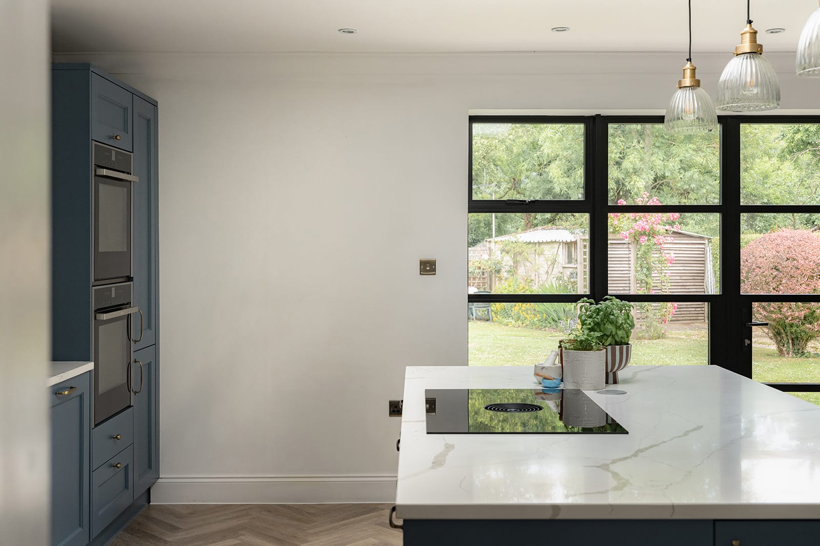 To the rear, the heart of the home unfolds in the expansive kitchen and breakfast room. At its centre, a beautifully appointed kitchen, crafted around calacatta quartz worktops, offers both form and function, with a suite of premium appliances including a Bora induction hob with integral extraction, Neff ovens and a Perrin & Rowe aged brass tap over a traditional butler’s sink. A huge central island anchors the space, drenched in light thanks to an atrium roof positioned above. Another set of black metal glazed double doors connects the space to the garden, drawing the outside in. Just off the kitchen, a separate utility room adds considered practicality.