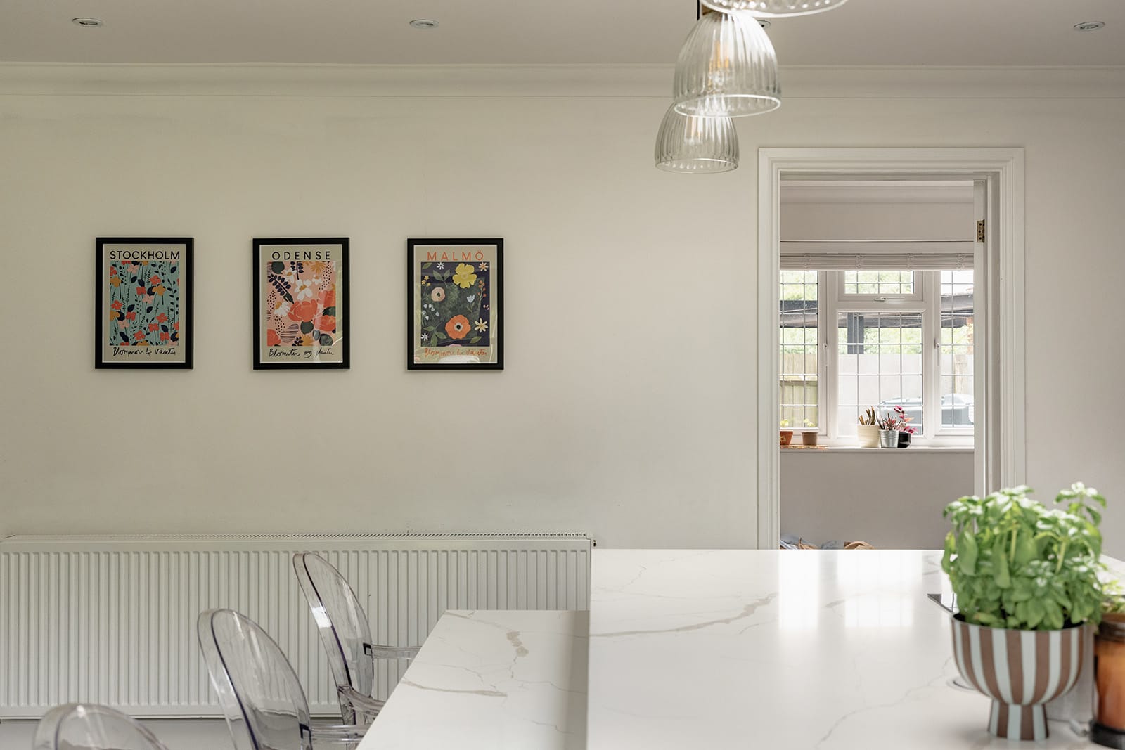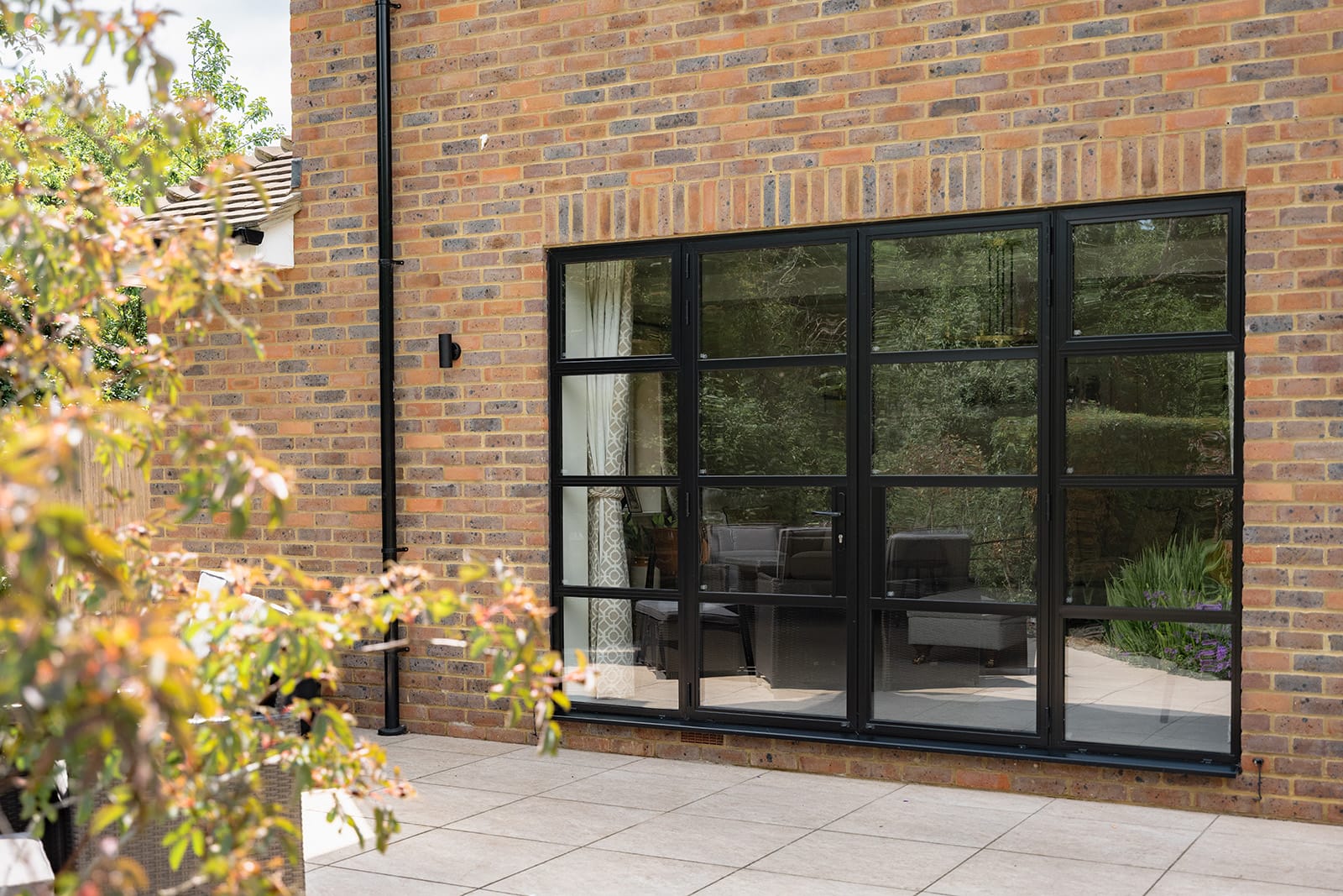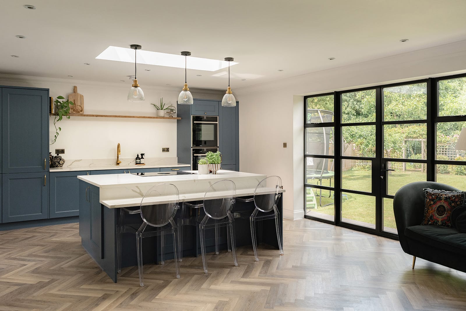 From the moment you enter, the attention to detail is immediately apparent. The crisp geometry of the Karndean herringbone flooring leads through a broad, welcoming hallway, where eye-catching black metal glazed double doors mark each threshold with an architectural flourish.