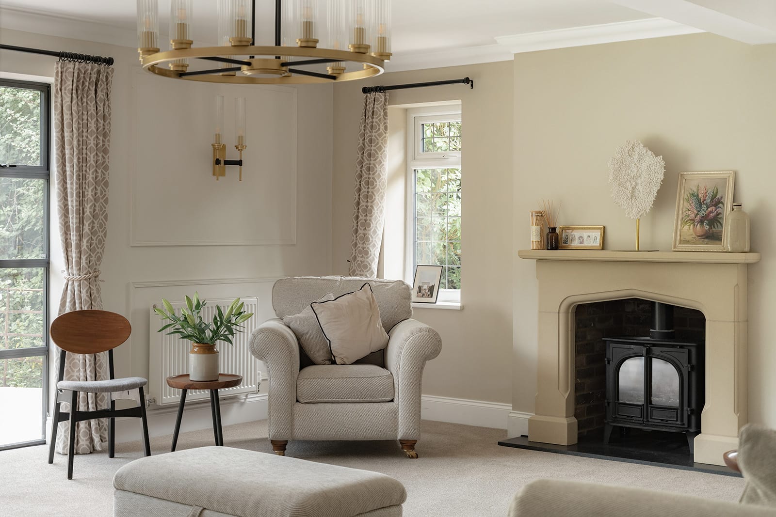Sophisticated sitting room with stone fireplace and wood-burning stove