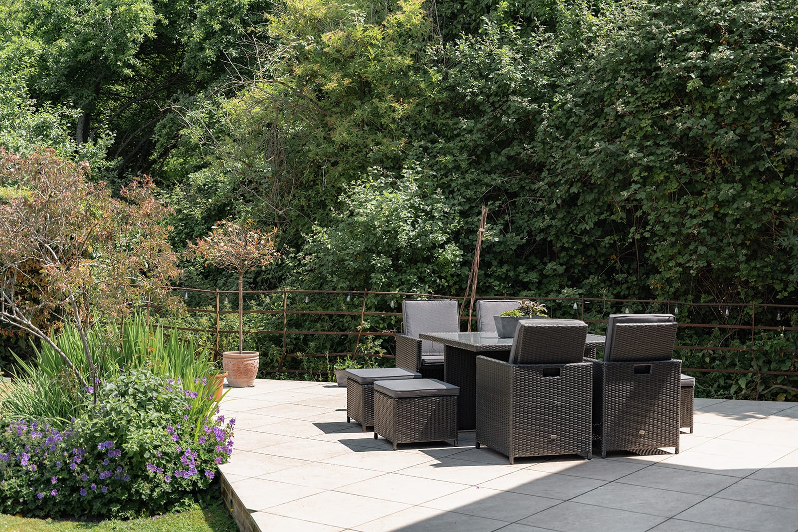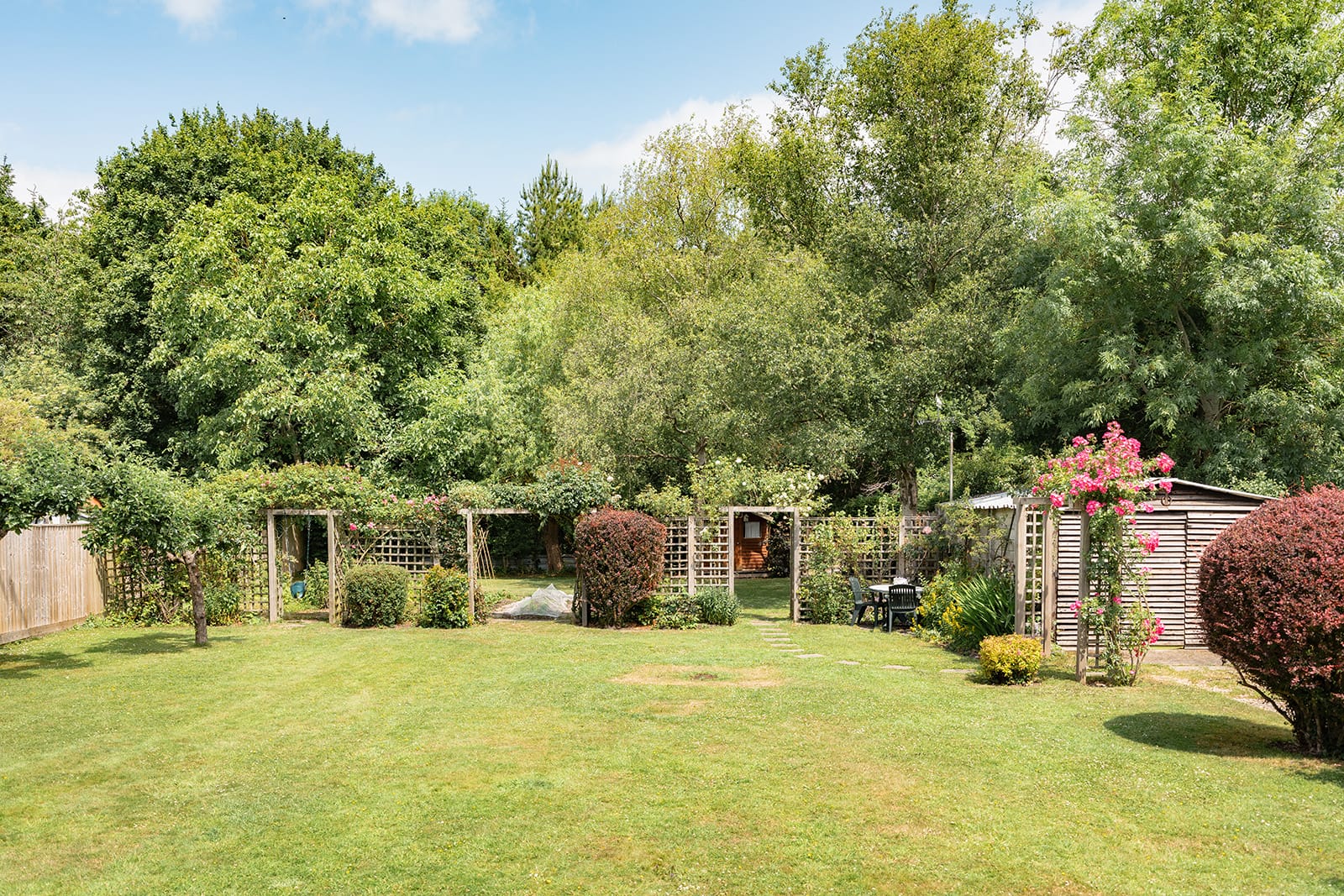Externally, the rear garden extends some 120ft and offers a gentle continuation of the home’s ethos: open, mature and quietly productive. A large lawn is edged by established planting and a well-tended vegetable patch, while a stone patio provides the ideal backdrop for summer evenings. To the front, a traditional five-bar gate opens to a gravelled driveway with ample space for multiple vehicles and access to the oversized integral garage. In all, the plot measures approximately a third-acre.