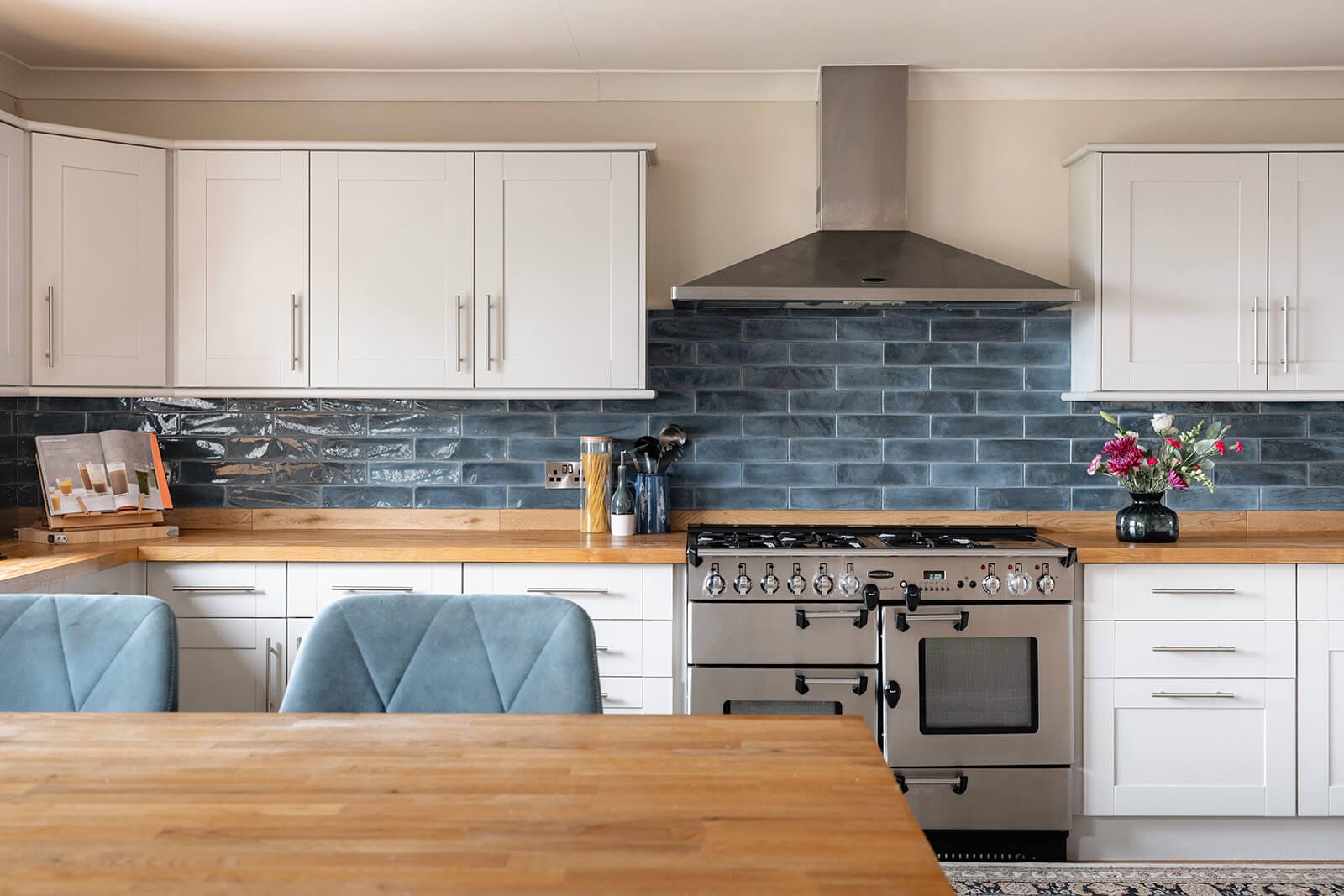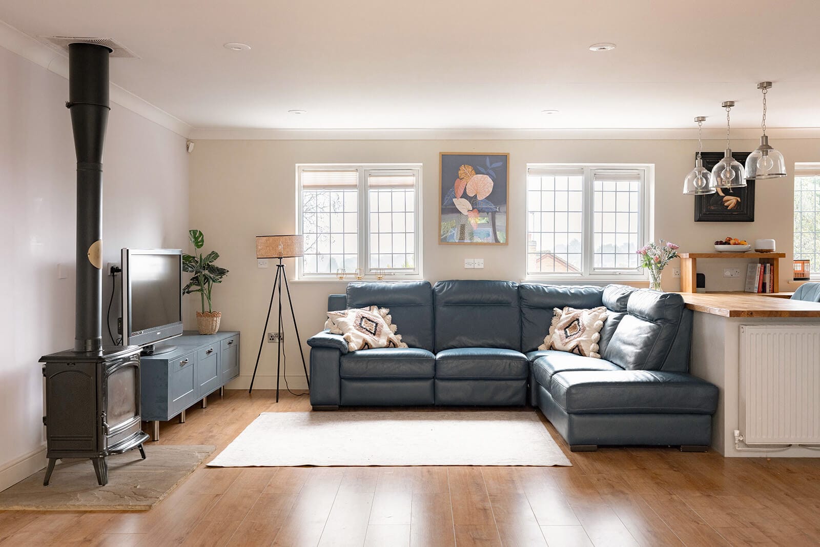 Stairs rise to the upper ground floor where the heart of the home unfolds: a generous open-plan kitchen, dining and family space which is both light-filled and expansive. The kitchen centres around a large breakfast bar and includes integrated appliances such as a double oven, fridge-freezer and dishwasher. A wood-burning stove in the dining area lends a warm, convivial atmosphere.