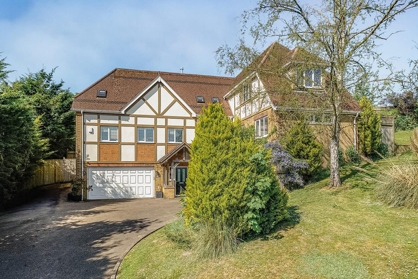 Externally, the rear garden is private and enclosed and extends some 90ft, with mature planting, lawned areas and a raised terrace for outdoor dining. A timber summer house and productive vegetable garden with fruit trees sit to the rear. The gated driveway at the front provides parking for several cars and access to the integral double garage, alongside a further area of lawn. In all, the property enjoys a plot of approximately 0.4 acre.
