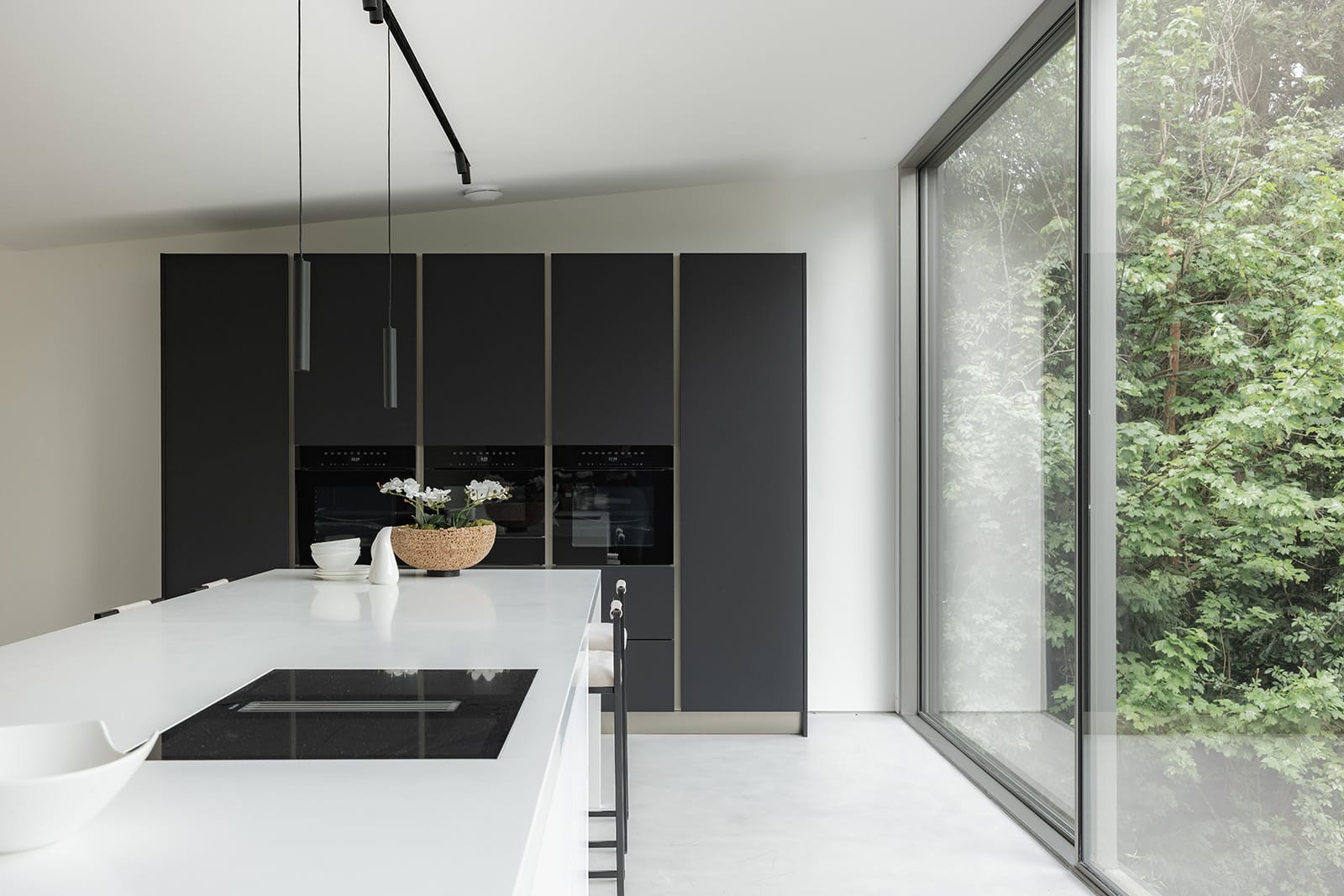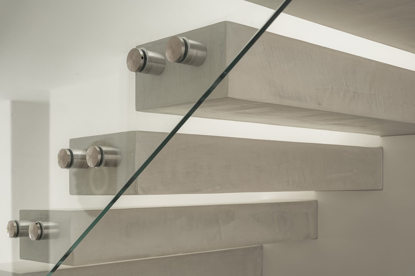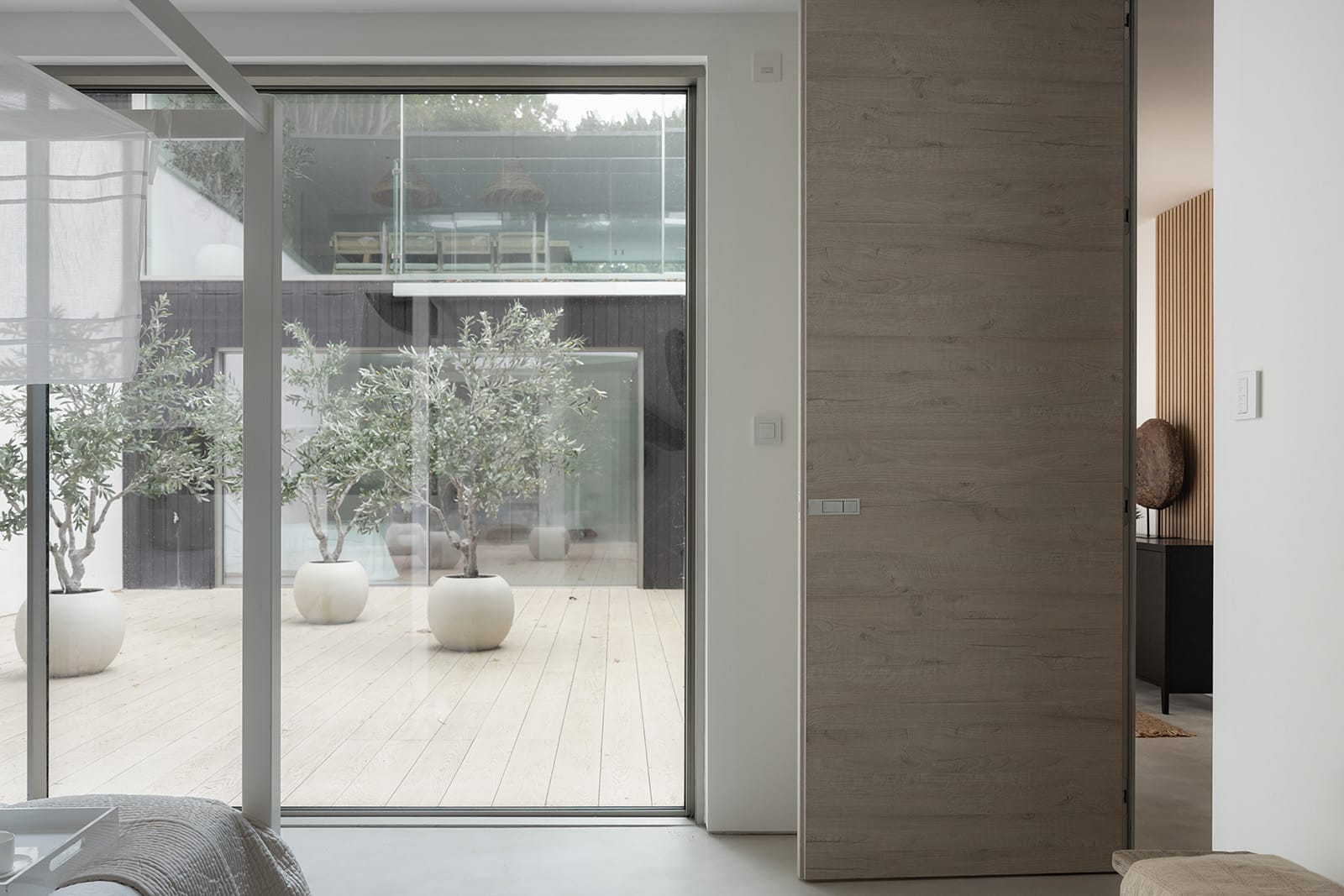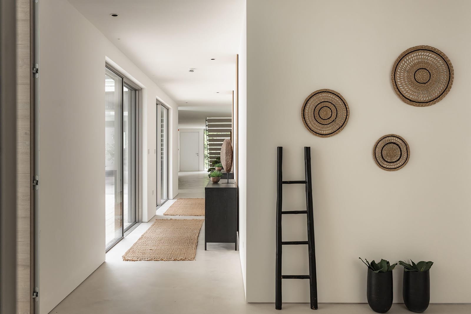 On entering, a sense of stillness and spatial clarity prevails. A light-filled hallway is framed by a floating staircase — an architectural centrepiece — while full-height doors by Garofoli with flush detailing allow spaces to flow seamlessly. Floors are finished in a continuous microcement surface extending into bathrooms and shower rooms to lend a calm material coherence throughout.