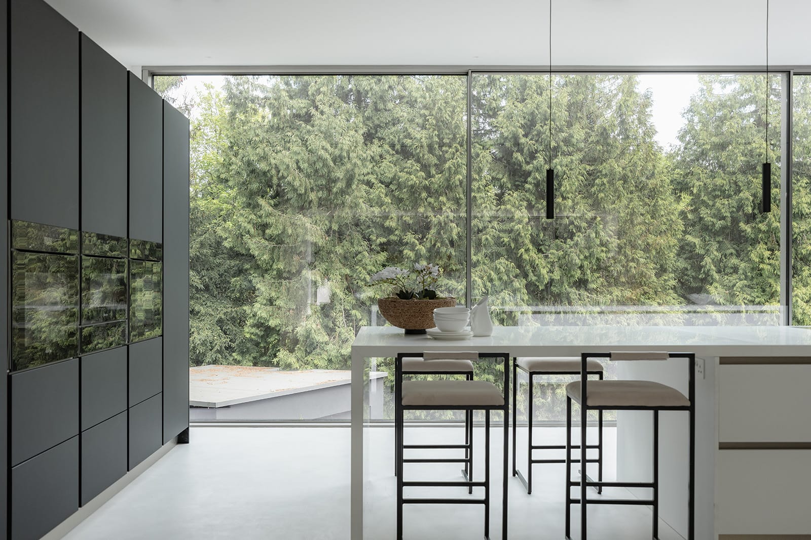Ascending the main floating staircase, the upper level opens into a spectacular, vaulted living, dining and kitchen space beneath a butterfly roof. Full-height windows at either end drench the room with light and frame leafy vistas beyond. The bespoke kitchen by Veneta Cucine is a masterclass in quiet luxury, with integrated Miele appliances, Italian stone worktops, and a Quooker tap providing both form and function. Sliding glass doors extend the space onto a wide, elevated terrace: an ideal setting for al fresco dining and long summer evenings.
