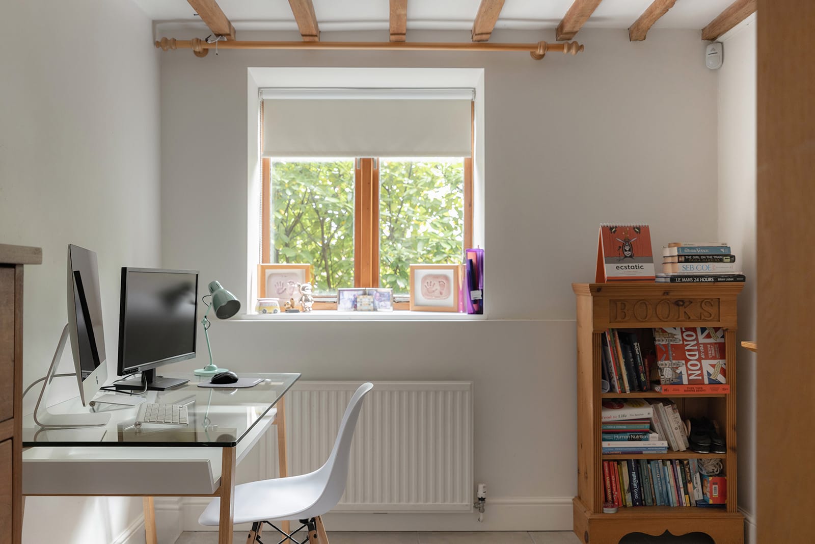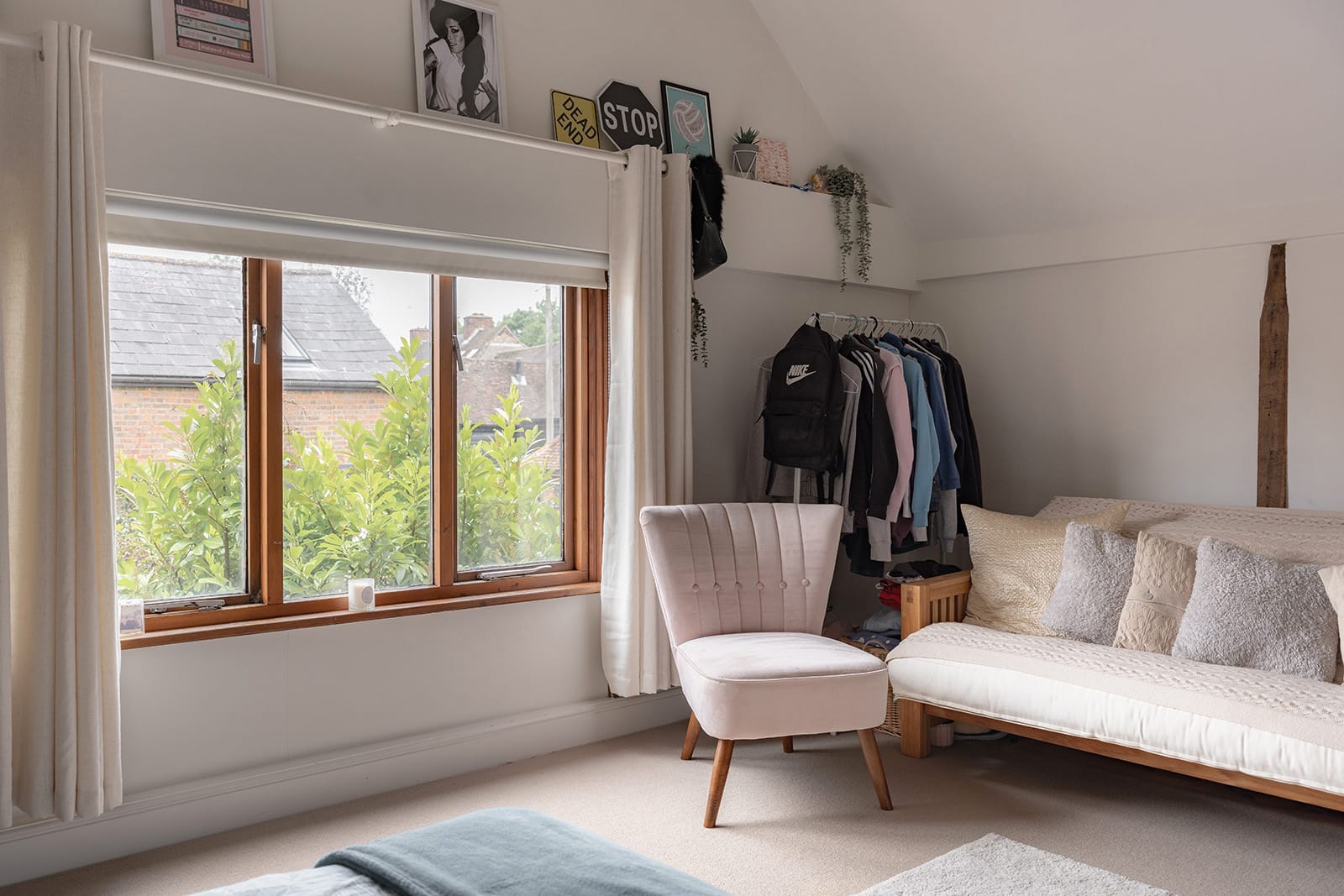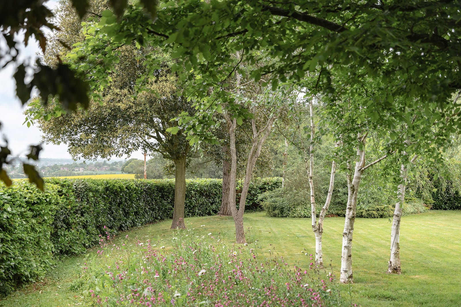 Outside, the garden is a masterstroke in layered design. Clipped yews define the formal lawn, which gives way to a looser, more natural landscape with mature trees and uninterrupted views across open countryside. The total plot extends to approximately 0.3 acre, with the rear gardens stretching to around 170ft. To the front, there is parking for up to four cars, along with a boiler room and an oversized garage that also serves as a workshop; ideal for storage, projects, or creativity in motion.